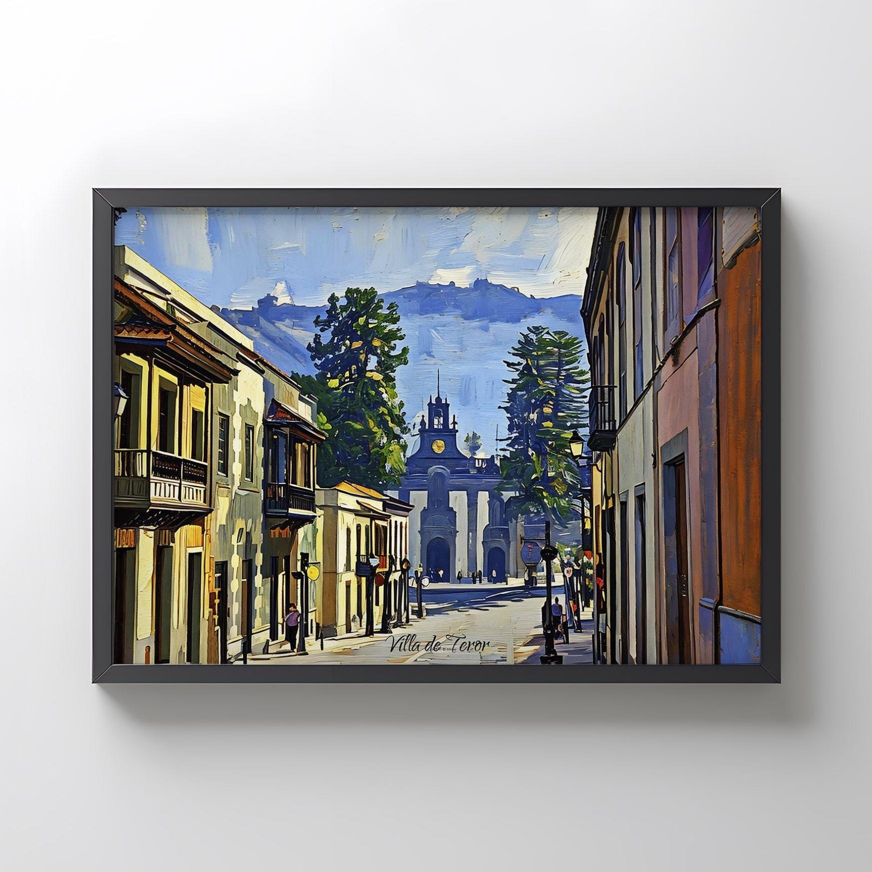 This artwork portrays the historic streets of Villa de Teror, one of the most traditional towns in Gran Canaria. The view leads toward the Basilica of Nuestra Señora del Pino, an important landmark and spiritual center of the island.