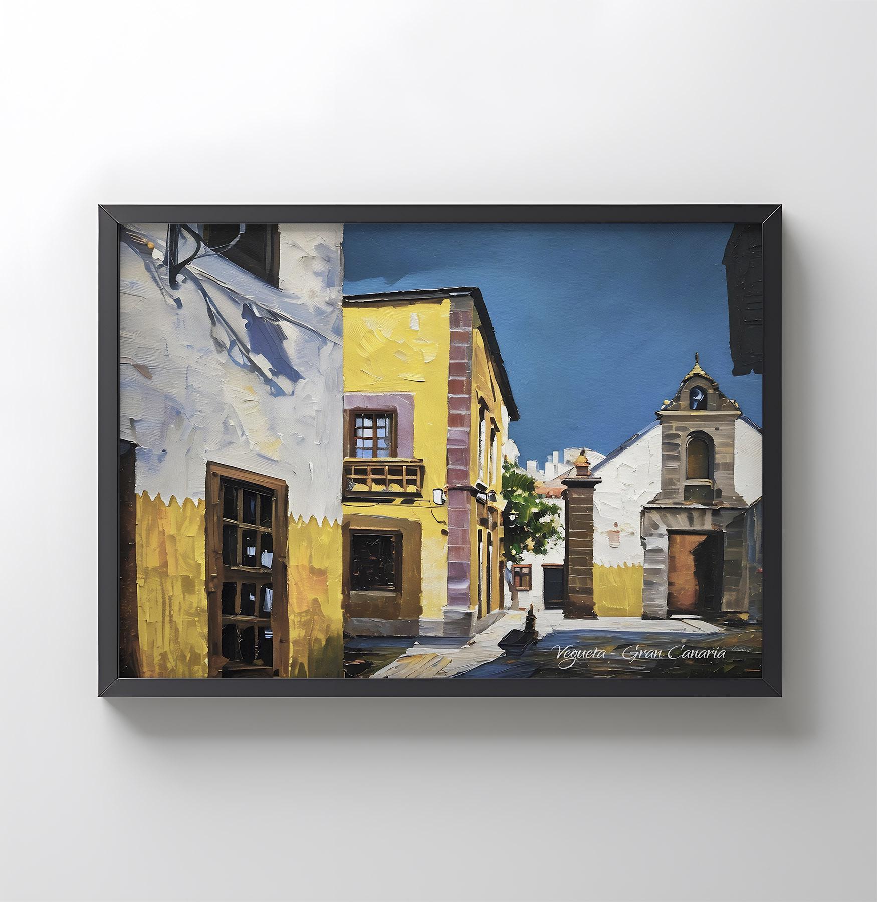 This artwork portrays a quiet corner of Vegueta, the historic district where the city of Las Palmas de Gran Canaria was founded in 1478. The traditional houses, narrow streets and small chapels reflect the origins of the city and the early Spanish presence in the Canary Islands.