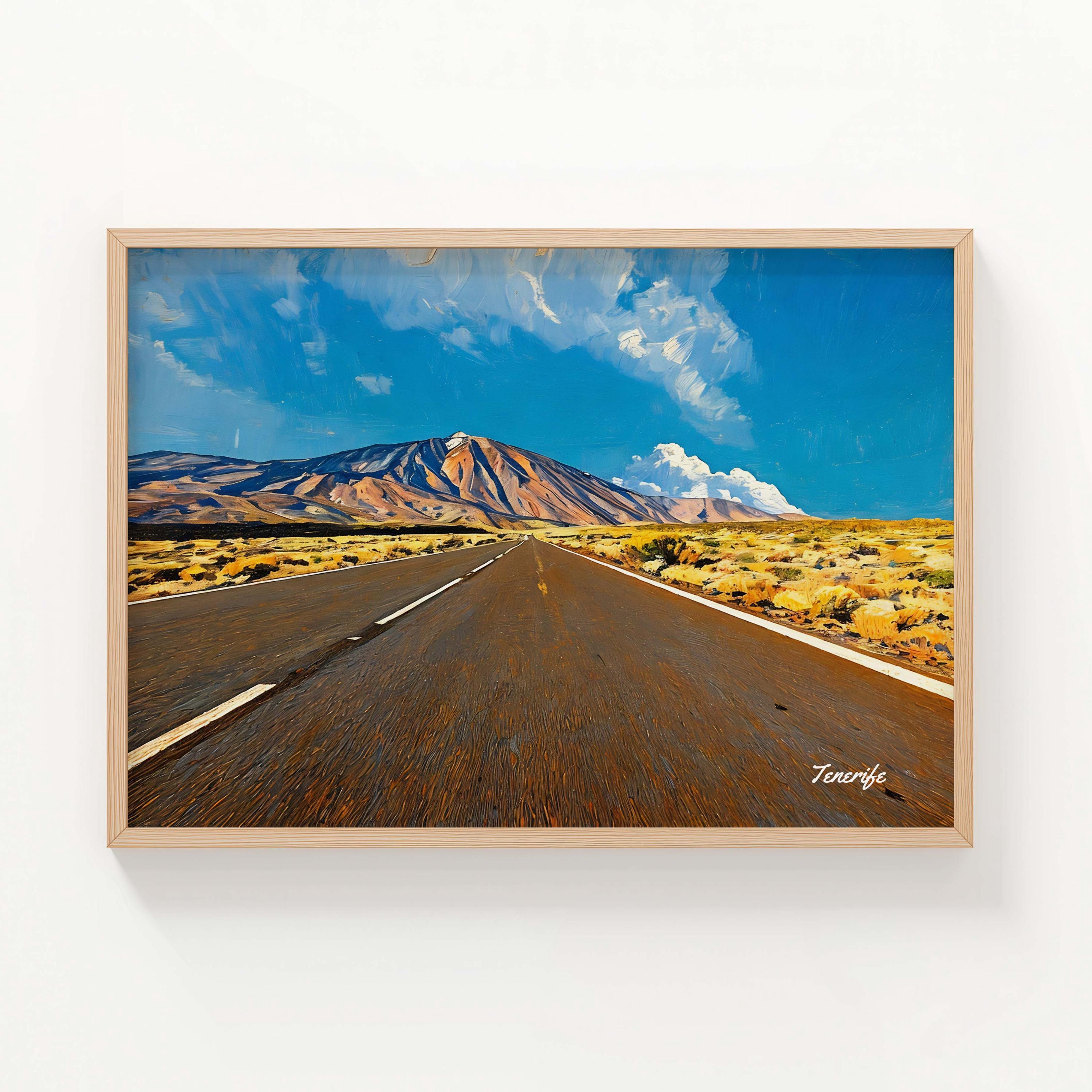 This artwork captures the dramatic road leading through Teide National Park in Tenerife, one of the most remarkable volcanic landscapes in the Canary Islands. The long road stretches across the open terrain toward Mount Teide, Spain’s highest peak and the dominant natural landmark of the island.