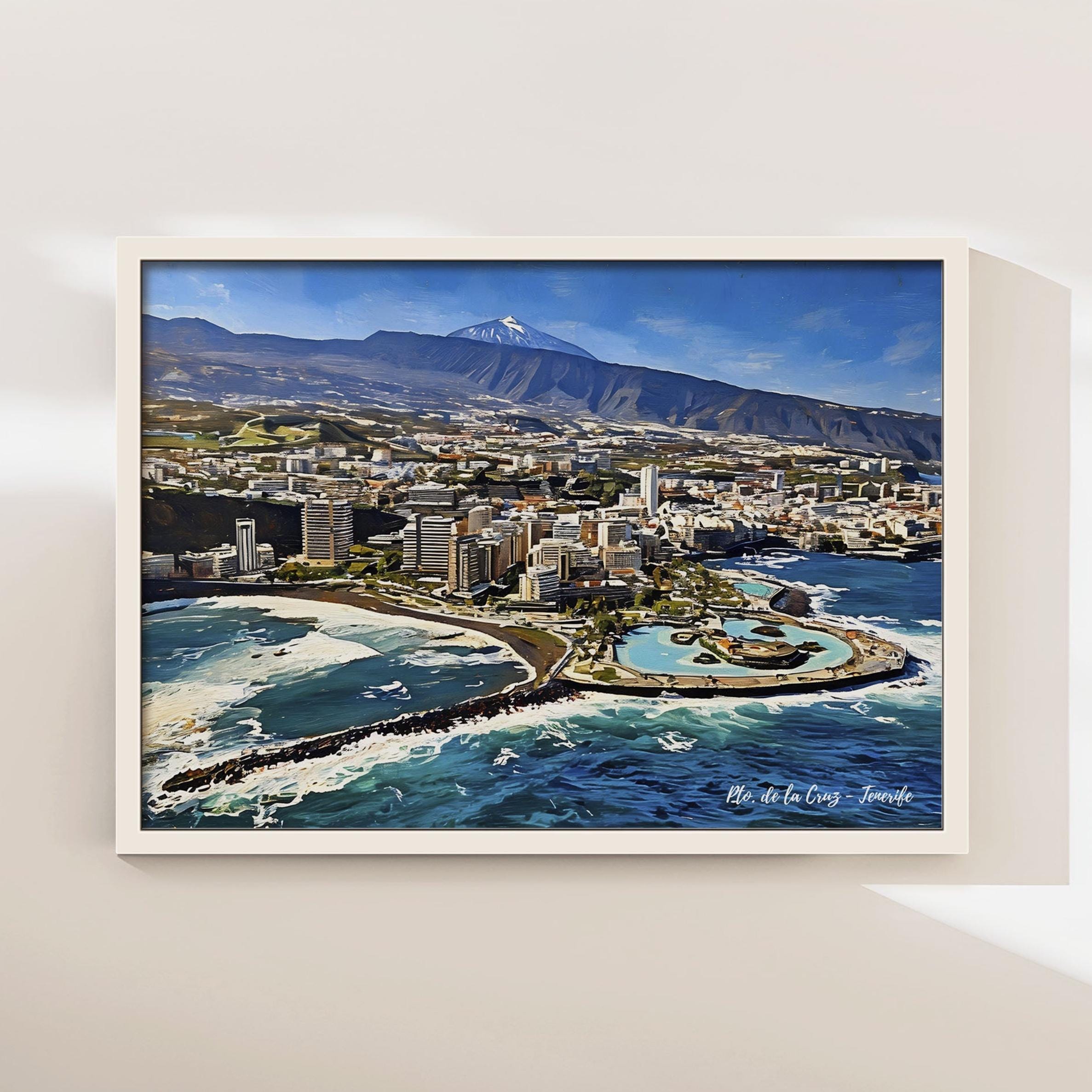 This artwork presents Puerto de la Cruz, one of the most well-known coastal cities in northern Tenerife. The view captures the city’s distinctive shoreline with the famous Lago Martiánez seawater pools, framed by the Atlantic Ocean and the dramatic silhouette of Mount Teide rising in the distance.