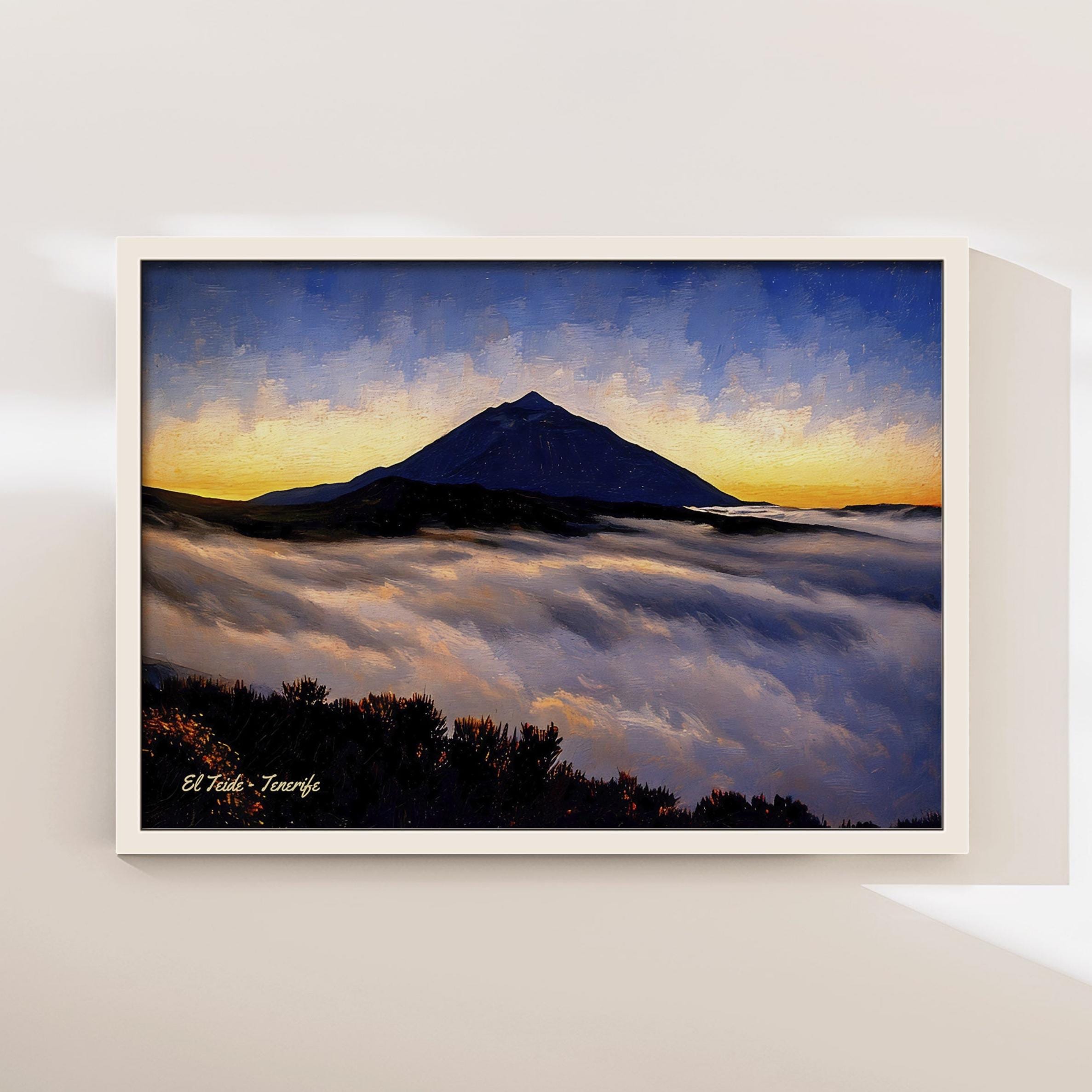 This artwork captures Mount Teide rising above a sea of clouds at sunset, one of the most spectacular views found in Tenerife. As the sun sets behind the horizon, the sky glows with warm tones while the silhouette of the volcano stands dramatically above the cloud layer.
