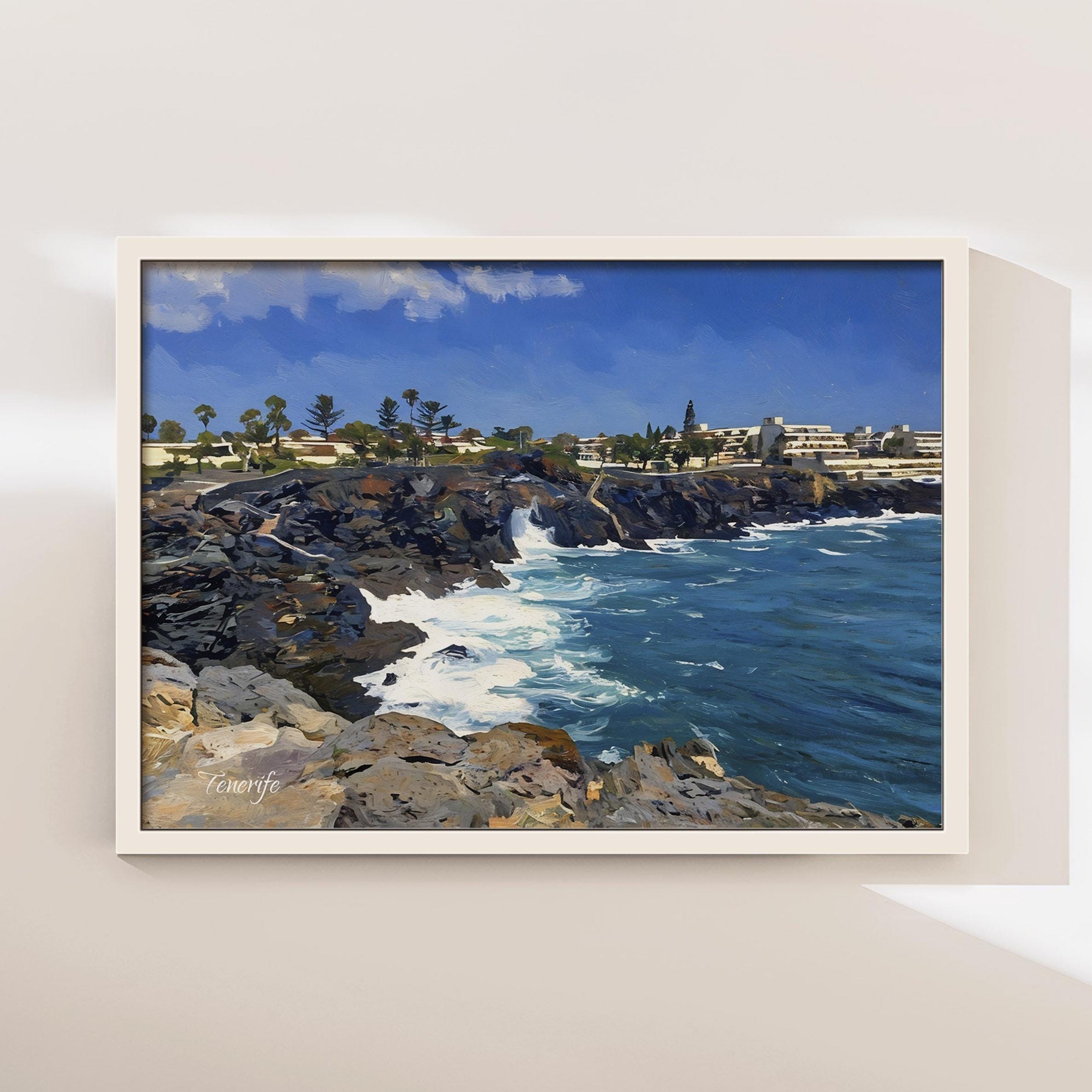 This artwork captures the rugged coastline of southern Tenerife, where volcanic rock formations meet the deep blue waters of the Atlantic Ocean. Waves break against the dark lava cliffs while the nearby tourist areas overlook the sea from the coastal ridge.