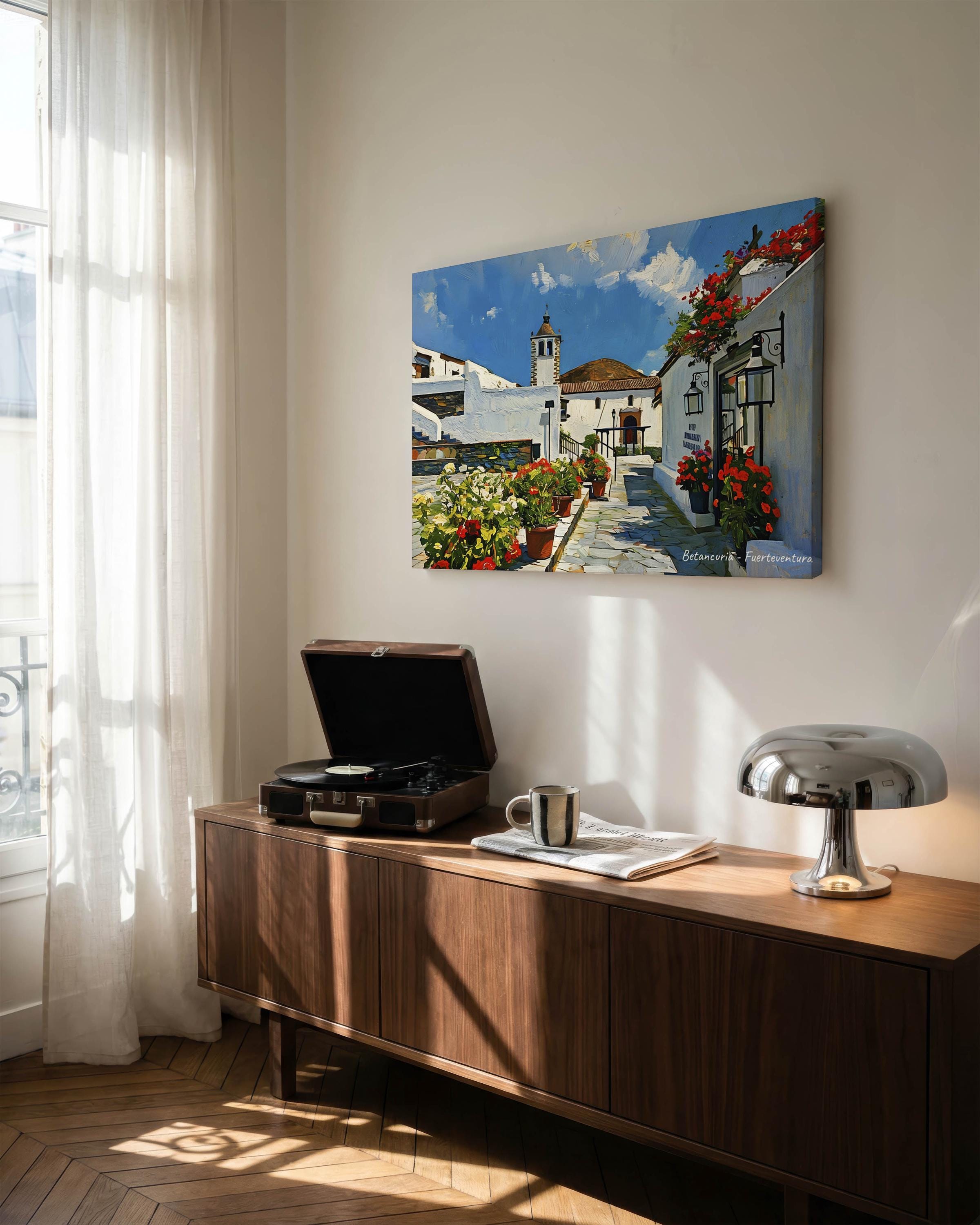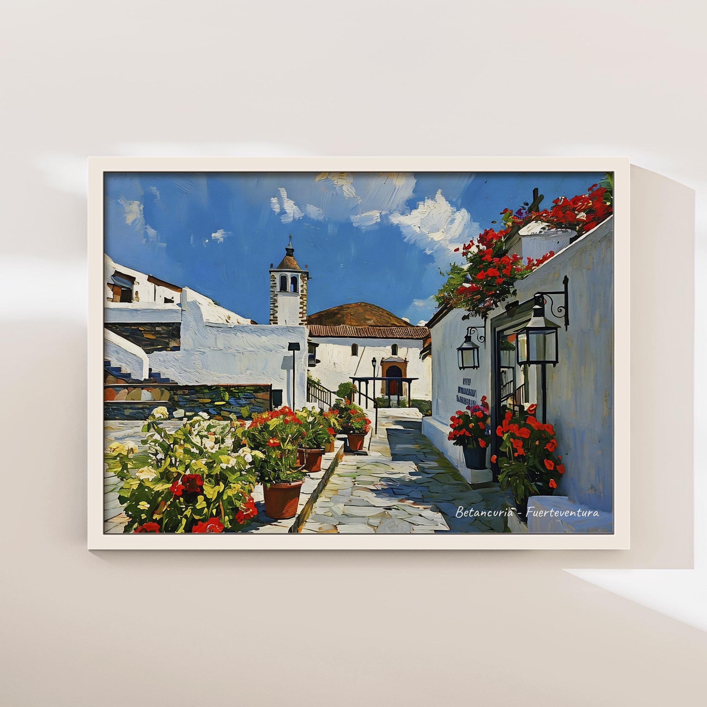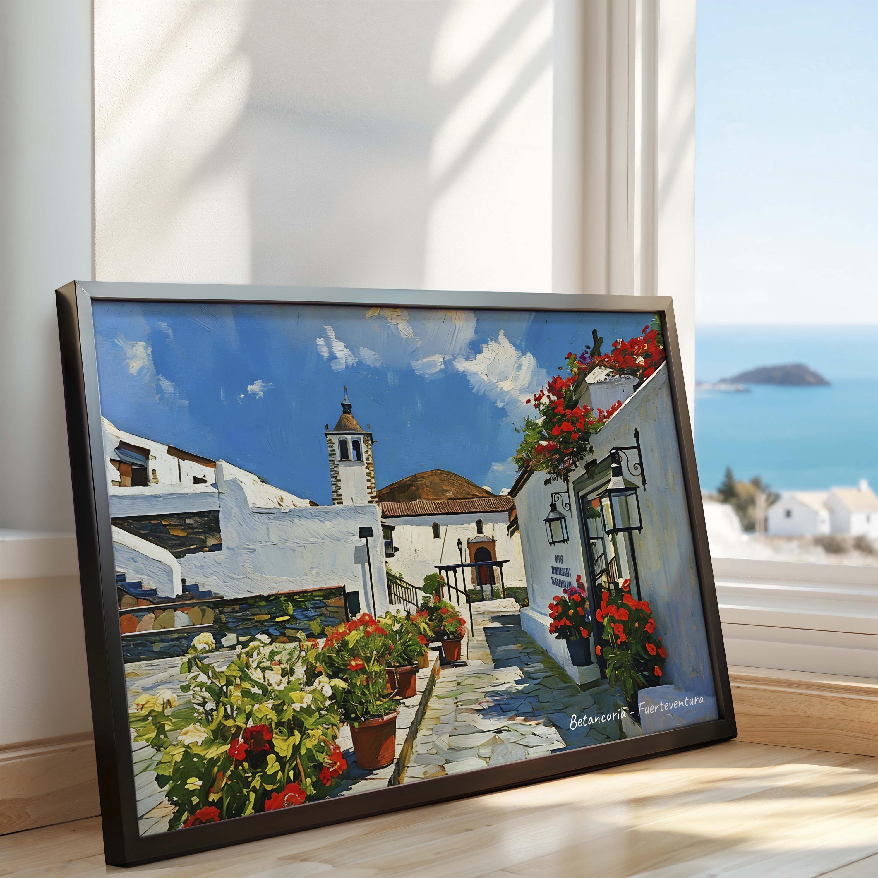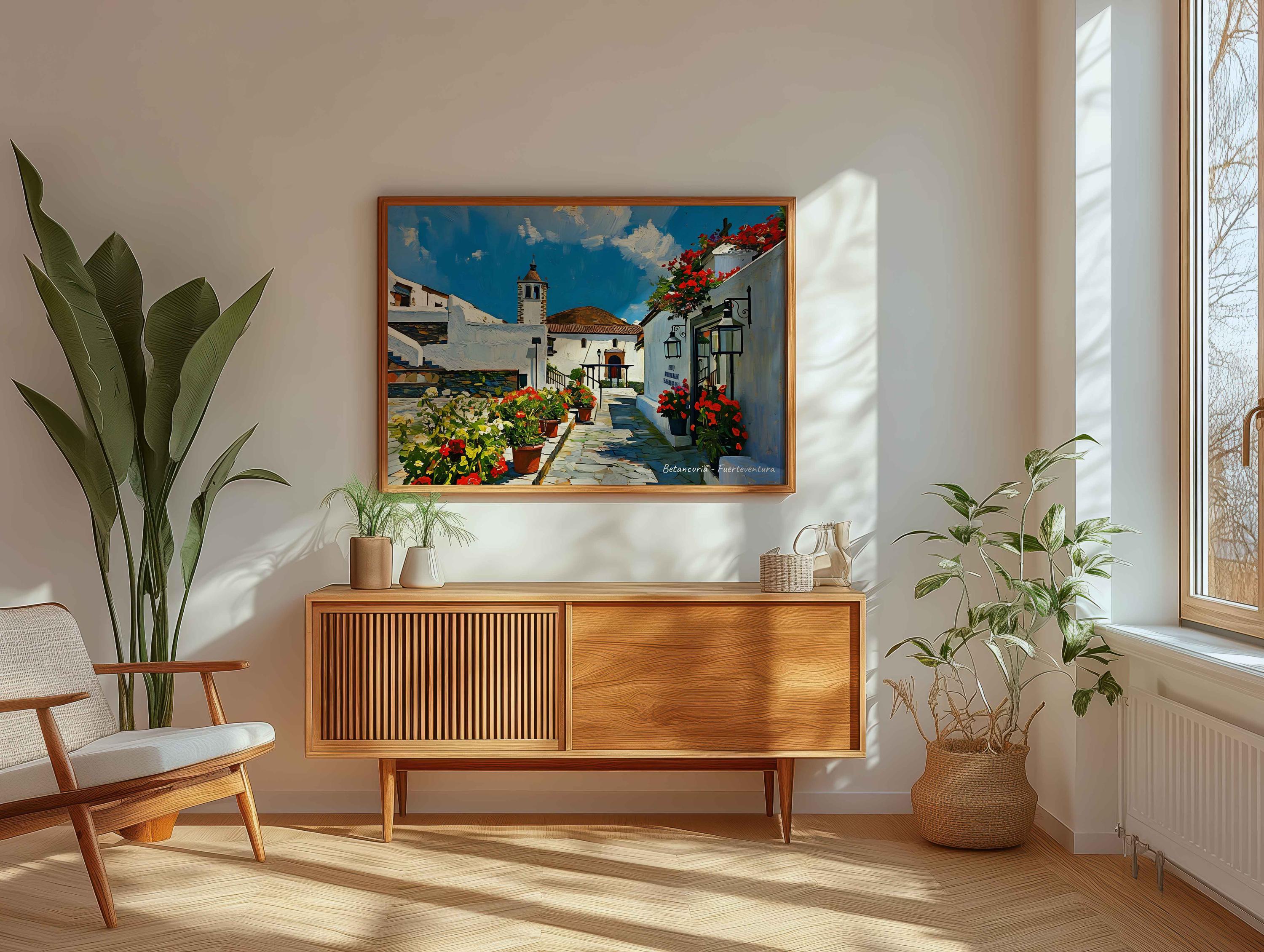 This artwork captures the quiet charm of Betancuria, one of the most historic villages in Fuerteventura. The whitewashed houses, vibrant flowers, and soft volcanic tones reflect the island’s unique character and timeless atmosphere.