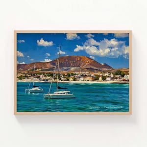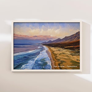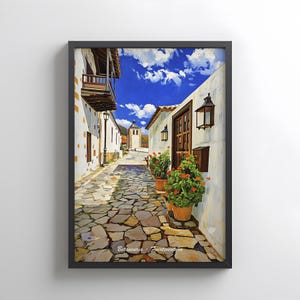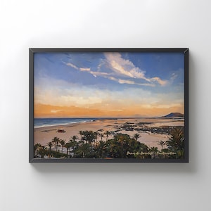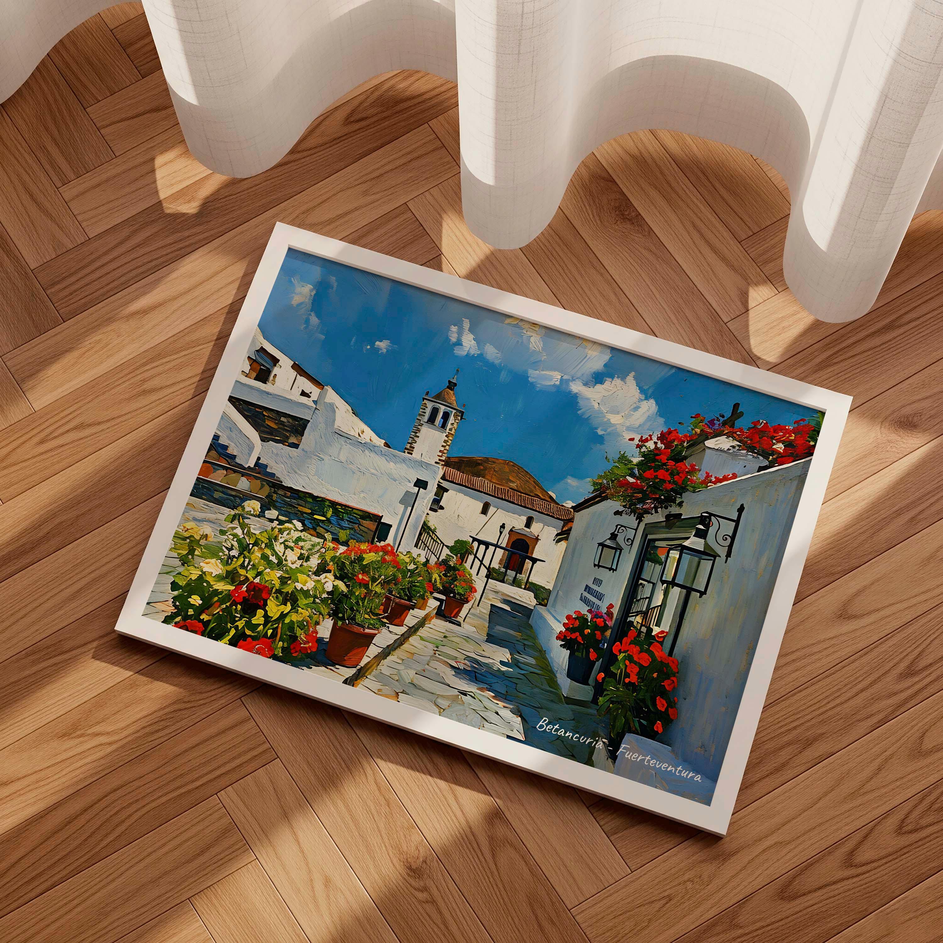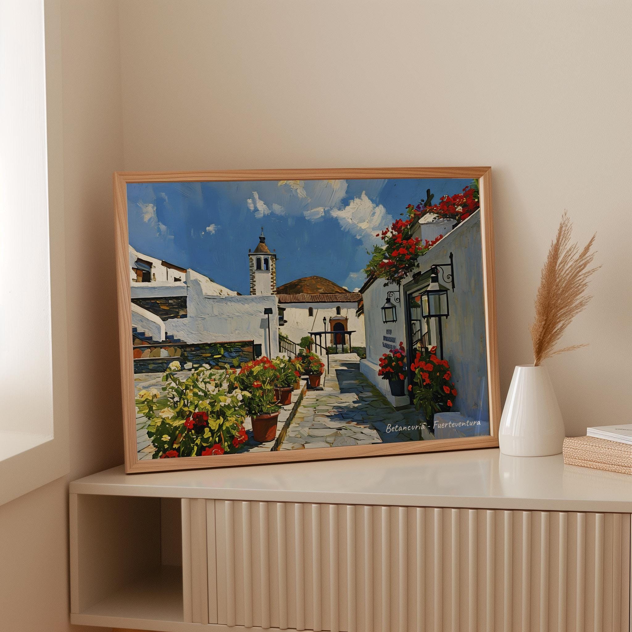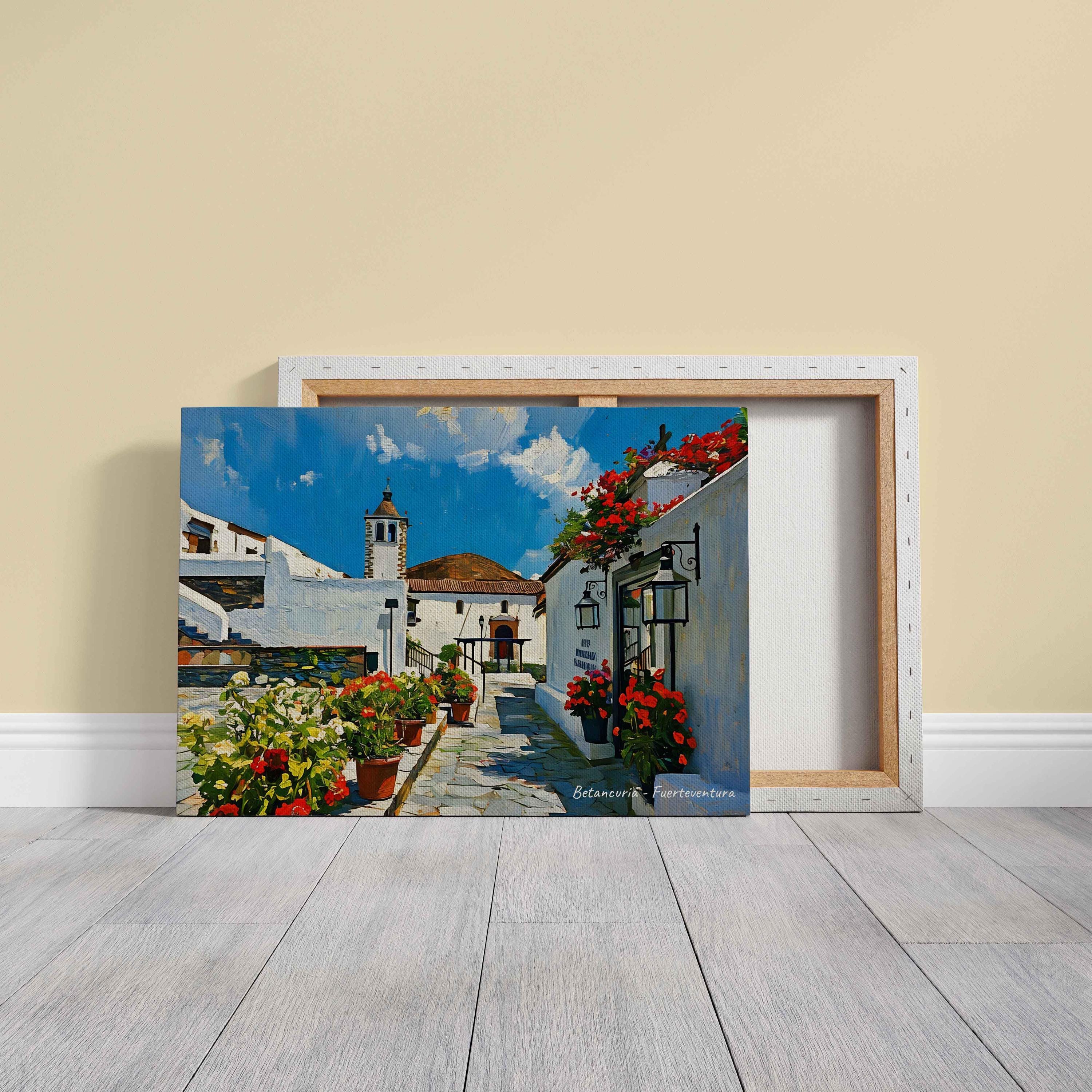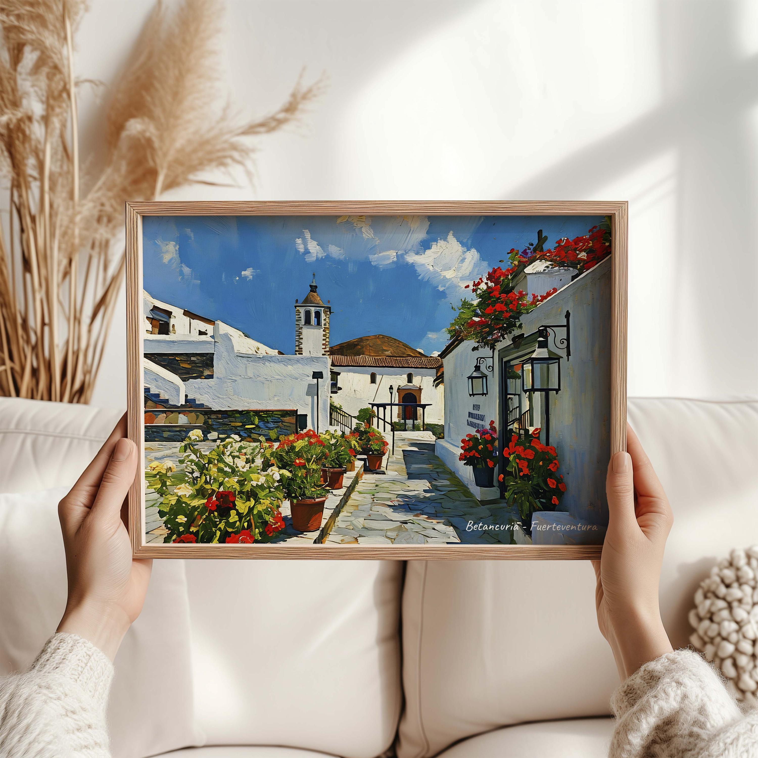 This artwork captures the quiet charm of Betancuria, one of the most historic villages in Fuerteventura. The whitewashed houses, vibrant flowers, and soft volcanic tones reflect the island’s unique character and timeless atmosphere.