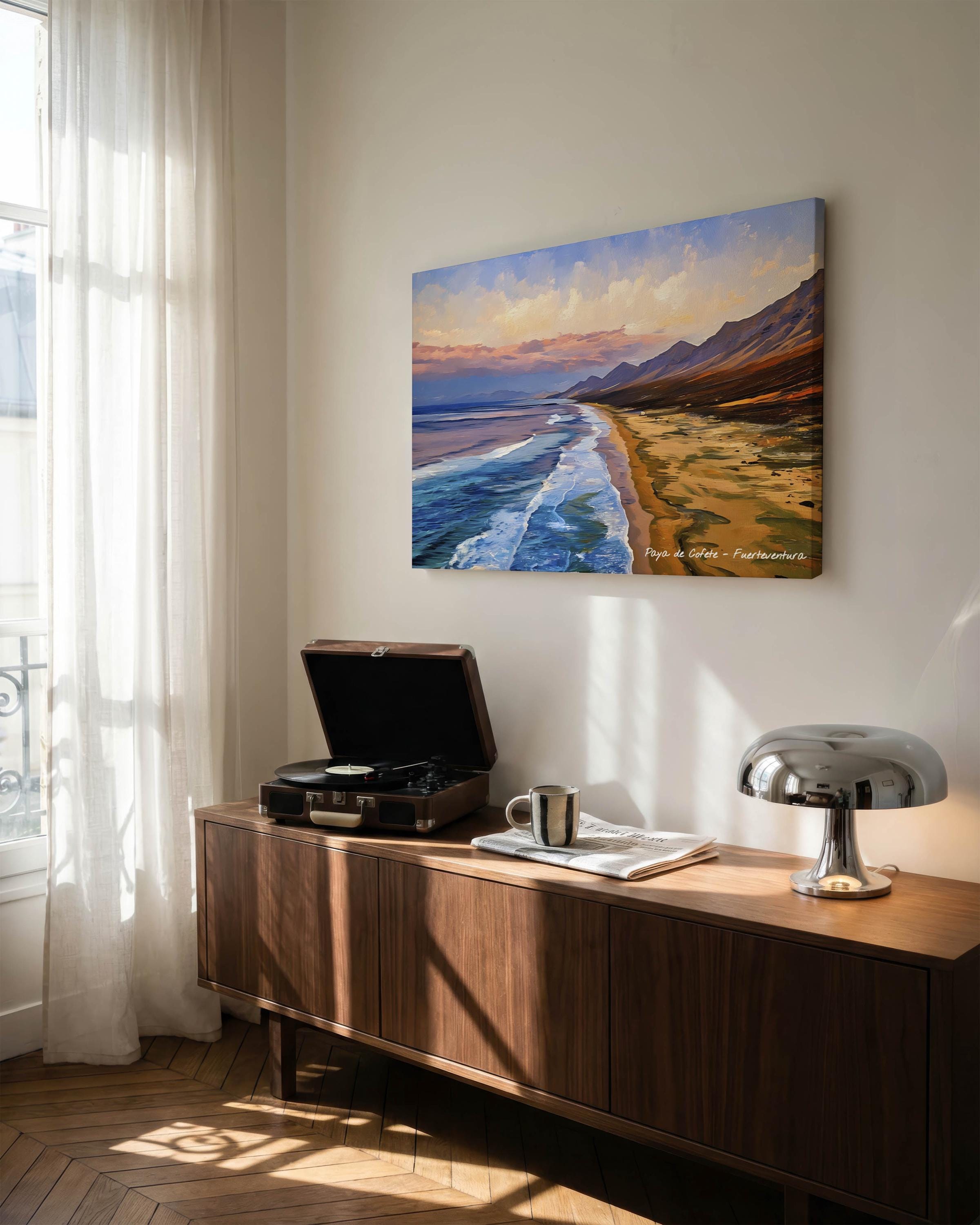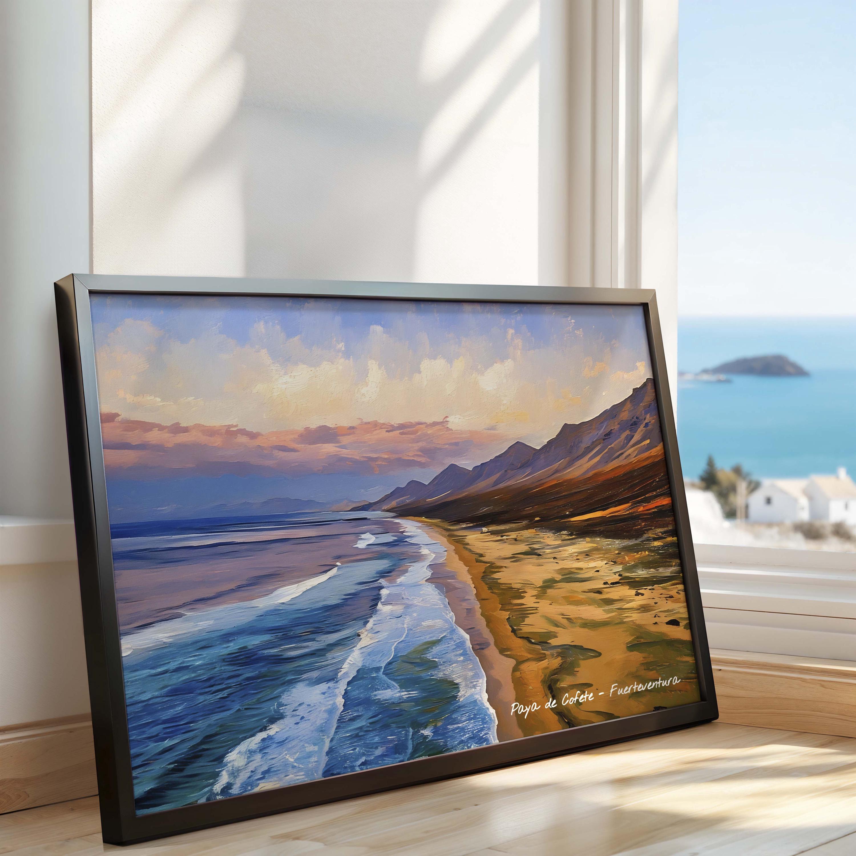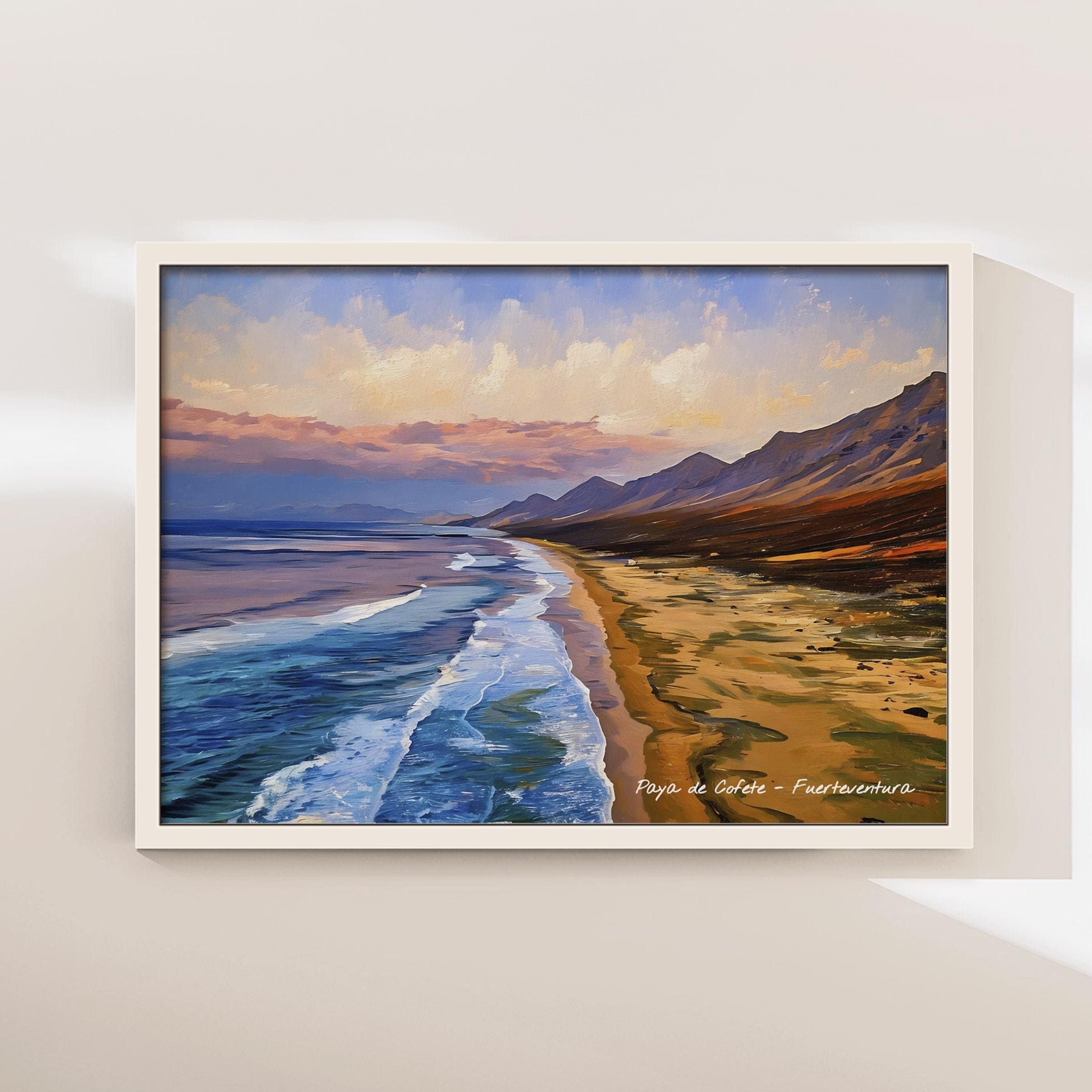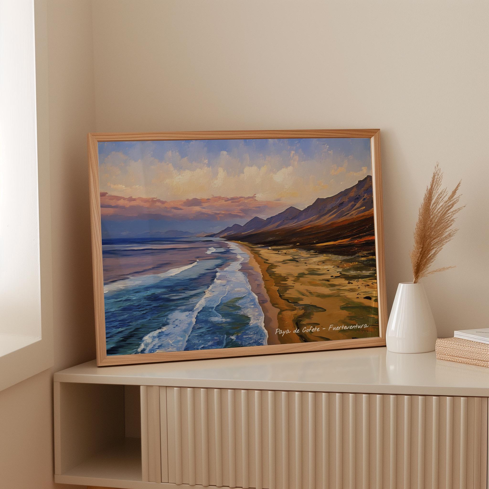 A wide, open coastline unfolds in this piece, capturing the distinctive character of Cofete Beach in Fuerteventura. The contrast between the deep blue Atlantic, the golden sand, and the rugged mountain range creates a balanced and visually striking composition.