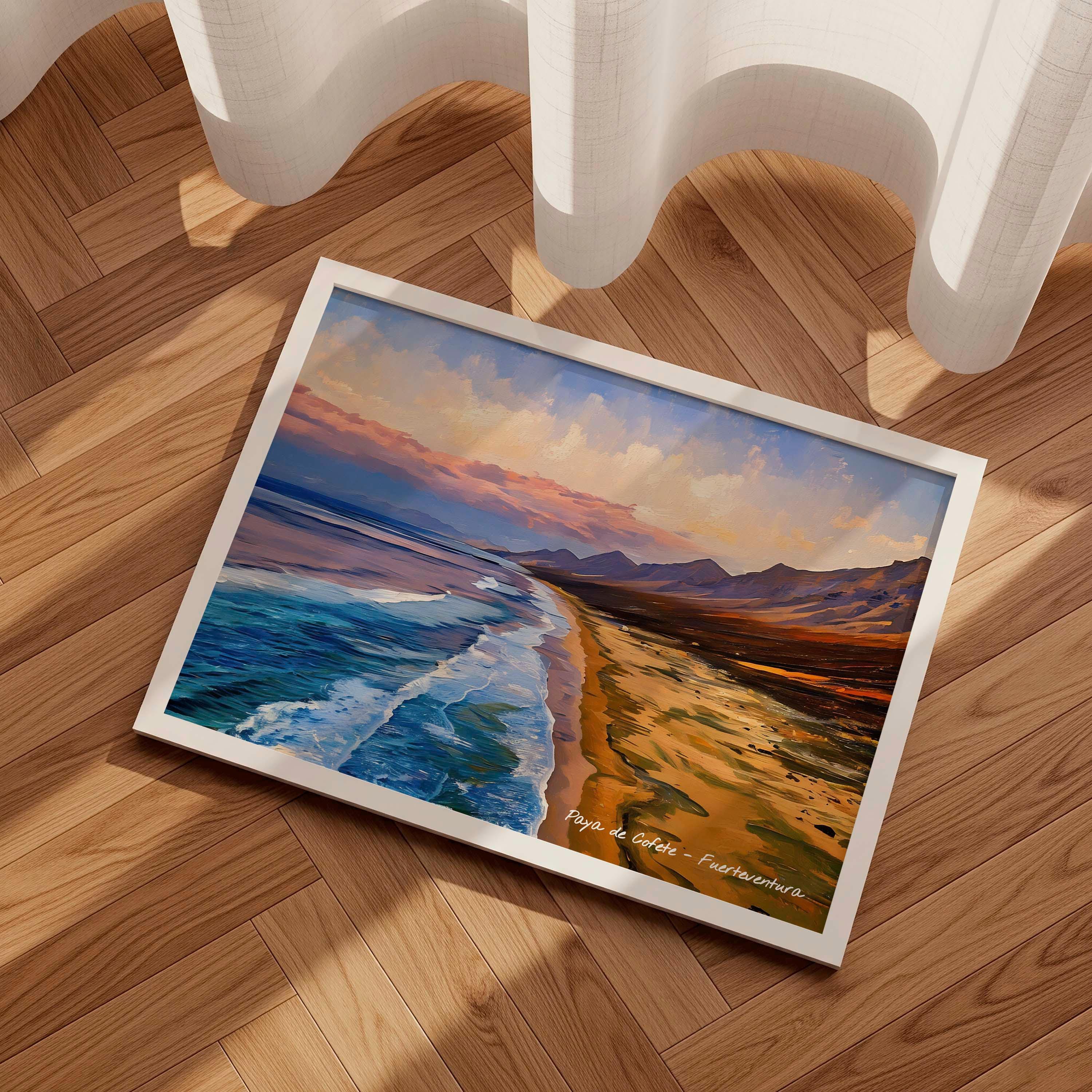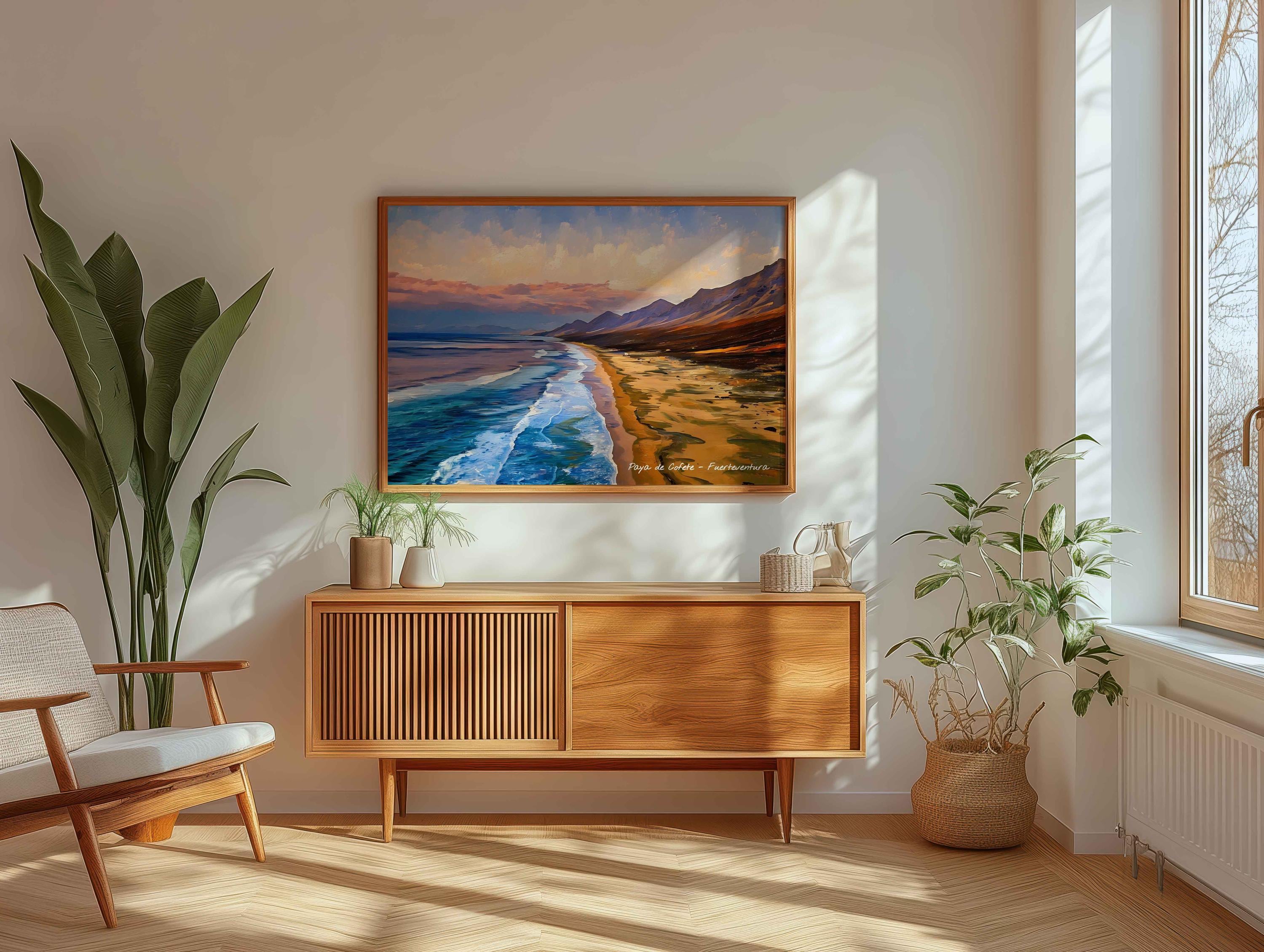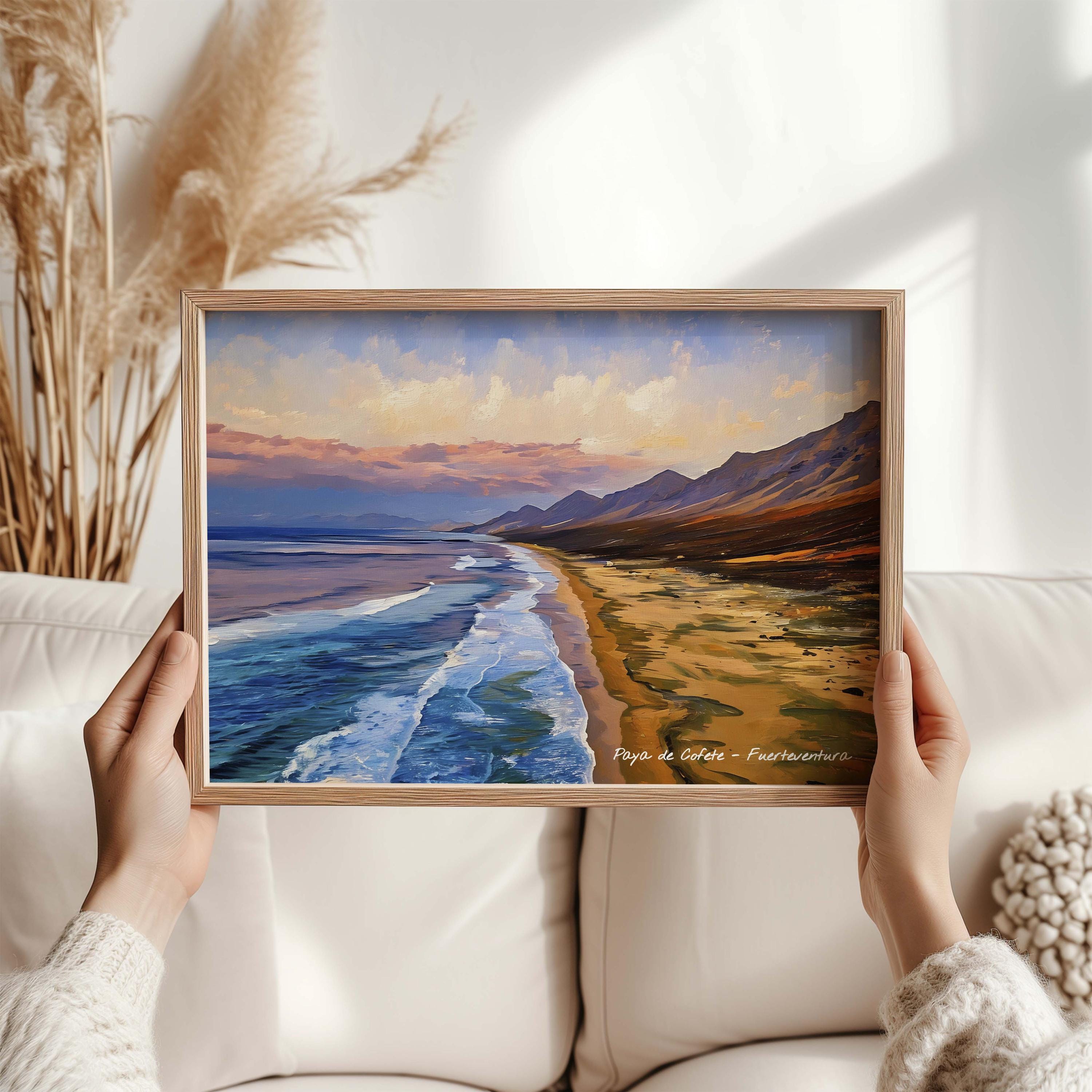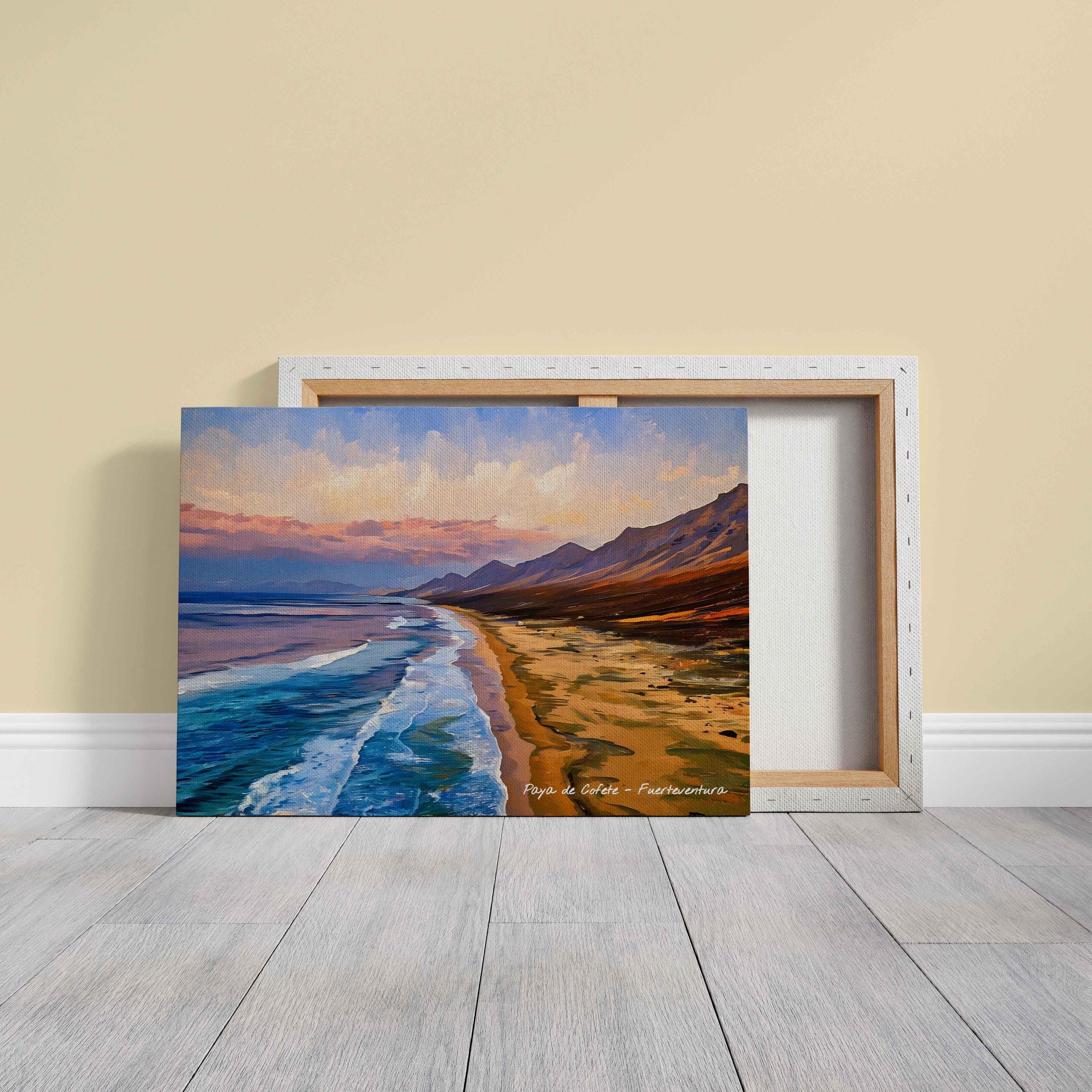 A wide, open coastline unfolds in this piece, capturing the distinctive character of Cofete Beach in Fuerteventura. The contrast between the deep blue Atlantic, the golden sand, and the rugged mountain range creates a balanced and visually striking composition.