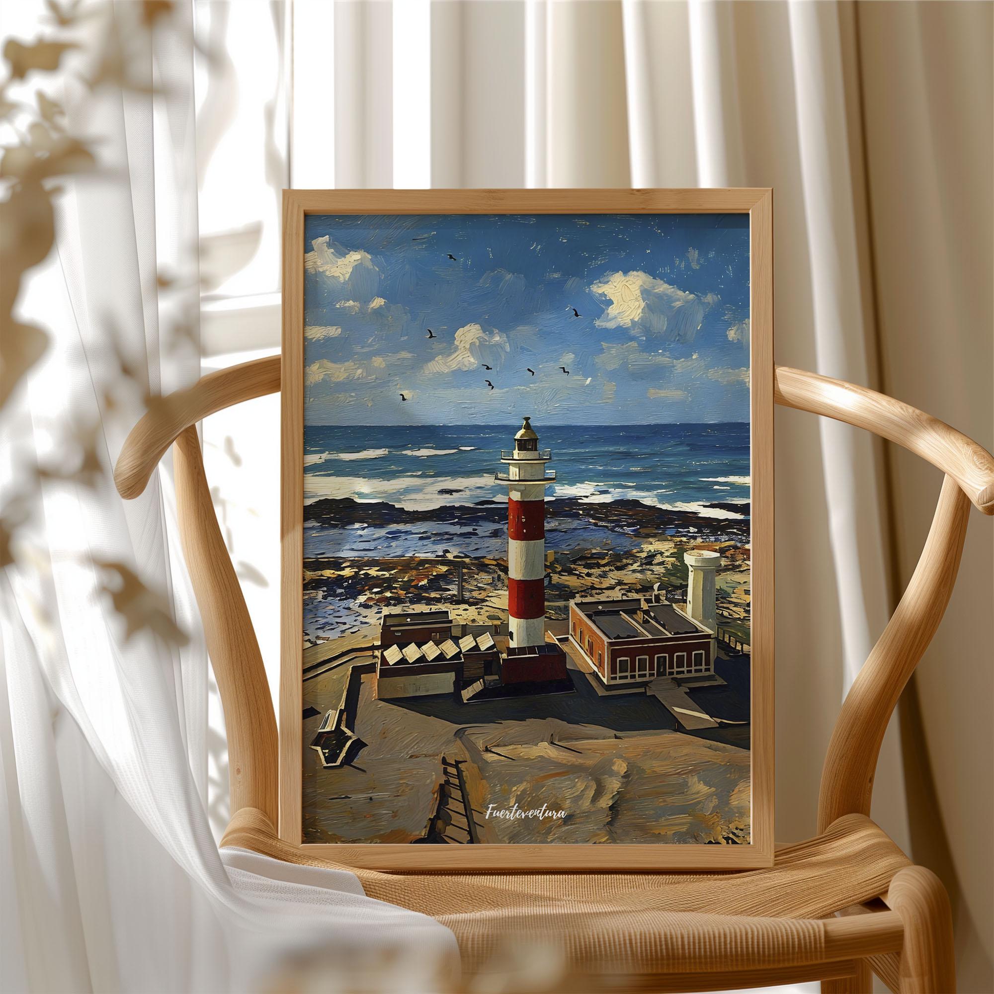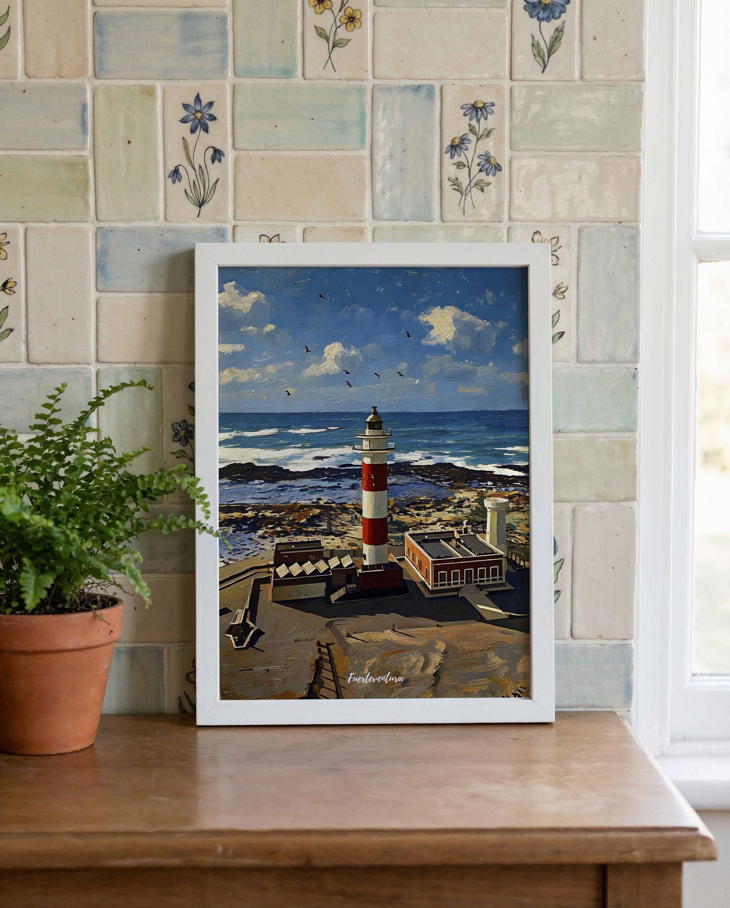 Rising above the Atlantic coastline, El Tostón Lighthouse defines this striking seascape from Fuerteventura. The red and white tower stands out against the deep blue ocean and rugged volcanic shoreline, creating a bold and balanced composition.