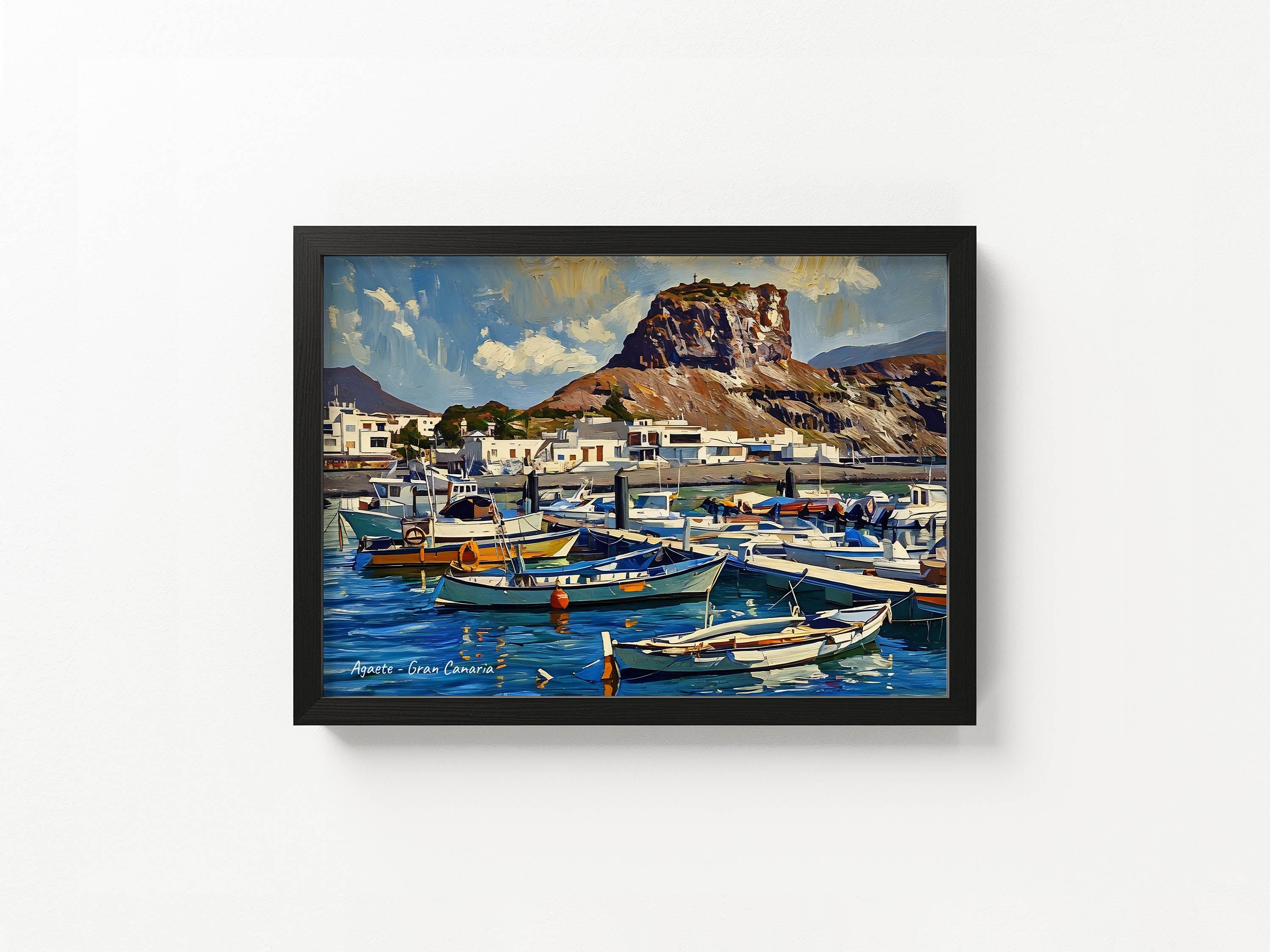 Color and movement come together in this vibrant coastal scene from Agaete, one of the most authentic fishing villages in Gran Canaria. The composition highlights traditional boats resting on calm waters, framed by white houses and the striking volcanic massif rising in the background.