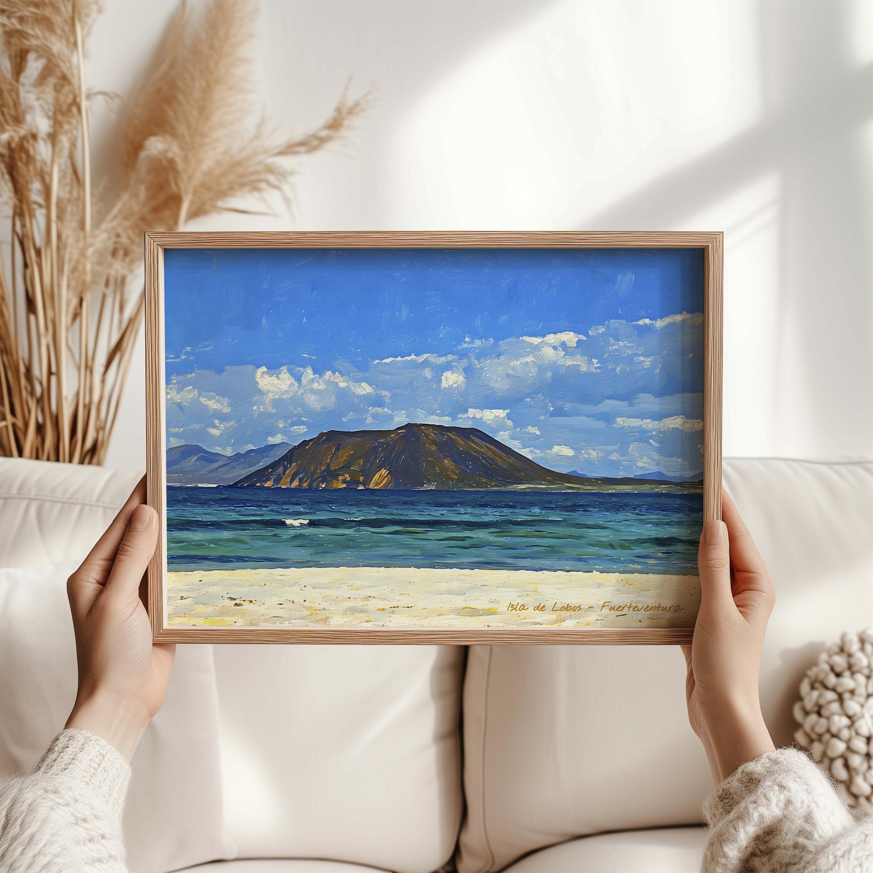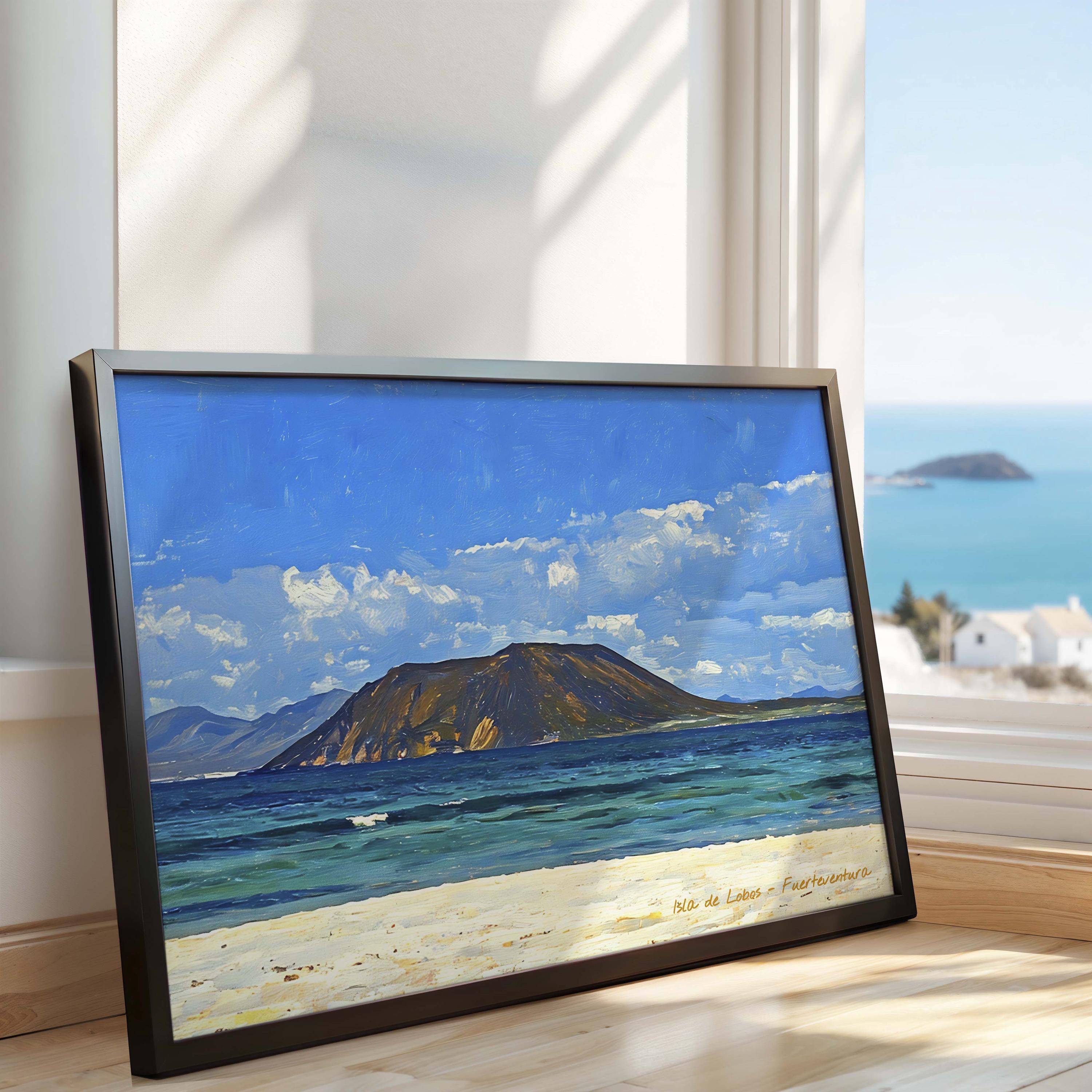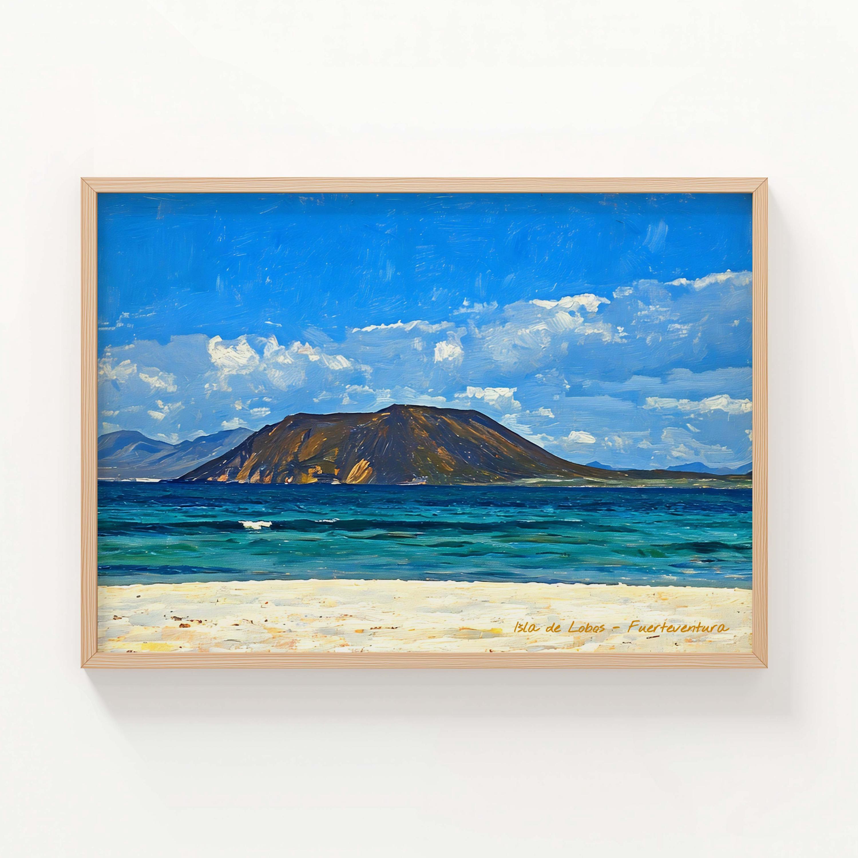 A serene coastal view where the turquoise Atlantic meets the volcanic silhouette of Isla de Lobos, just off the northern coast of Fuerteventura. The contrast between the crystal-clear water and the rugged terrain creates a striking yet calming composition.