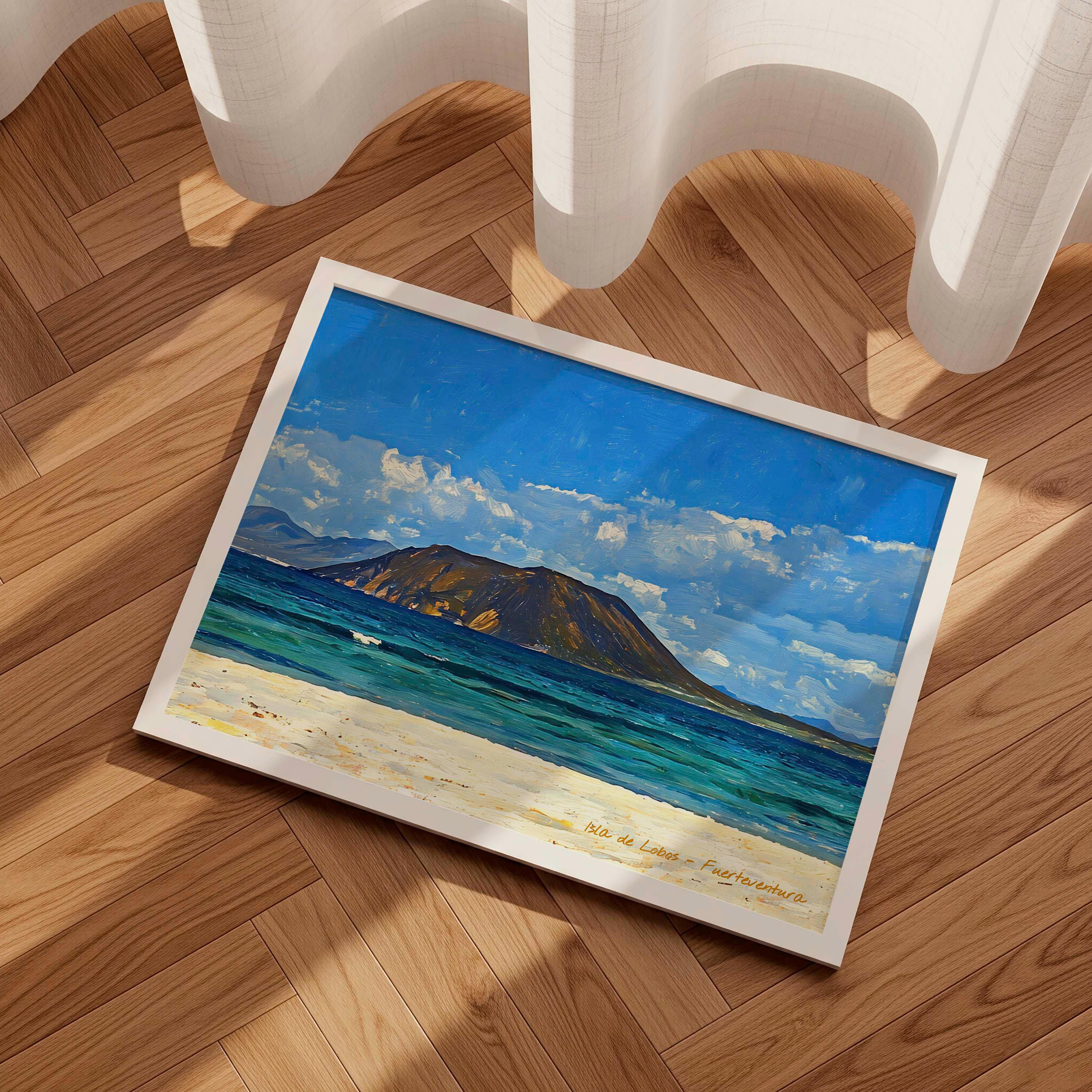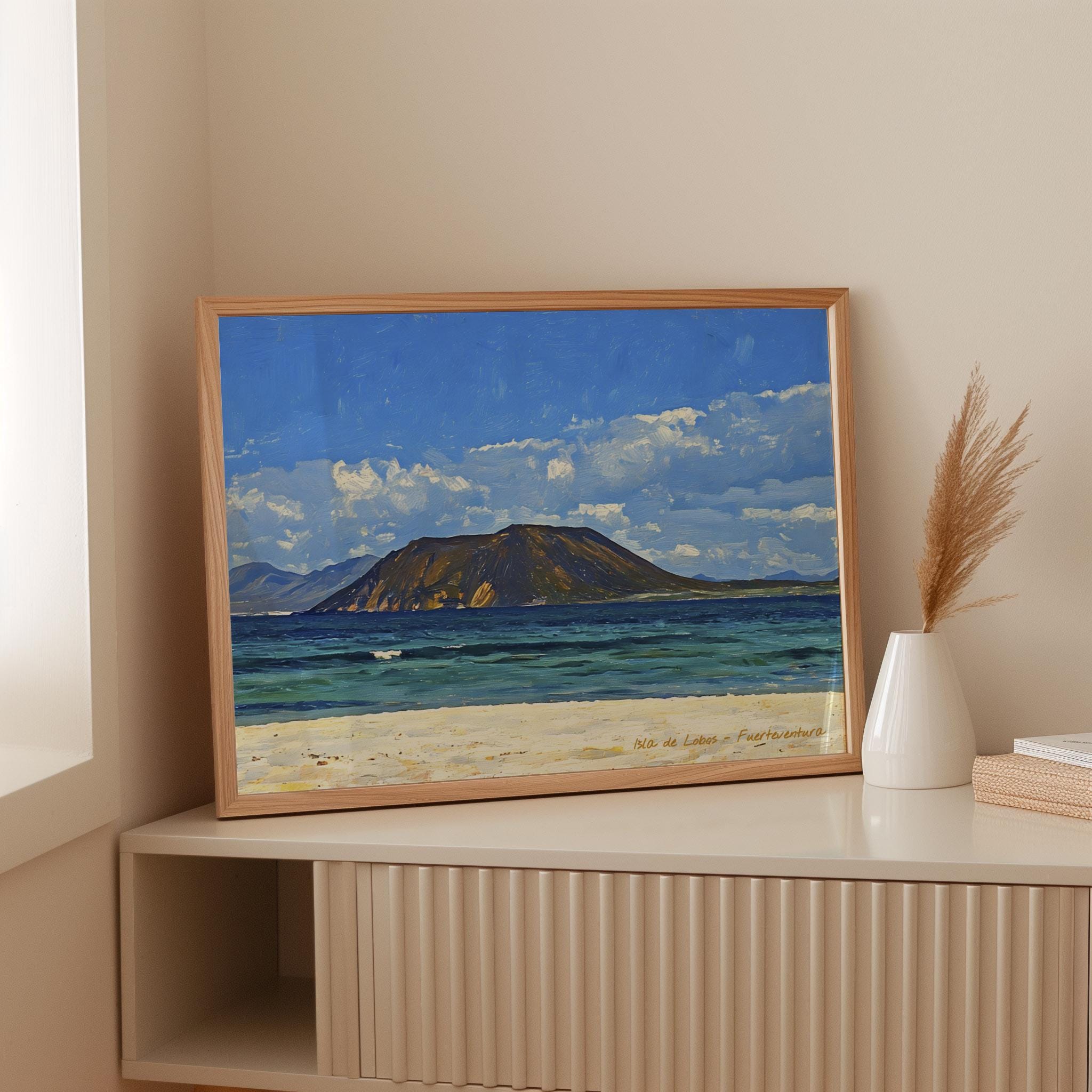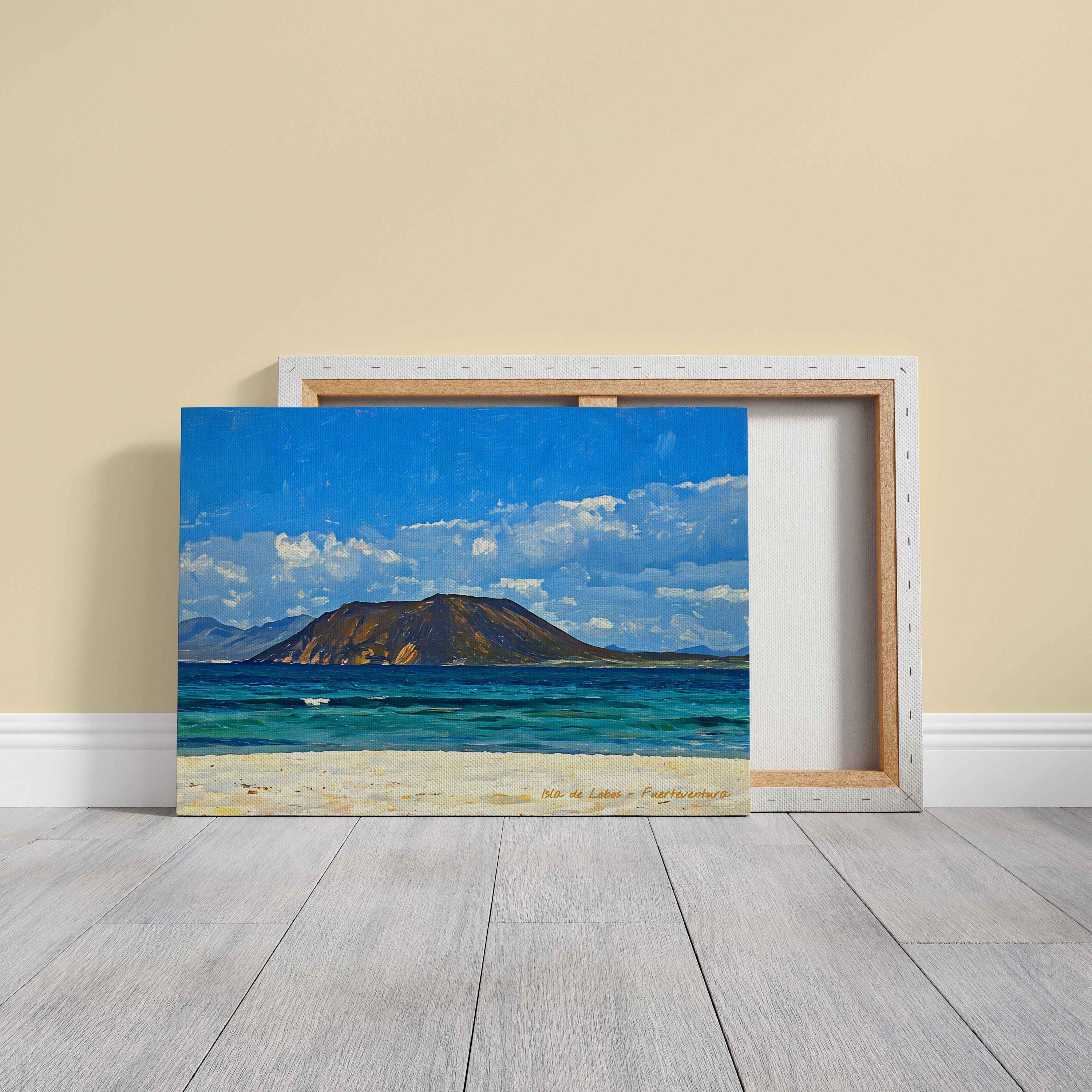 A serene coastal view where the turquoise Atlantic meets the volcanic silhouette of Isla de Lobos, just off the northern coast of Fuerteventura. The contrast between the crystal-clear water and the rugged terrain creates a striking yet calming composition.