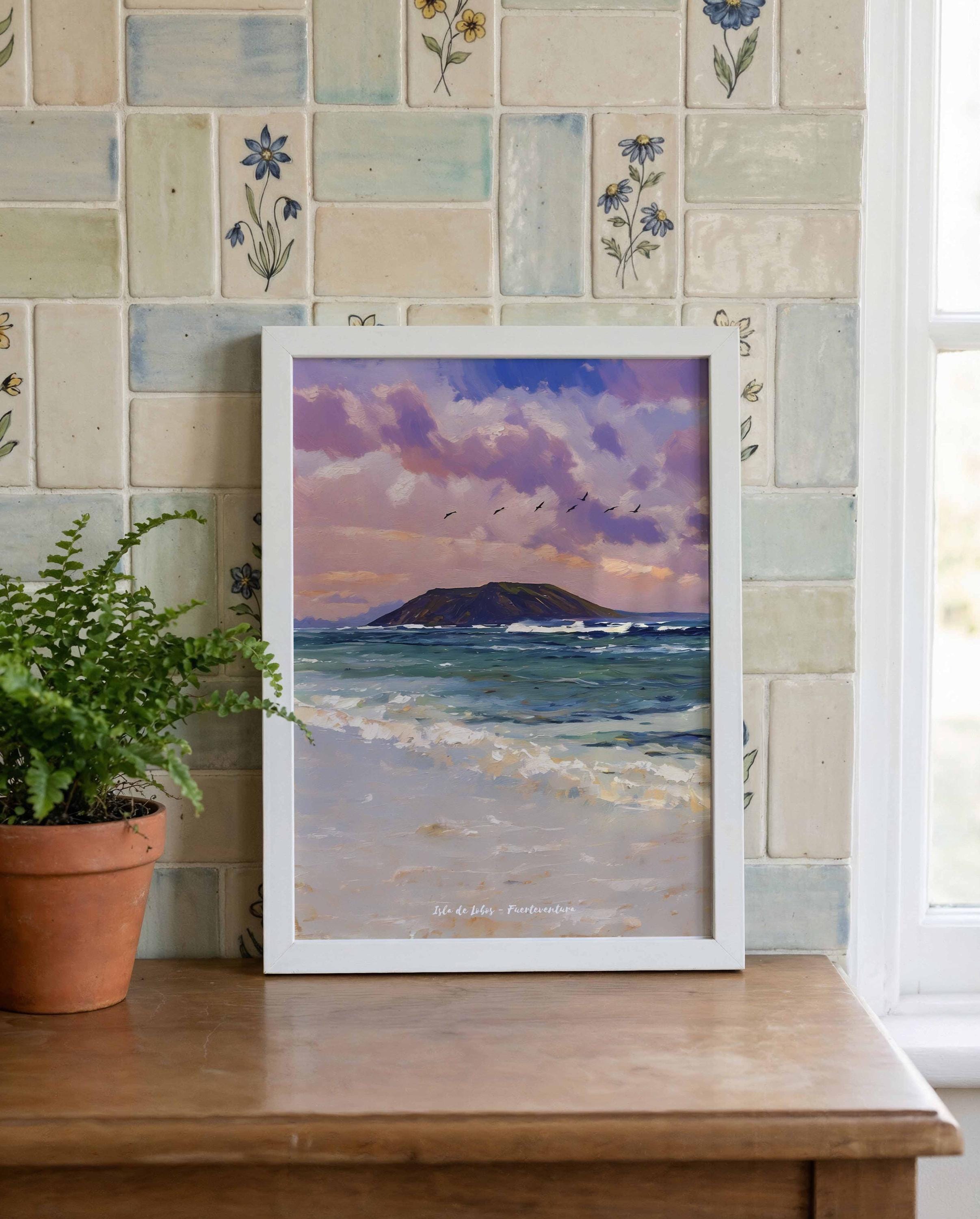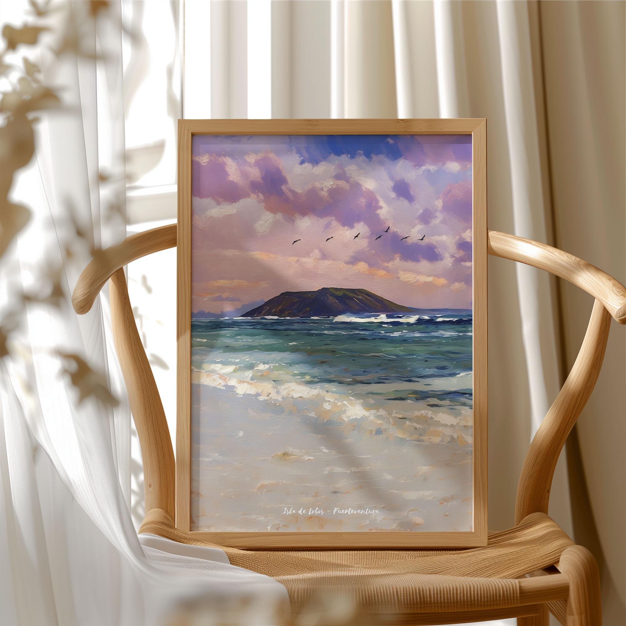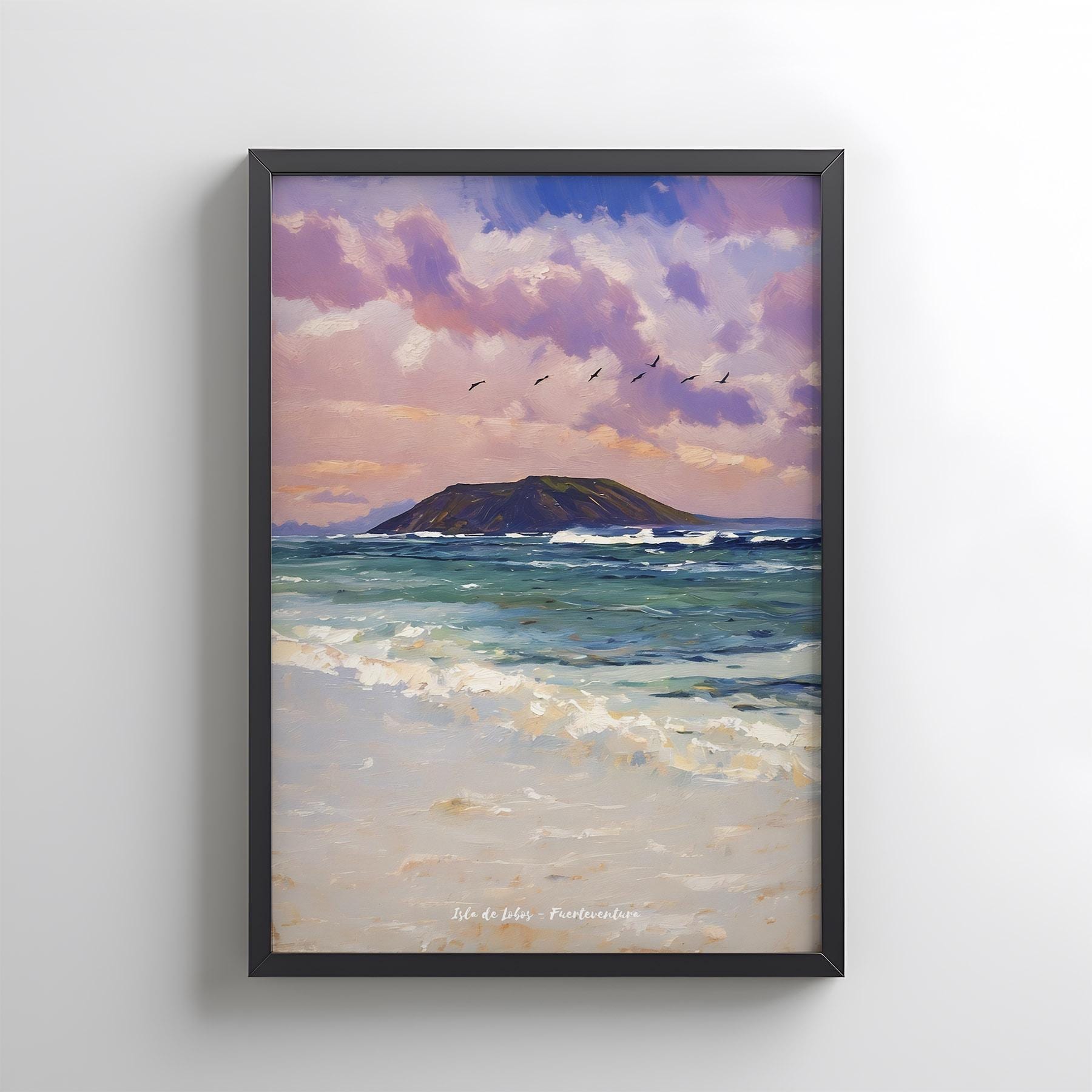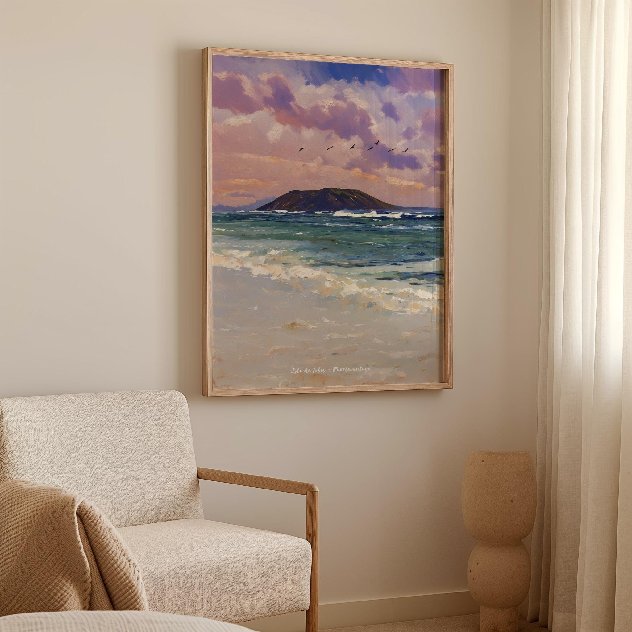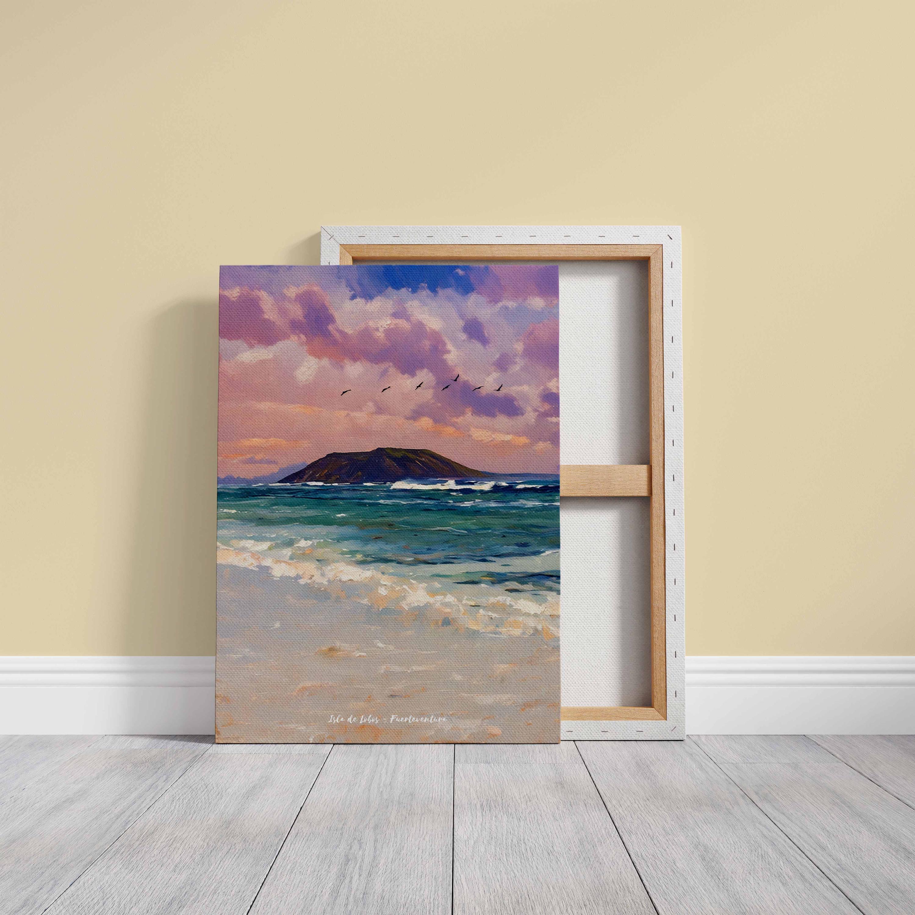Soft pastel tones wash over the Atlantic in this tranquil view of Isla de Lobos, where gentle waves meet the shore under a glowing evening sky. The distant island silhouette and the rhythm of the sea create a calm, almost meditative atmosphere.