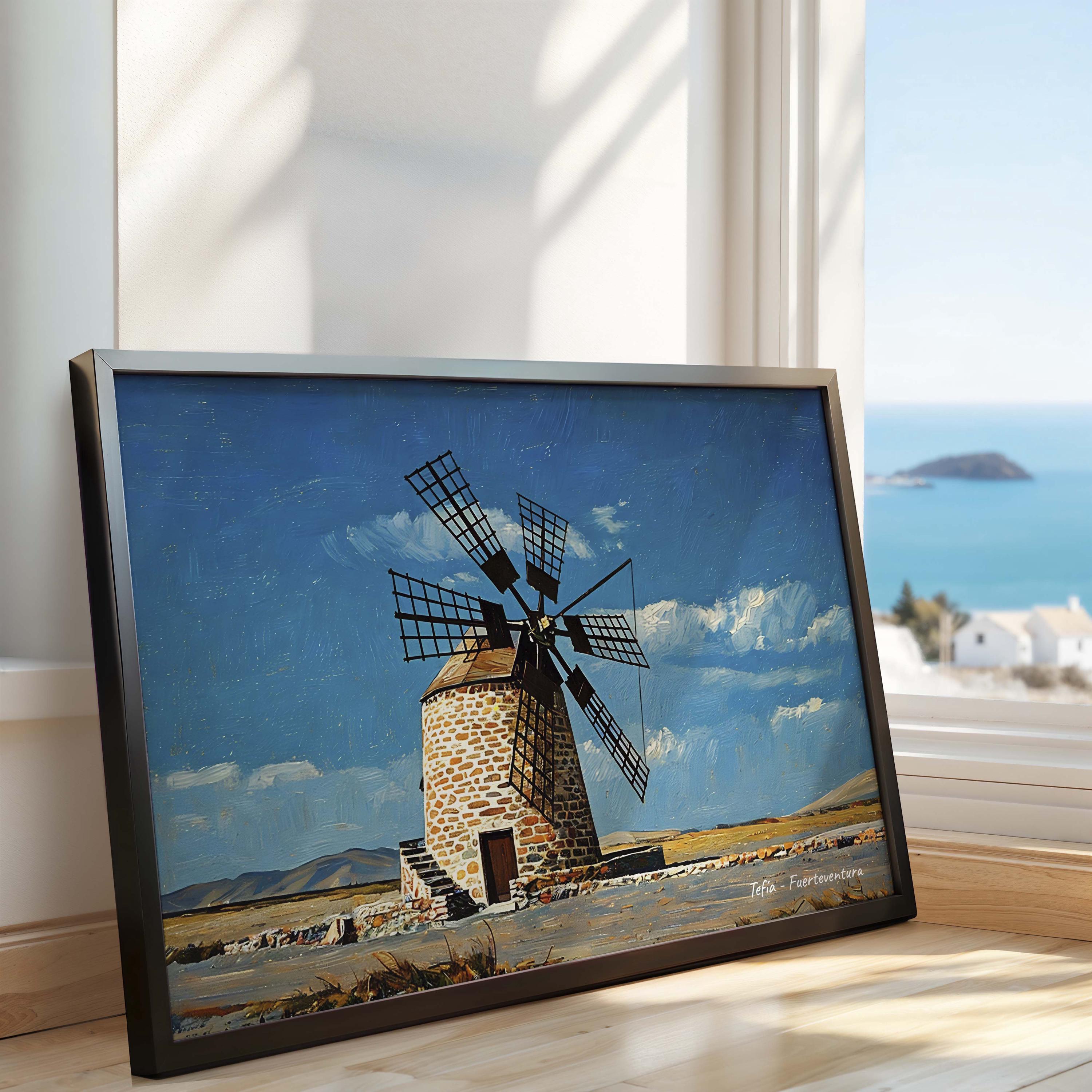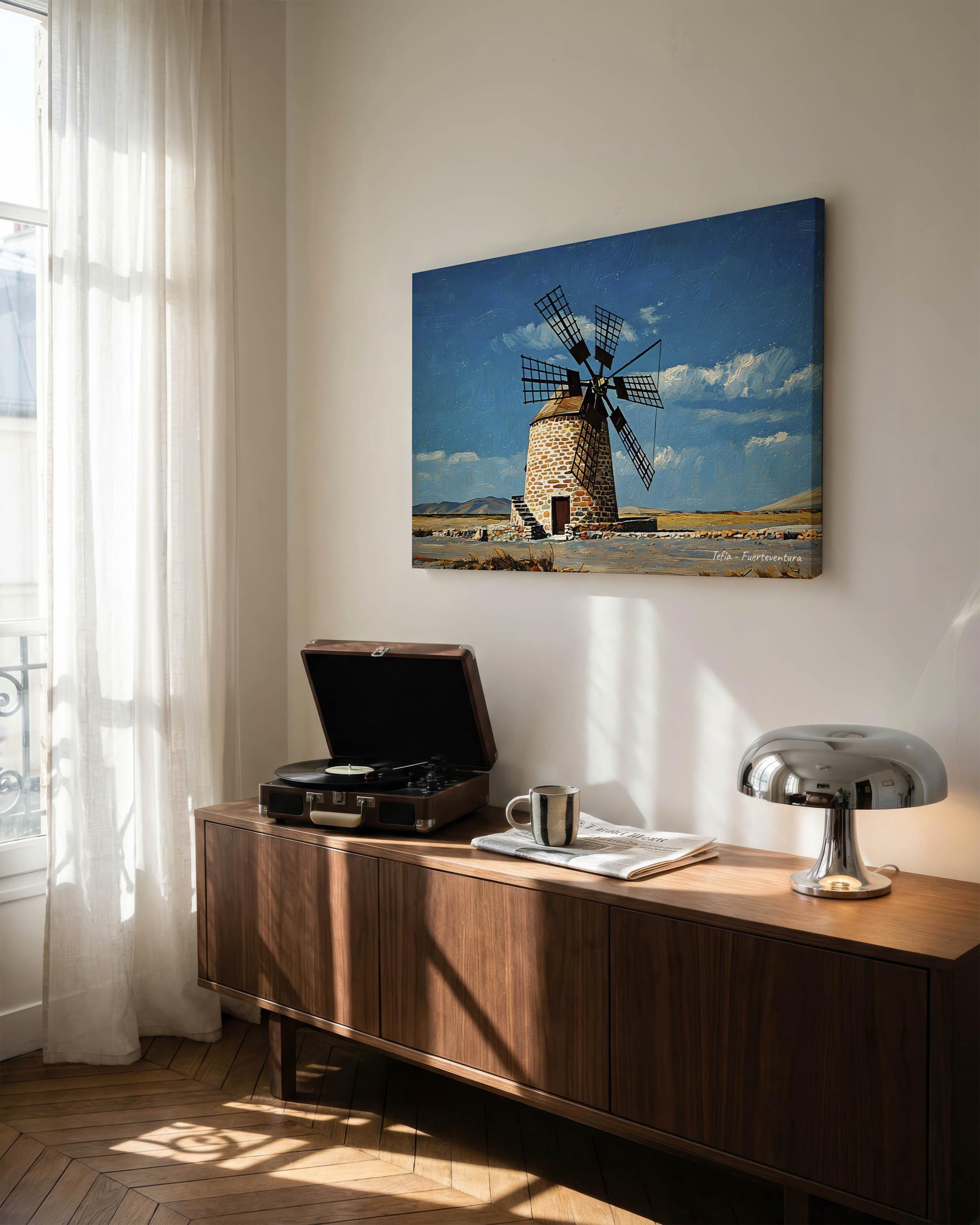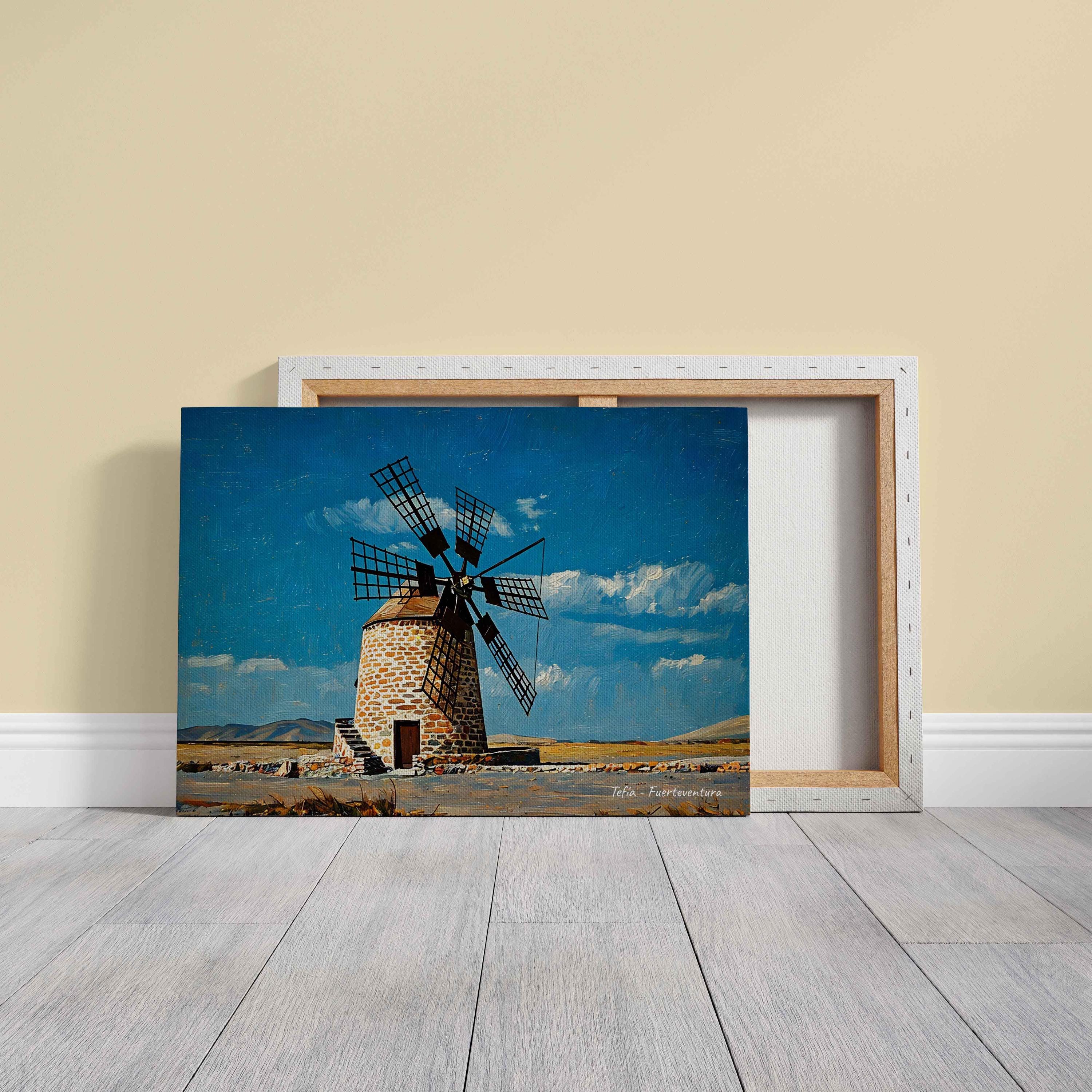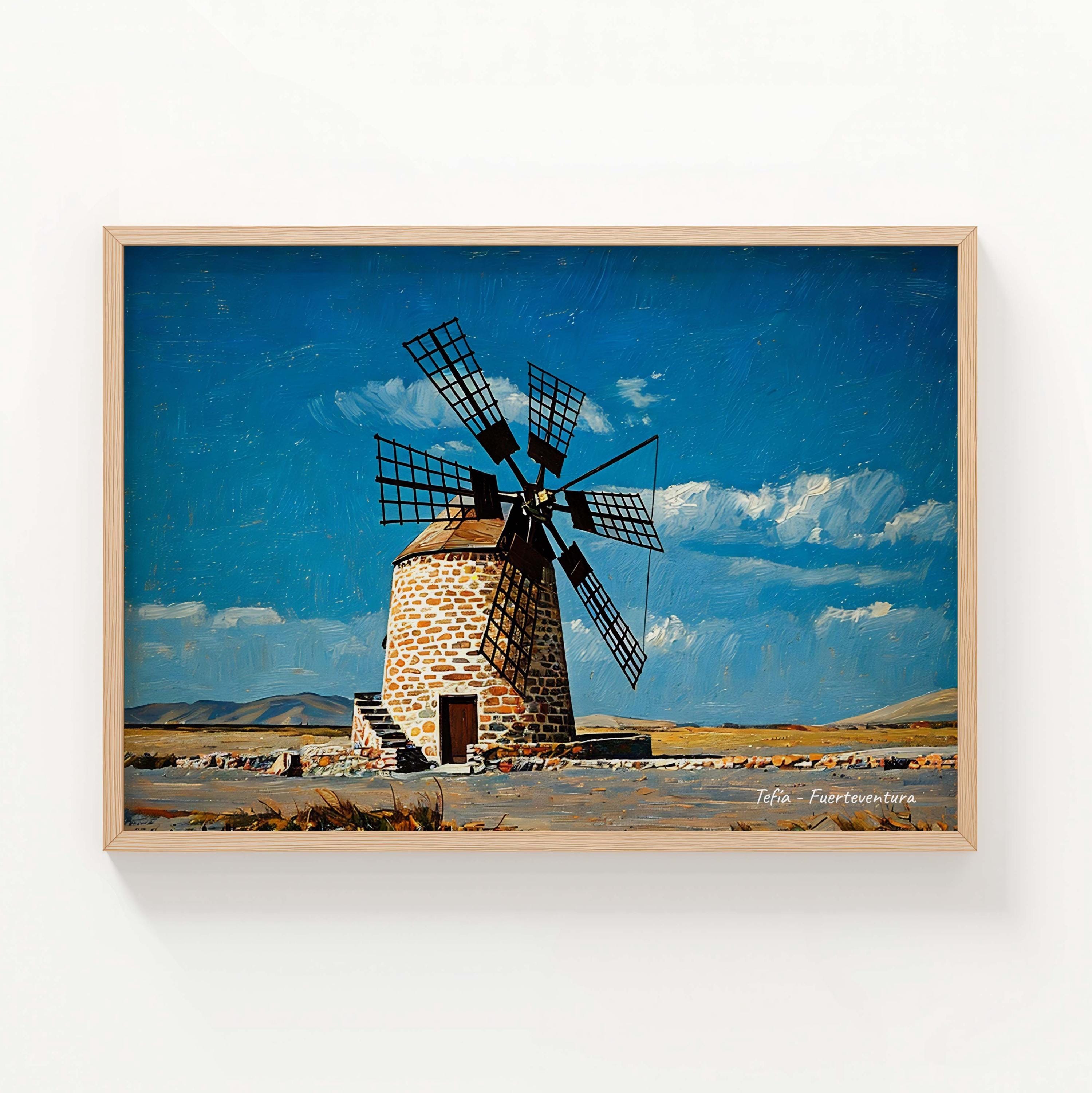 Standing alone against an open sky, this traditional windmill in Tefía captures the essence of Fuerteventura’s rural landscape. The contrast between the textured stone structure, the dark blades, and the expansive blue sky creates a composition that feels both simple and powerful.