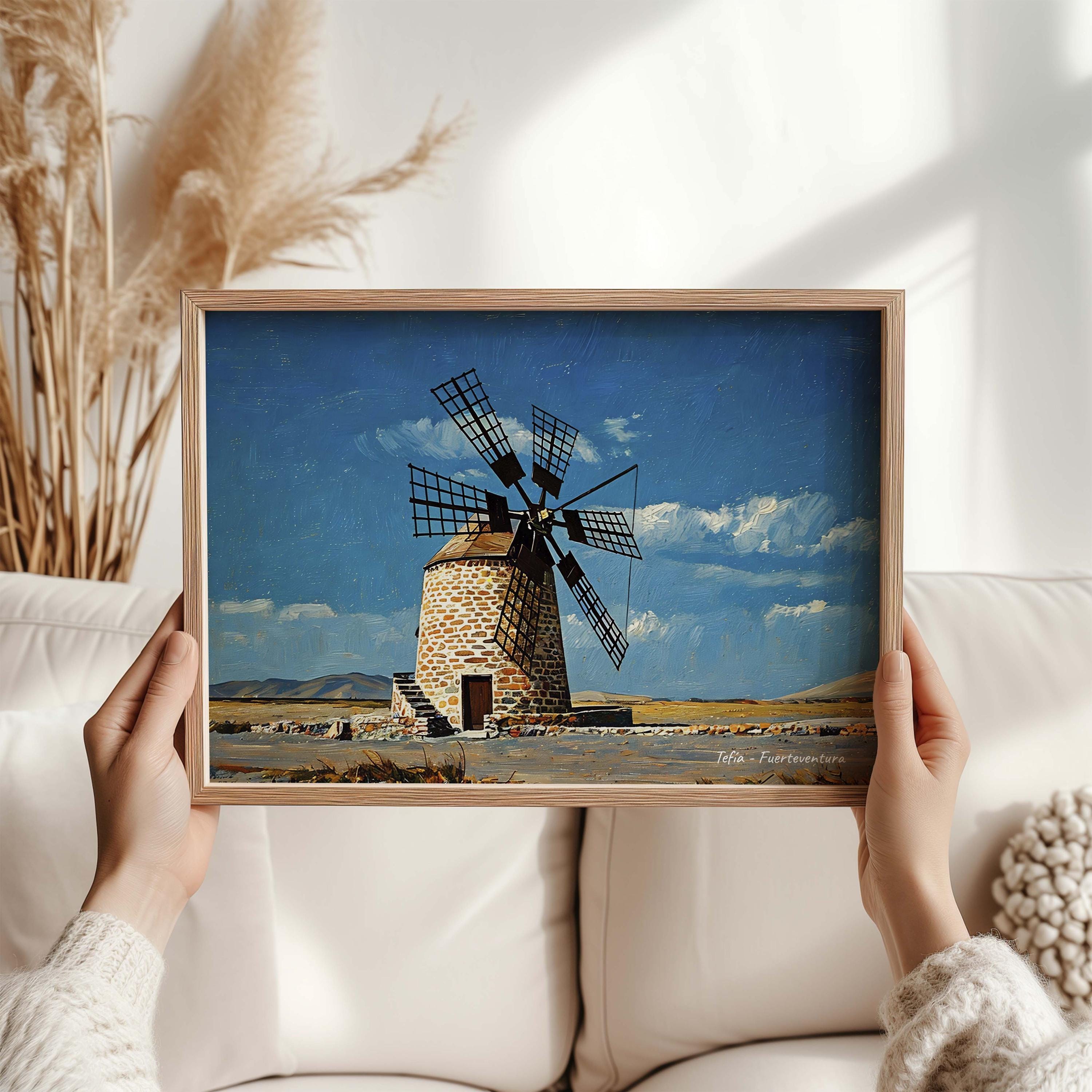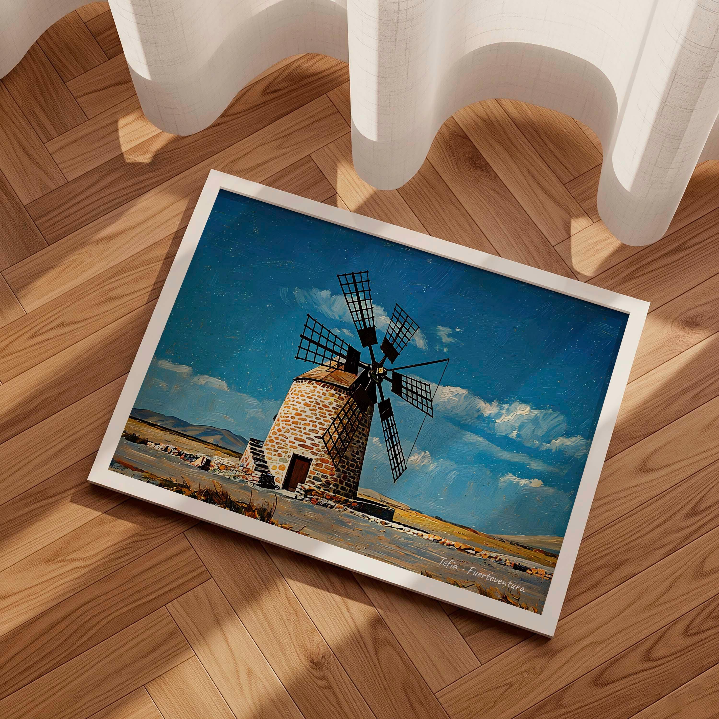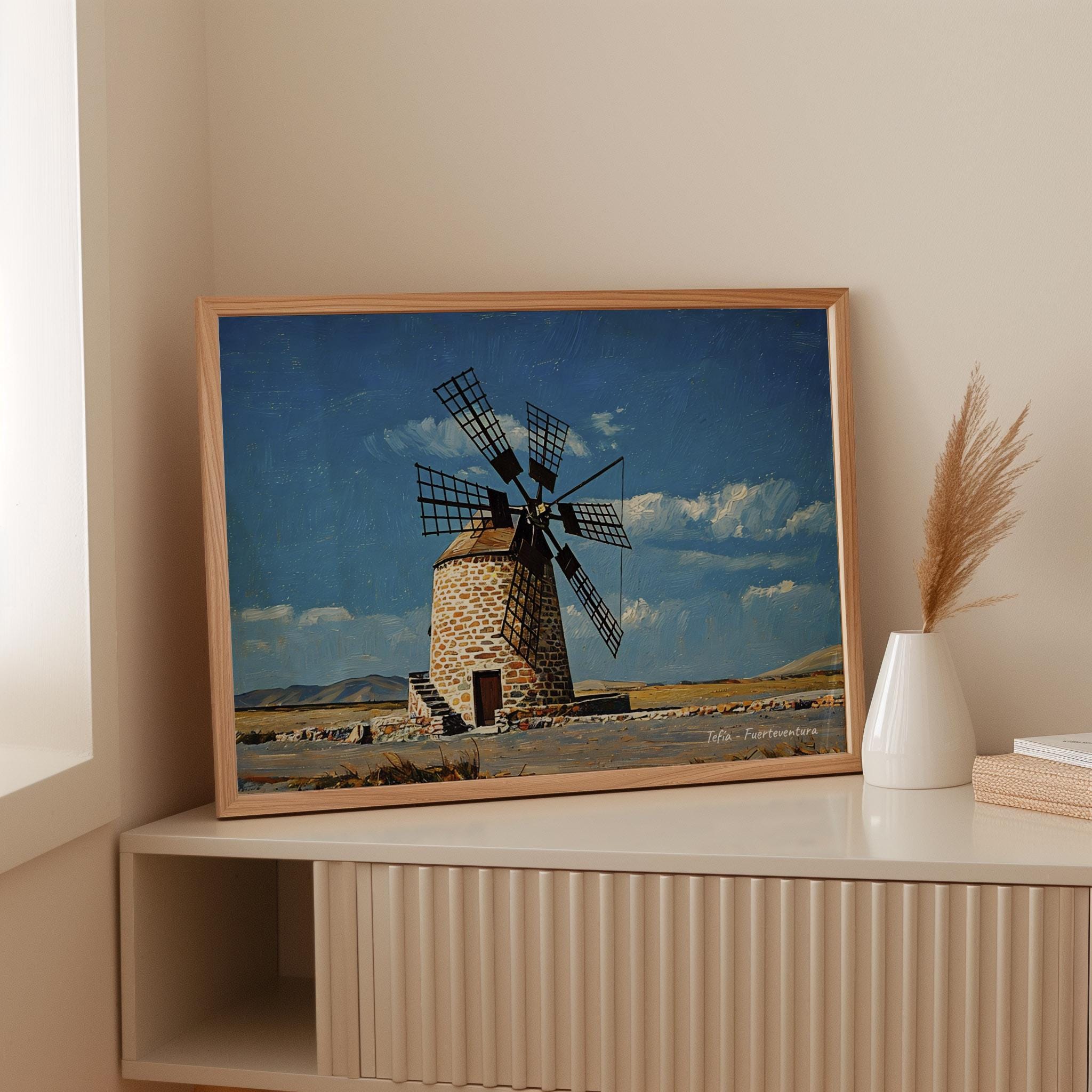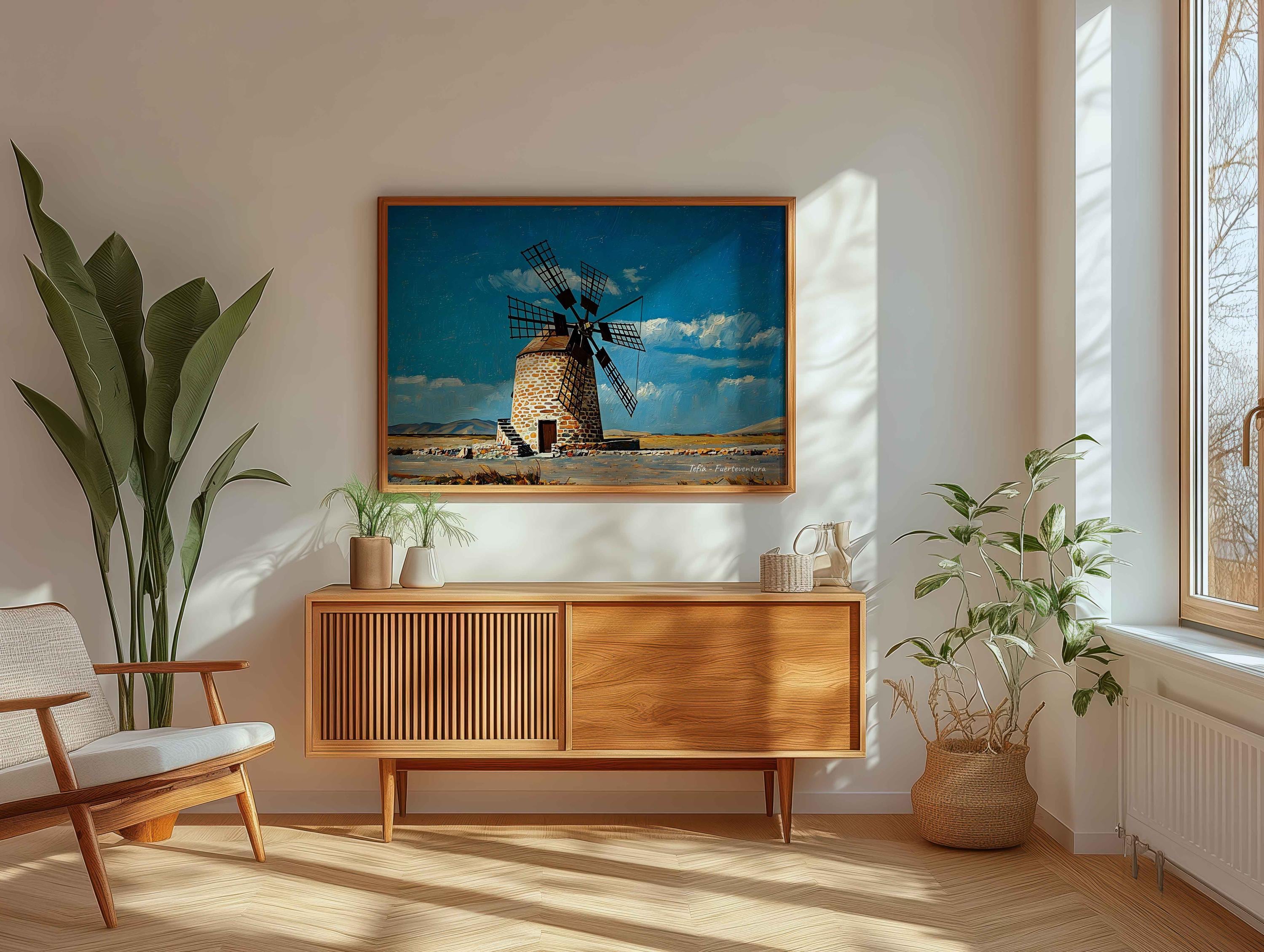 Standing alone against an open sky, this traditional windmill in Tefía captures the essence of Fuerteventura’s rural landscape. The contrast between the textured stone structure, the dark blades, and the expansive blue sky creates a composition that feels both simple and powerful.