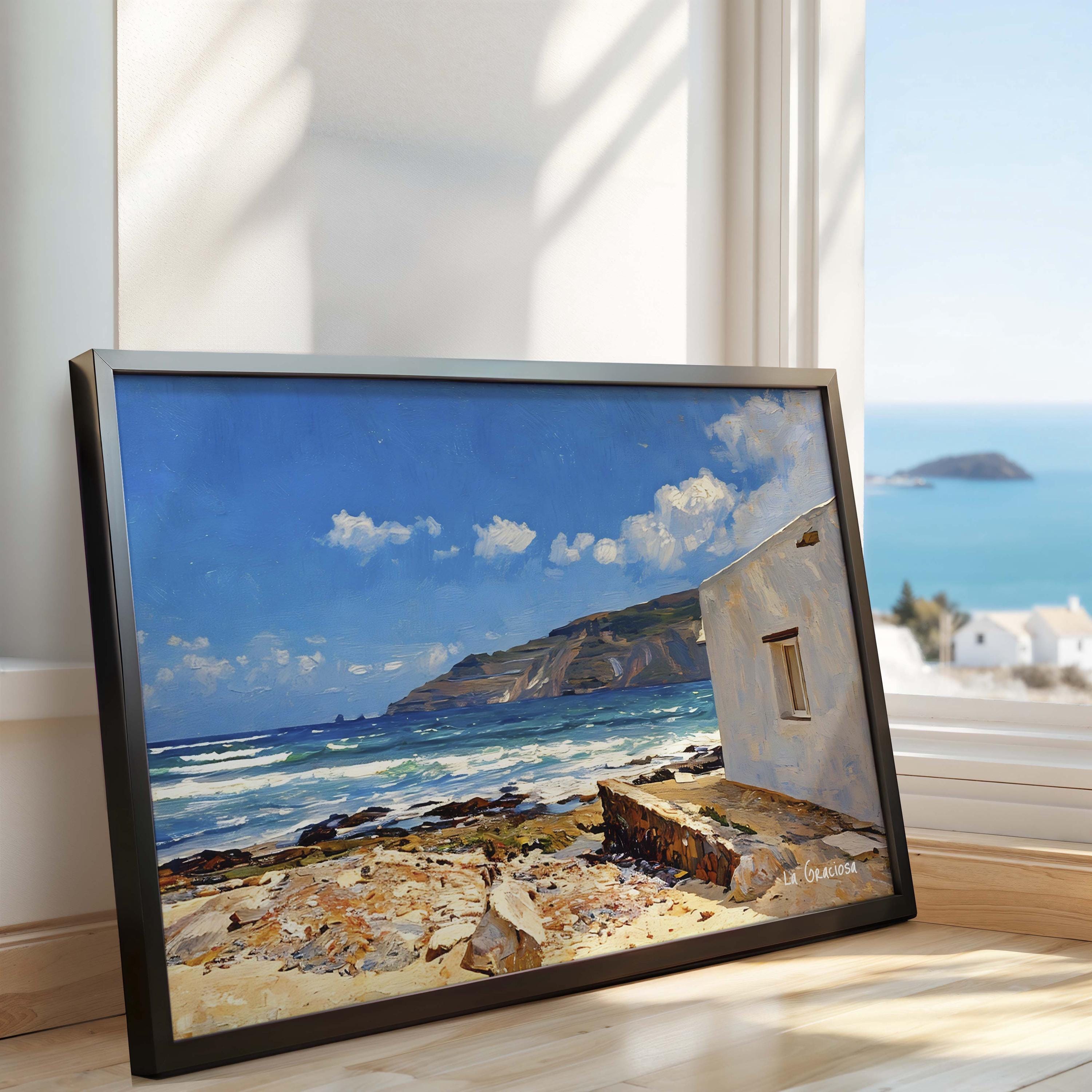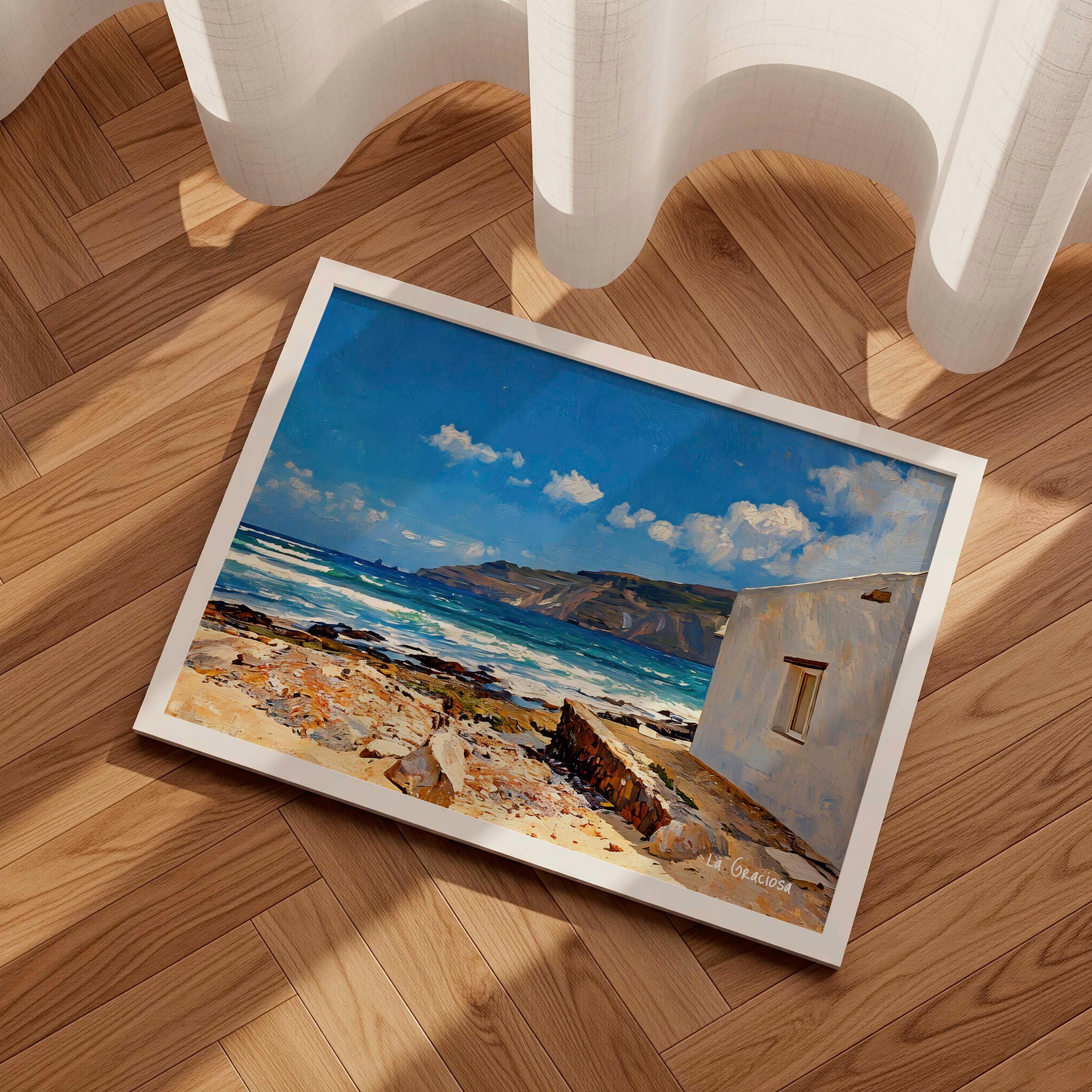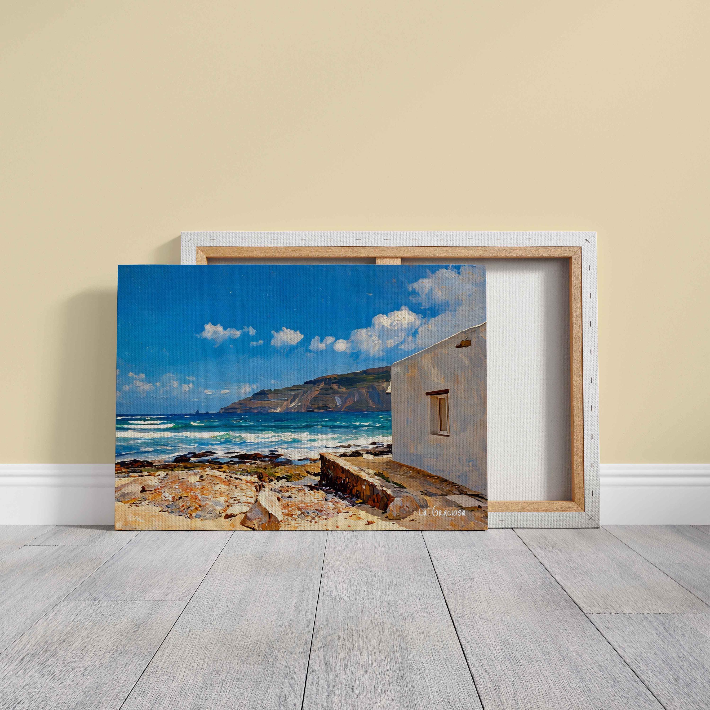 A bright coastal scene inspired by La Graciosa, where the Atlantic meets volcanic terrain under an open blue sky. The white house in the foreground contrasts with the textured shoreline and the distant cliffs, creating a balanced and inviting composition.