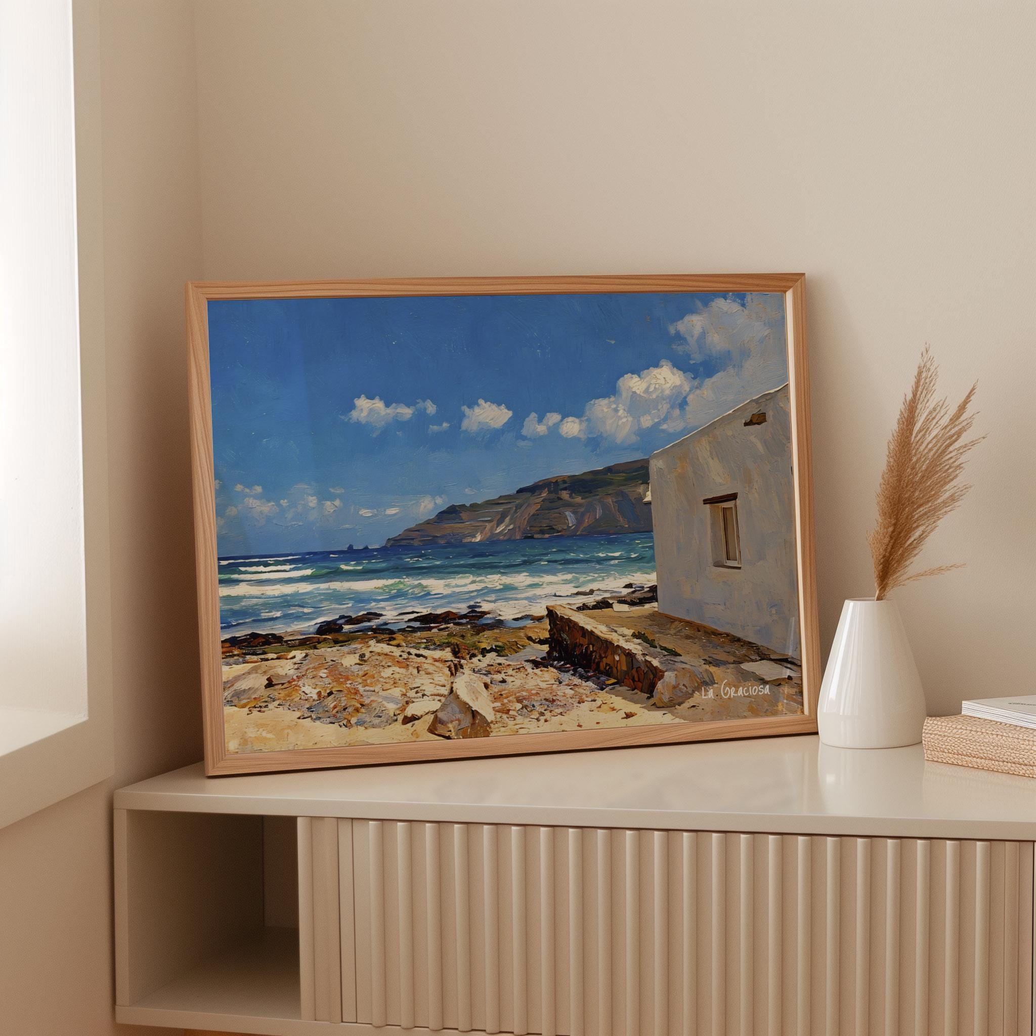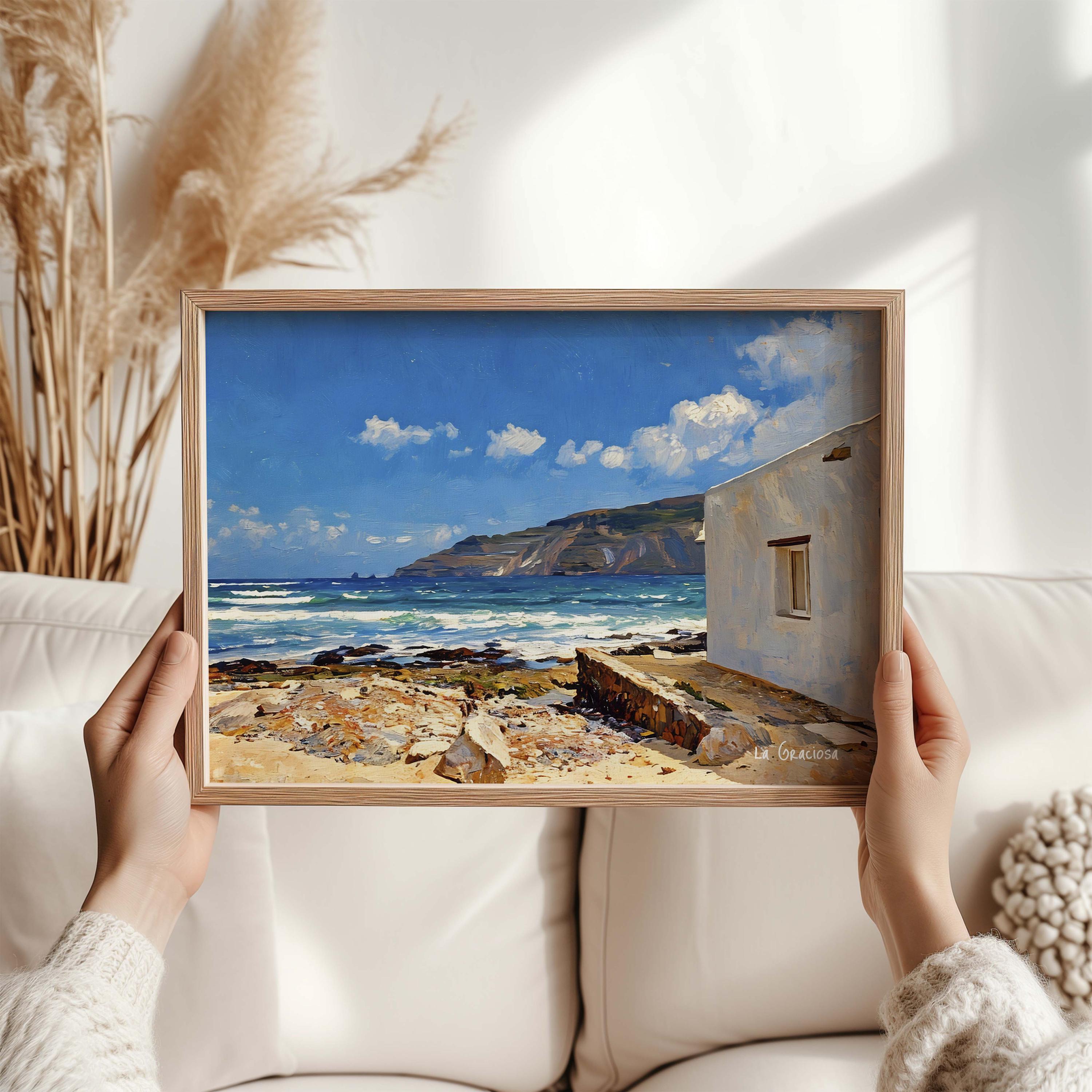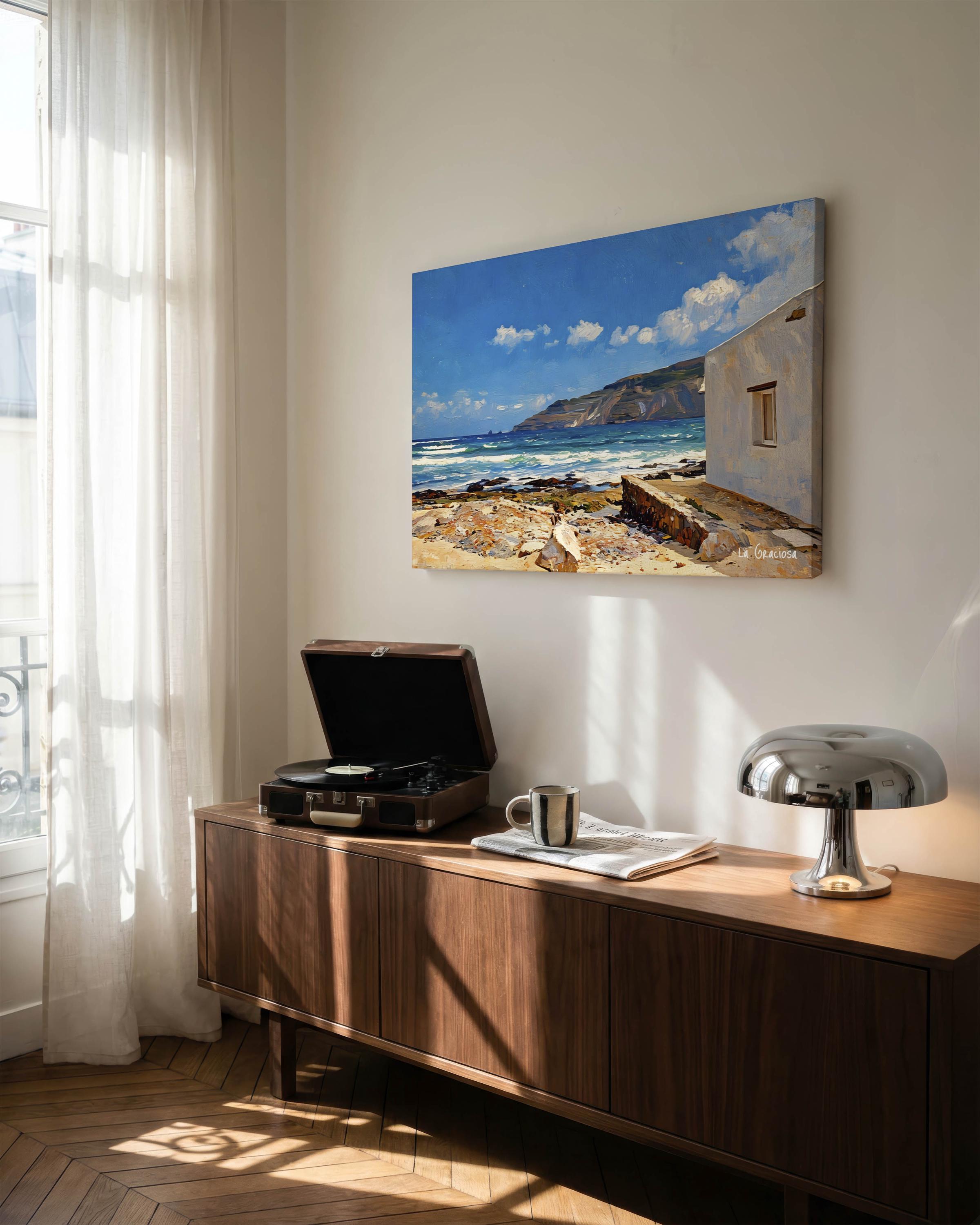A bright coastal scene inspired by La Graciosa, where the Atlantic meets volcanic terrain under an open blue sky. The white house in the foreground contrasts with the textured shoreline and the distant cliffs, creating a balanced and inviting composition.