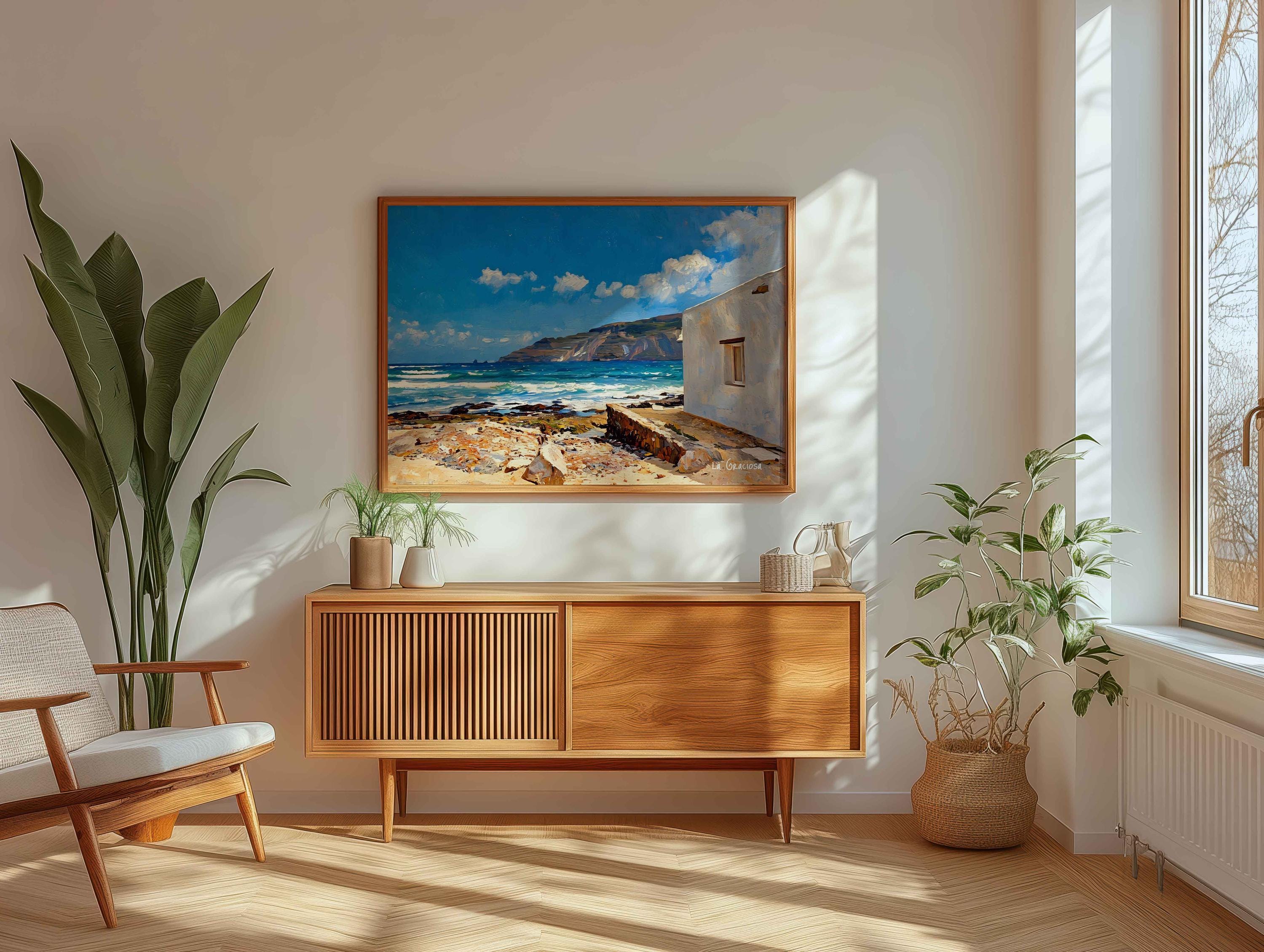This artwork captures the relaxed rhythm of island life, combining natural elements with simple architecture in a clean, harmonious way. The movement of the sea and the clarity of the light bring freshness and depth to the scene.