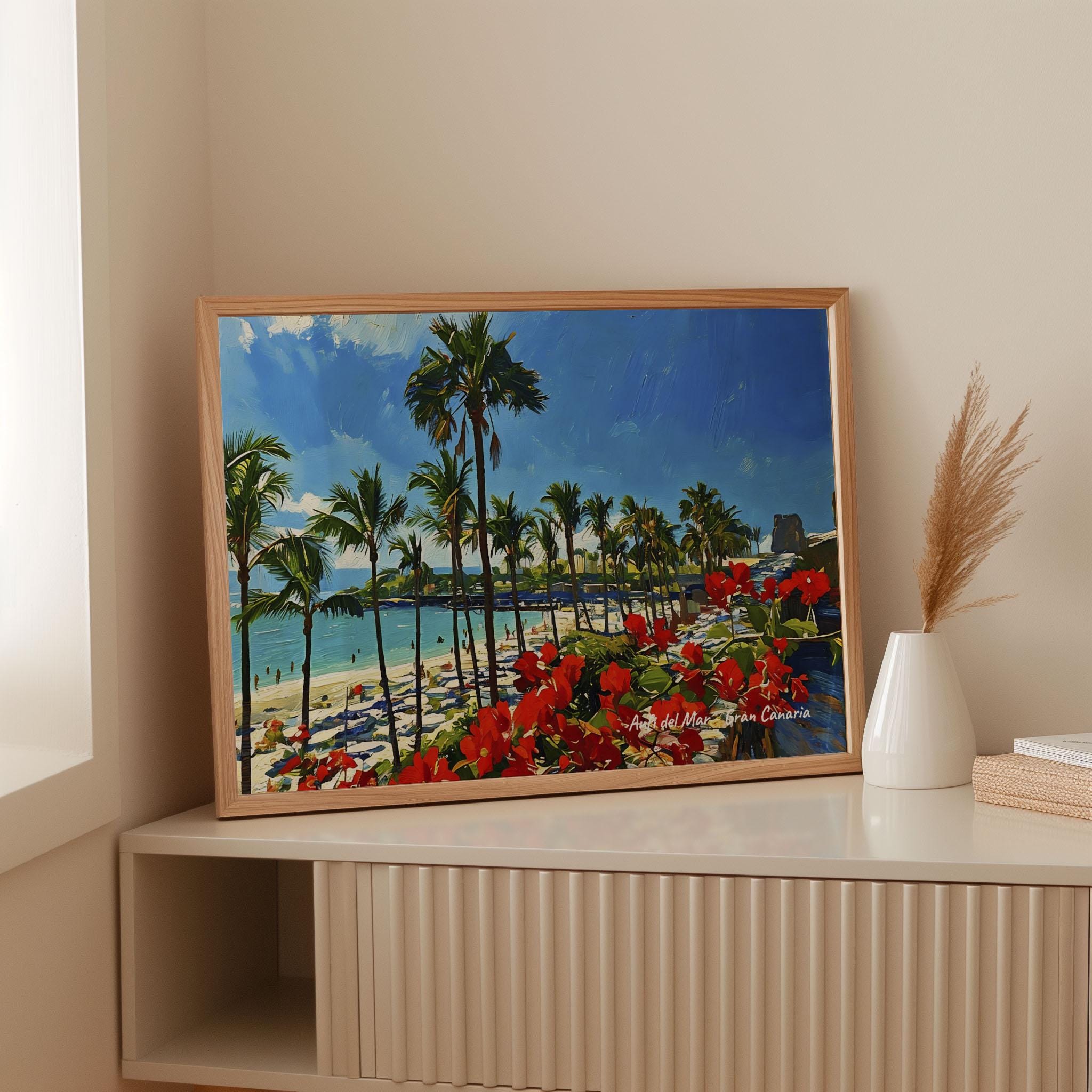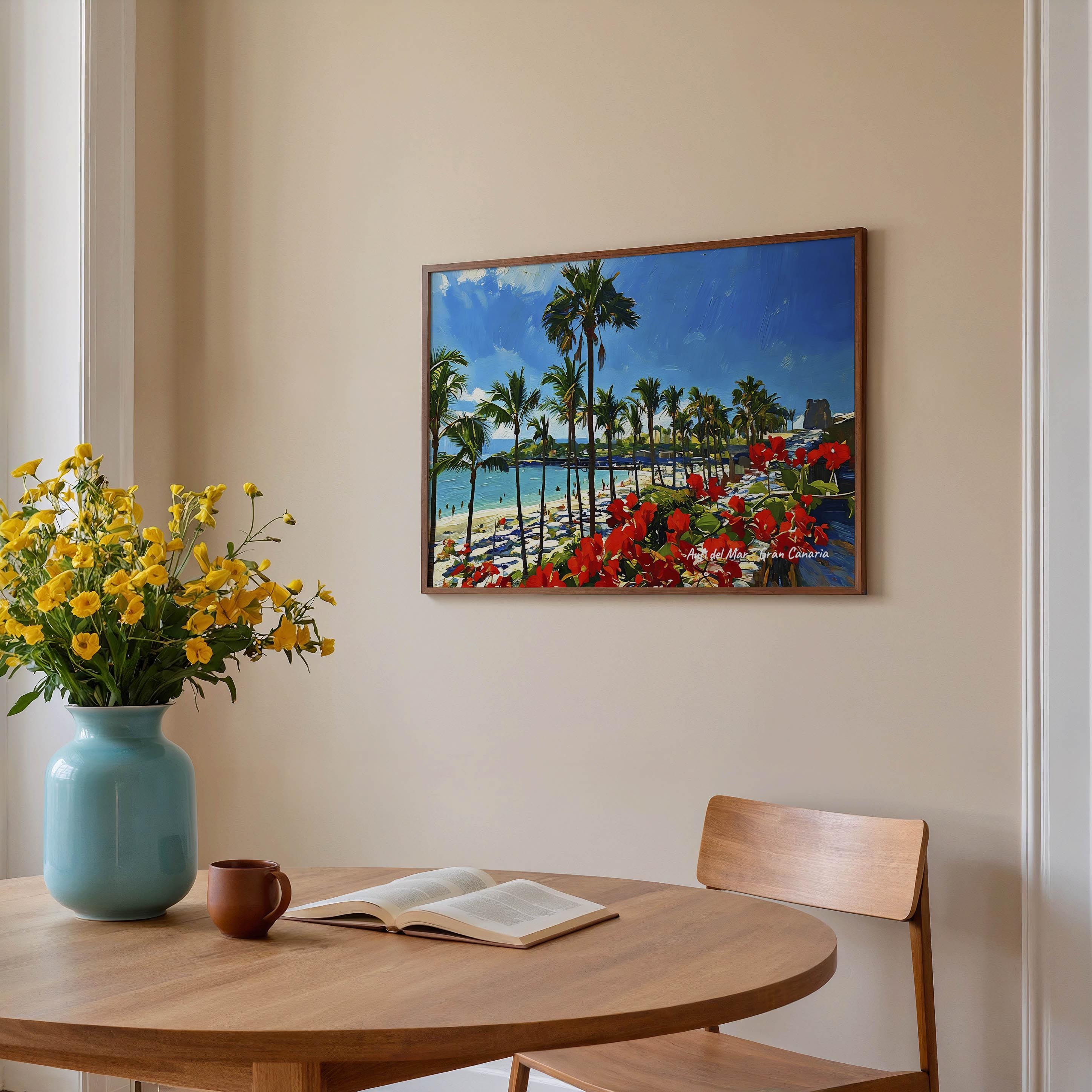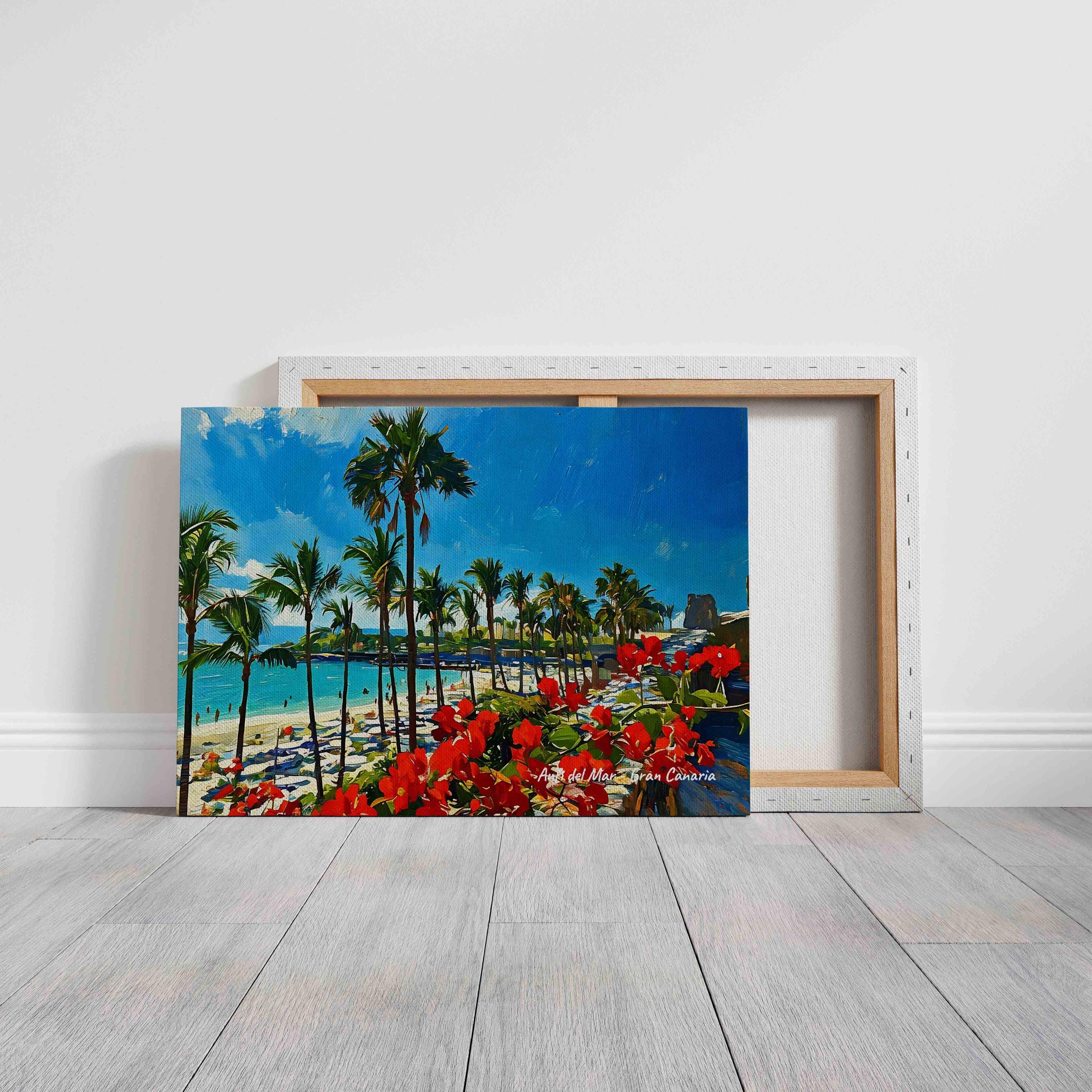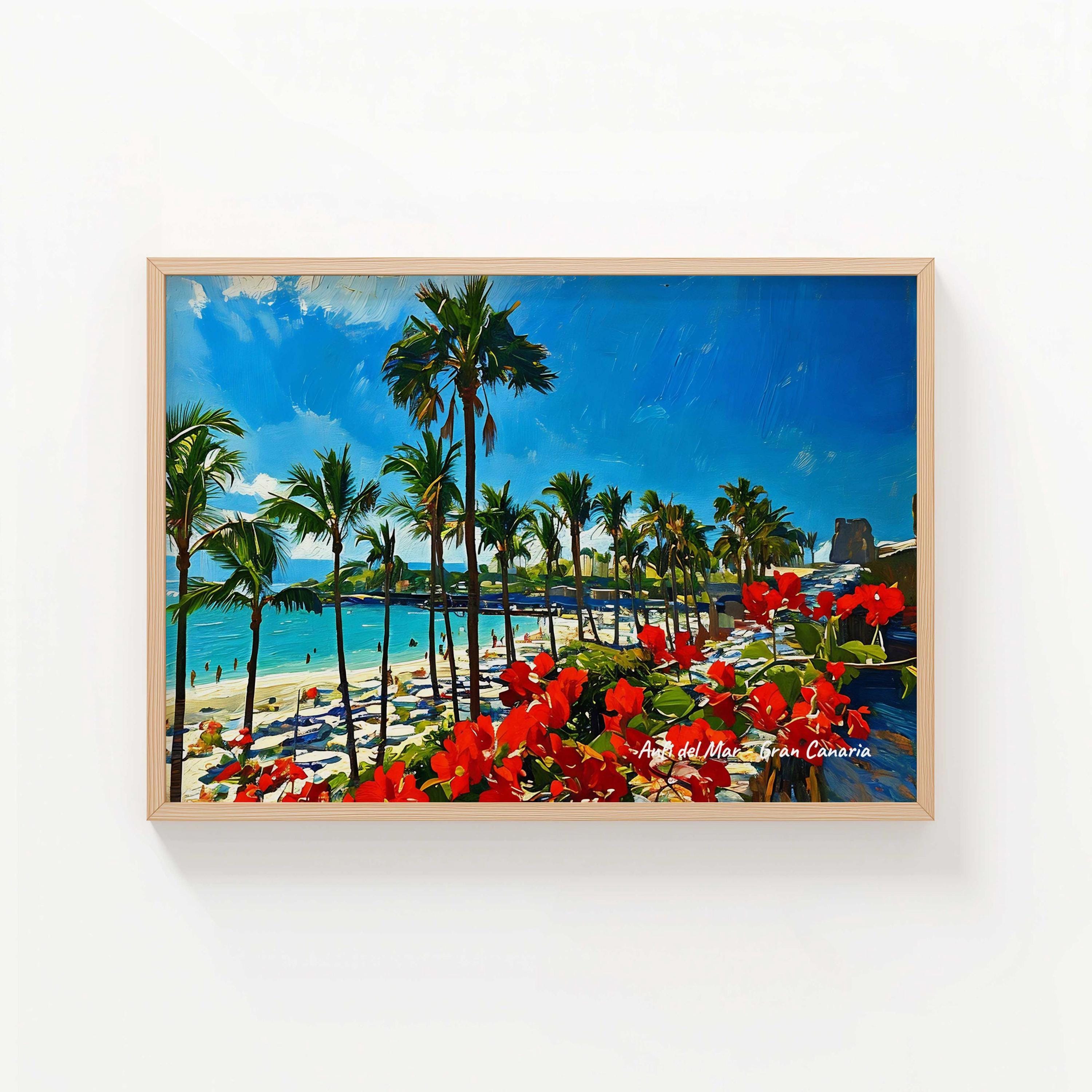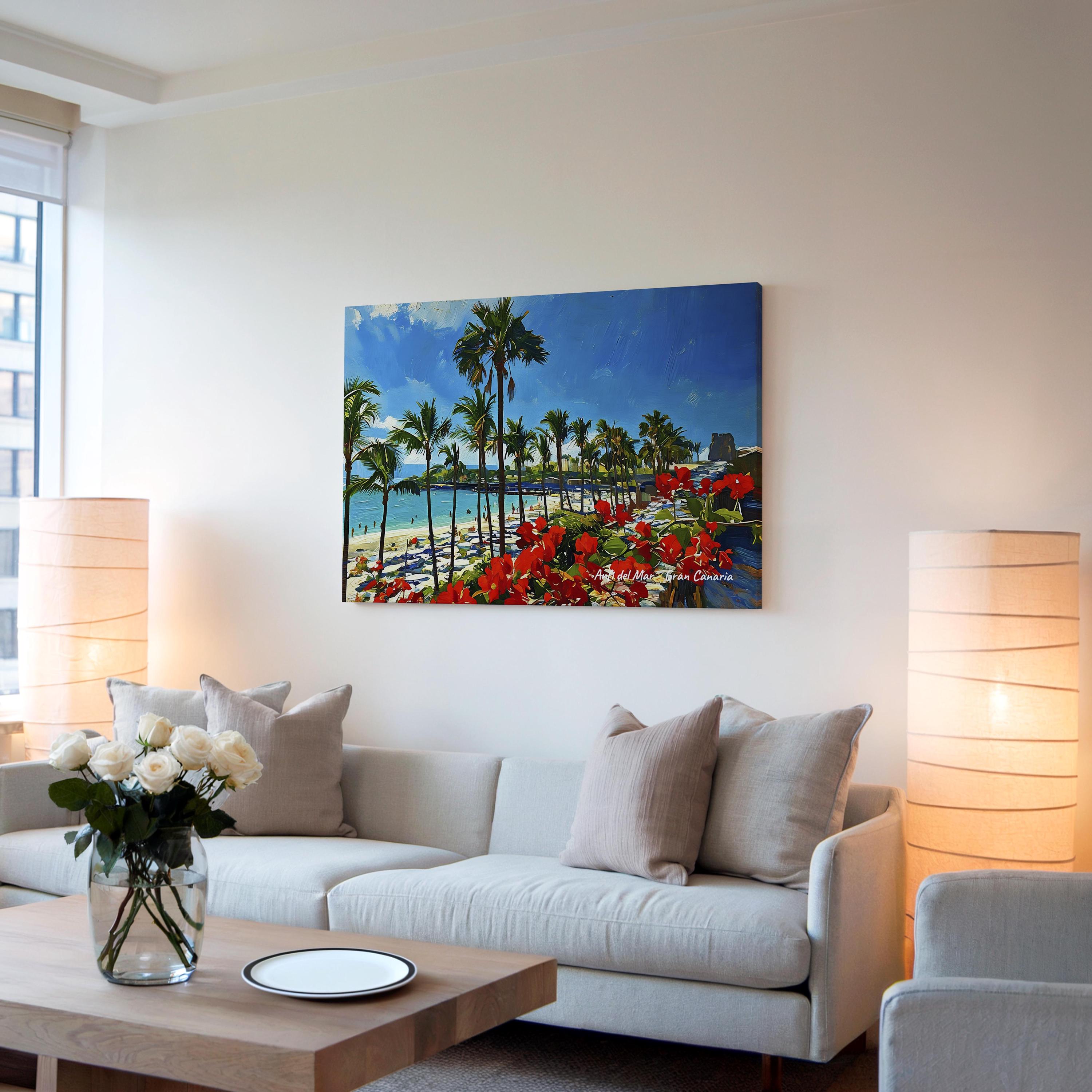 Printed on premium 100% cotton canvas, this piece brings the relaxed atmosphere of Gran Canaria’s southern coast into your home or office. The bright colors and tropical landscape create a lively wall decoration inspired by the Atlantic island lifestyle.