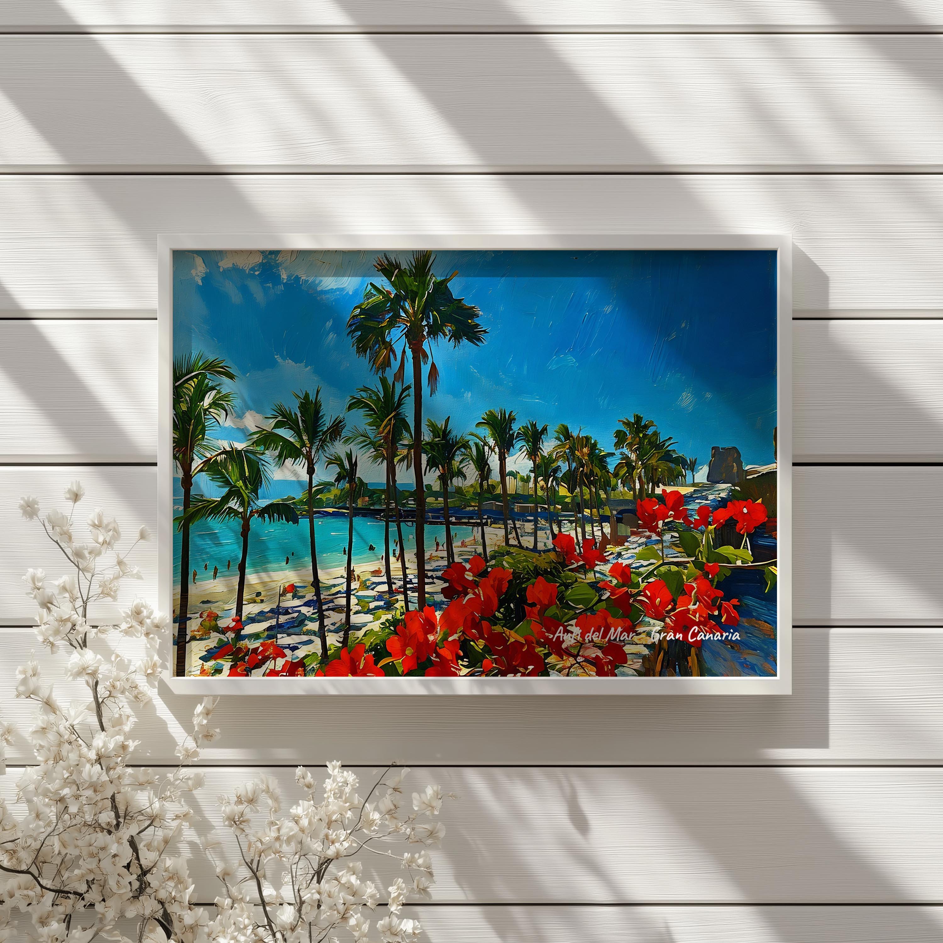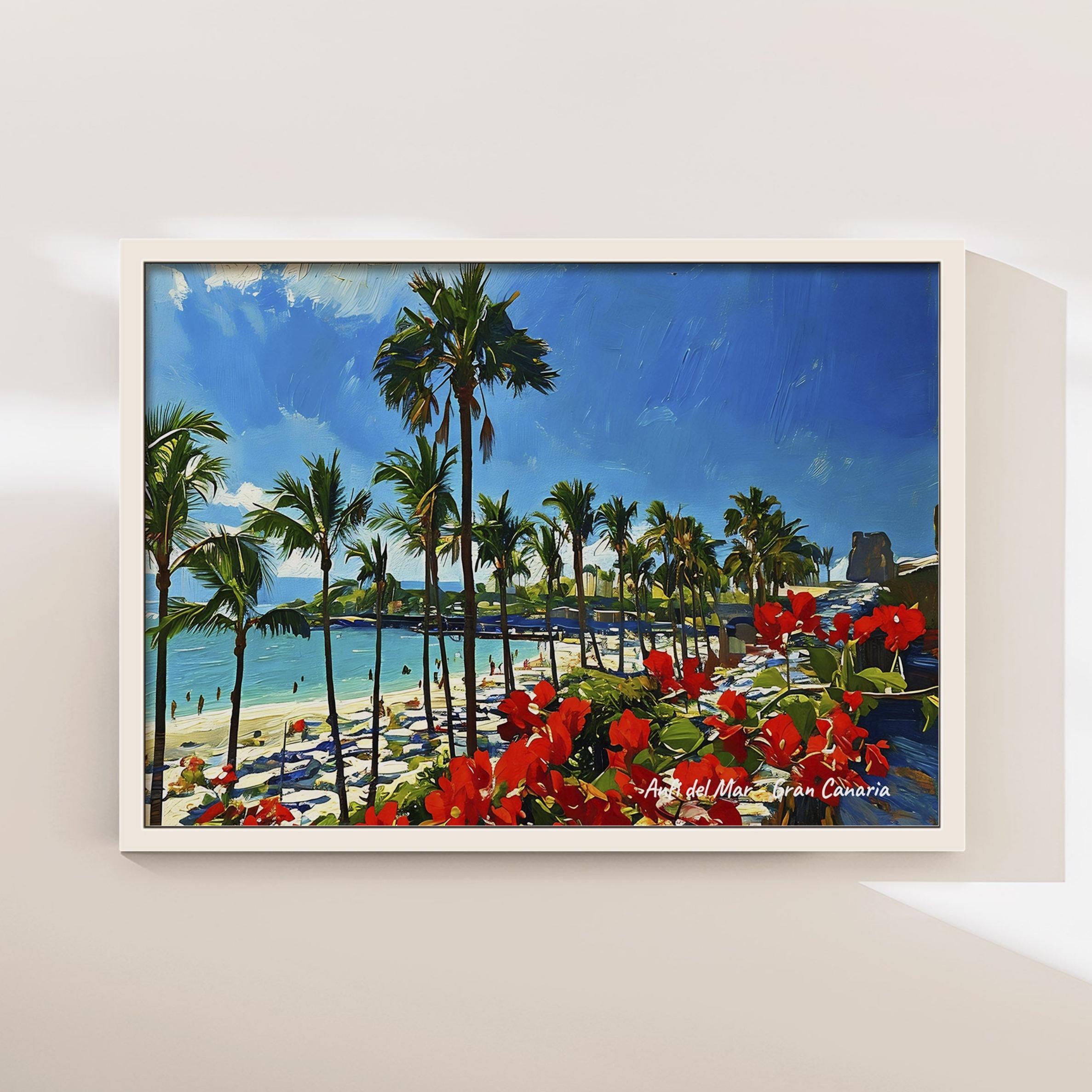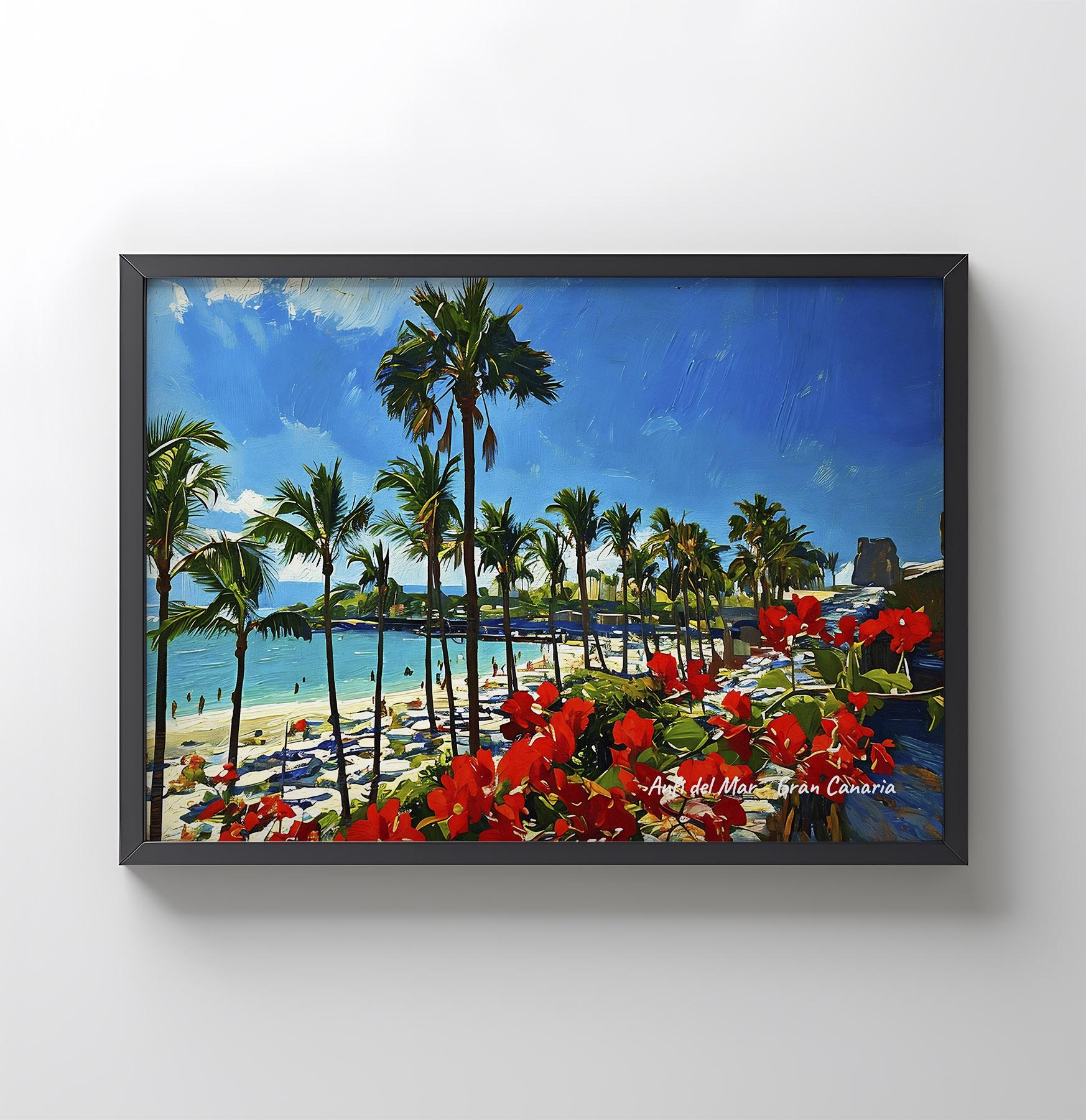 This artwork captures the tropical atmosphere of Anfi del Mar, one of the most recognizable beaches in the south of Gran Canaria. With its palm trees, turquoise water and white sand, this coastal spot reflects the sunny landscape that has made the Canary Islands a popular destination for travelers from around the world.