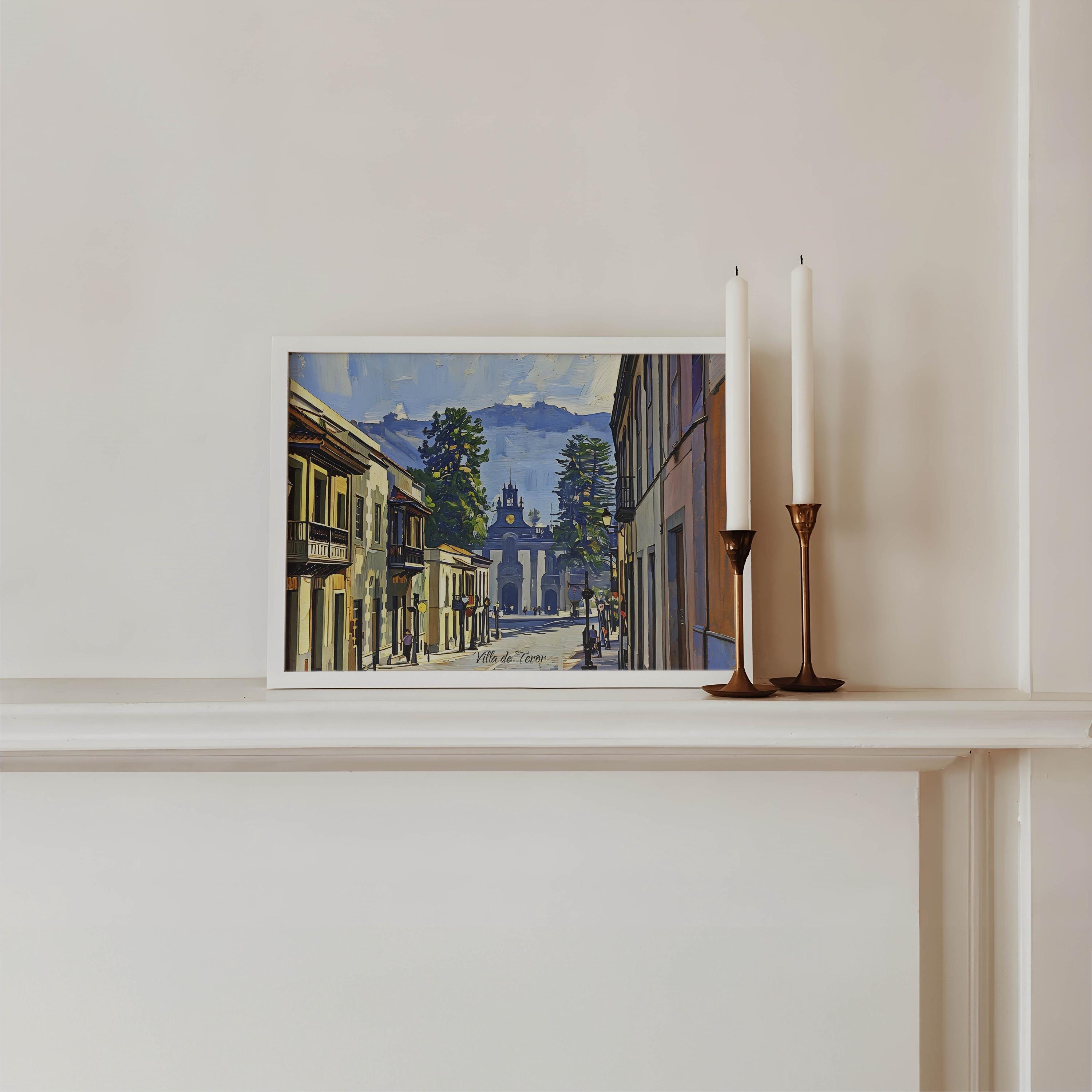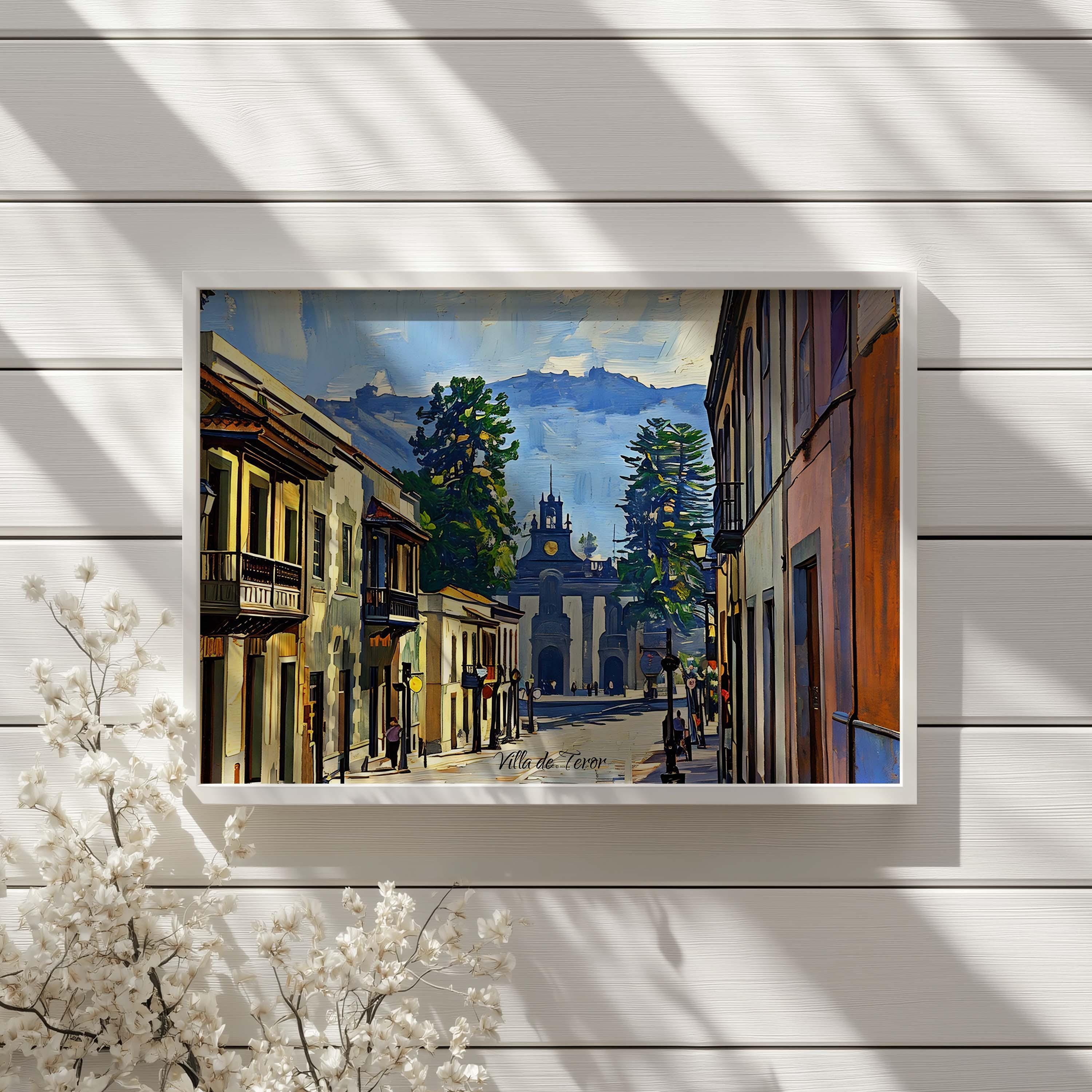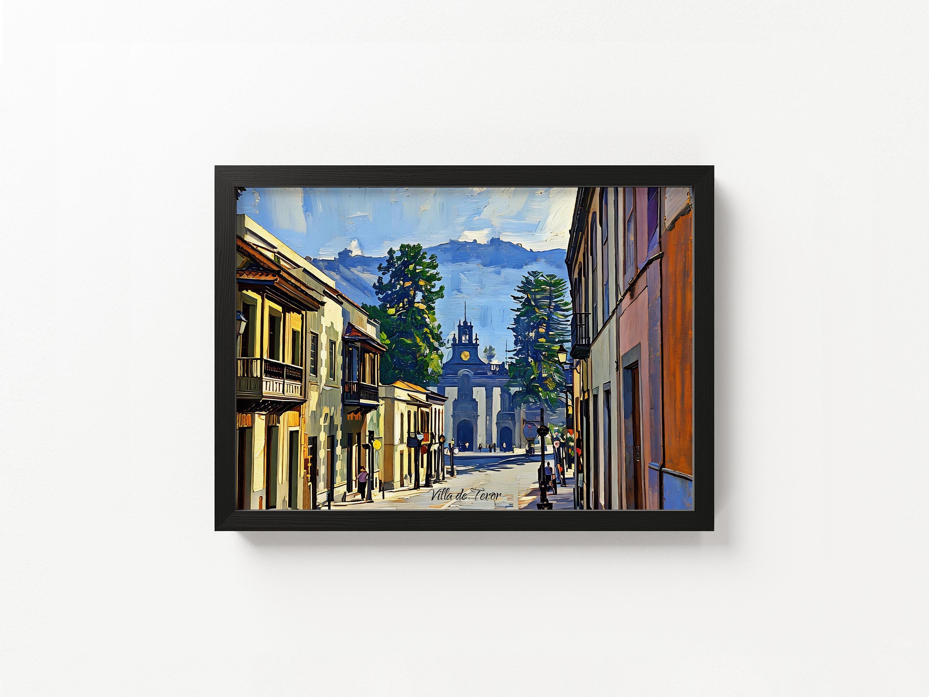 This artwork portrays the historic streets of Villa de Teror, one of the most traditional towns in Gran Canaria. The view leads toward the Basilica of Nuestra Señora del Pino, an important landmark and spiritual center of the island.