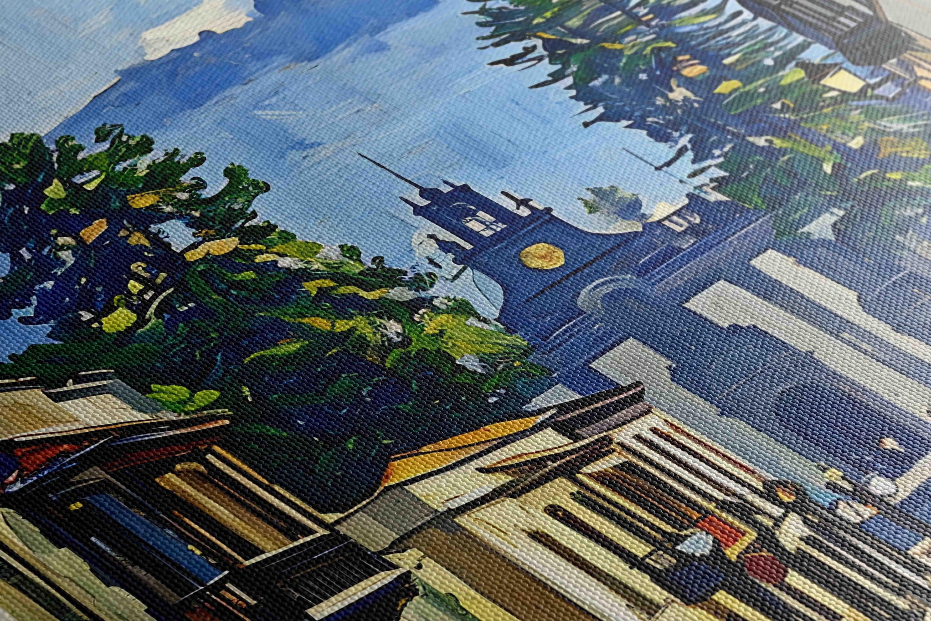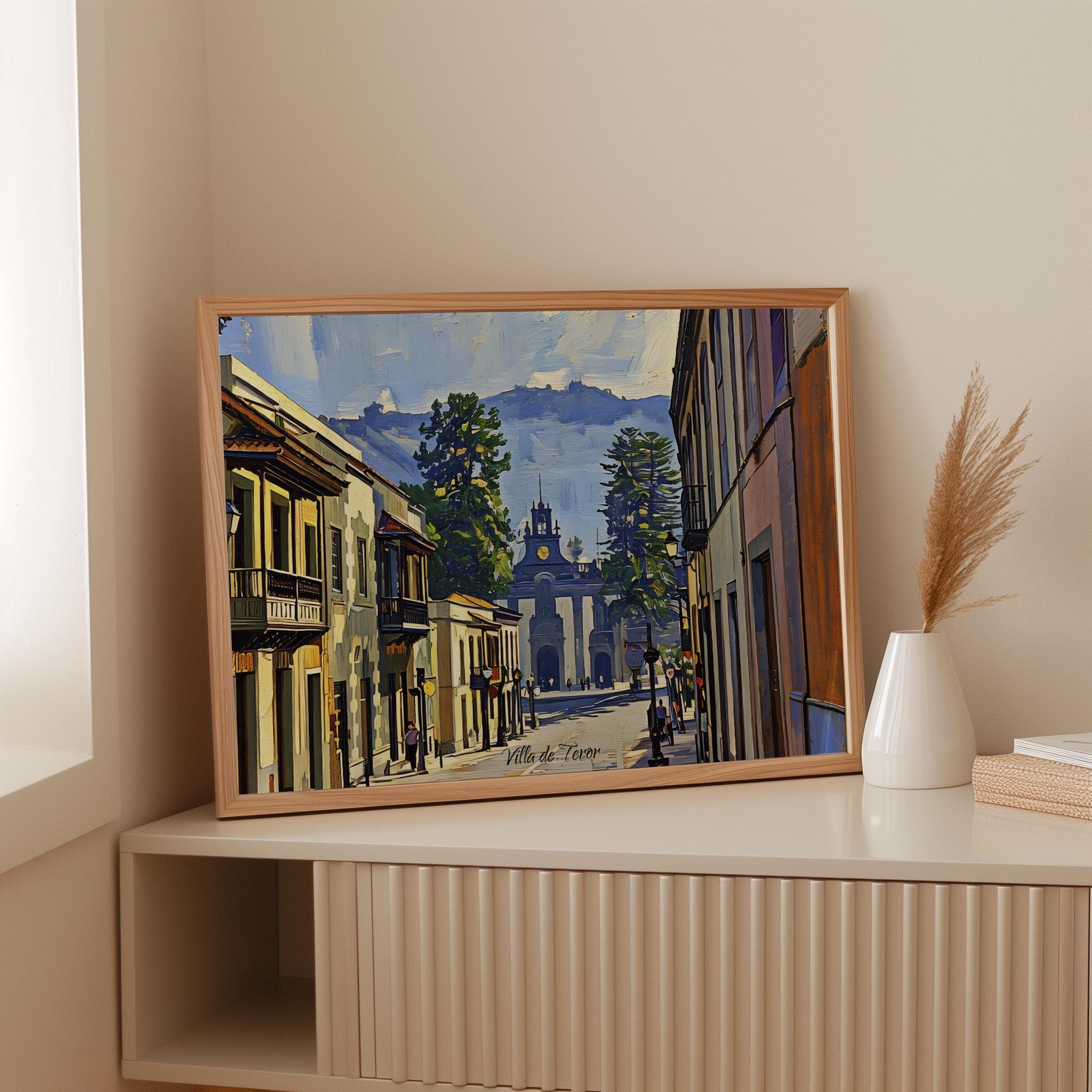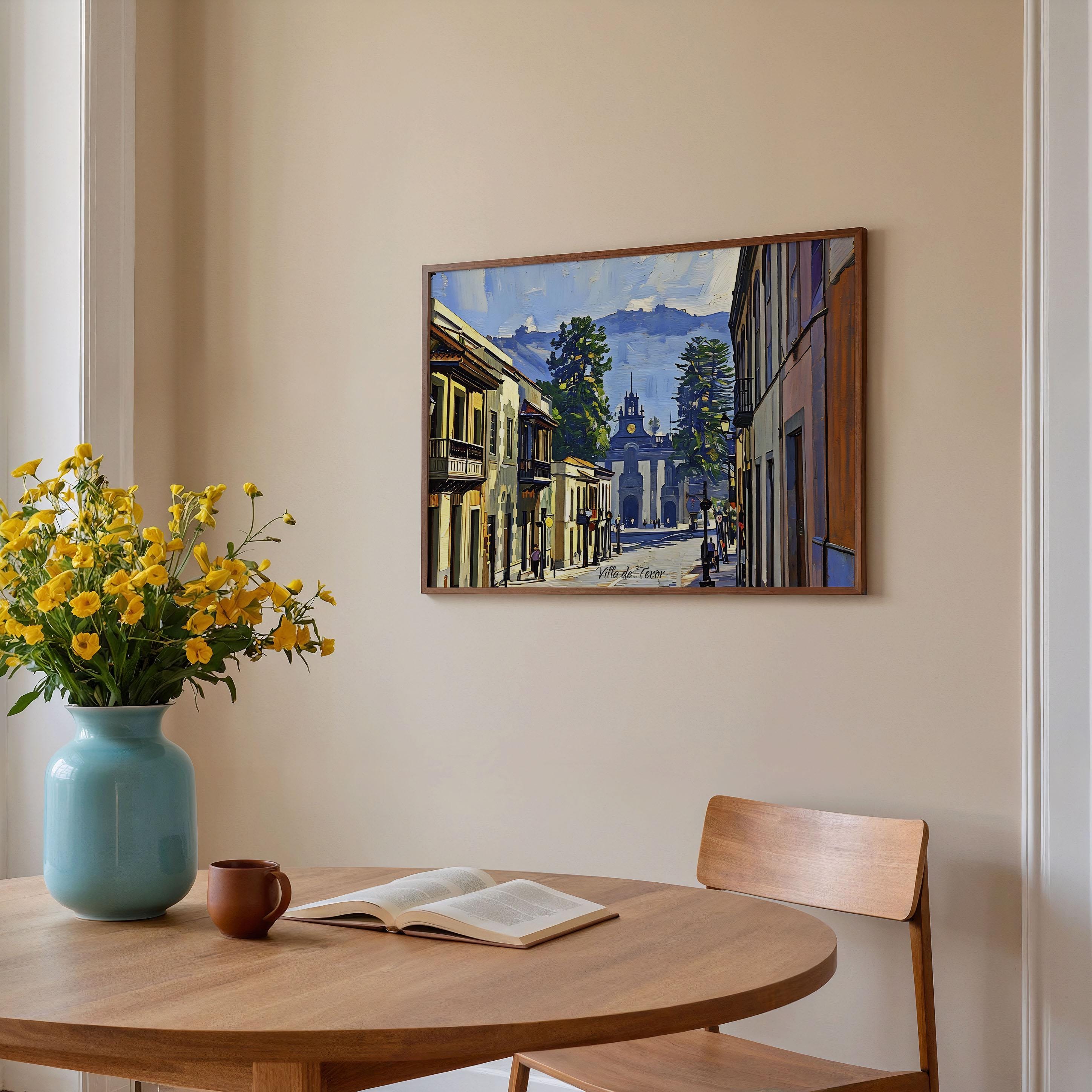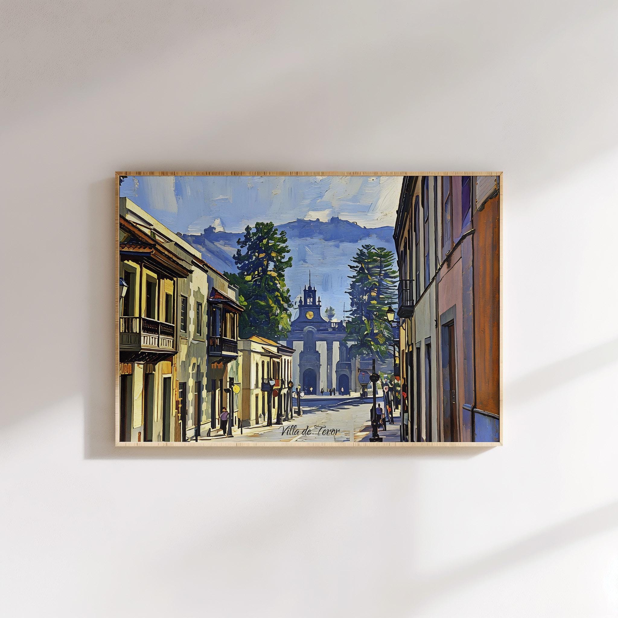 Printed on premium 100% cotton canvas, this artwork captures the atmosphere of one of the island’s most iconic villages. The perspective along the historic street, framed by traditional buildings and the basilica in the distance, creates a timeless wall decoration inspired by the cultural heritage of Gran Canaria.