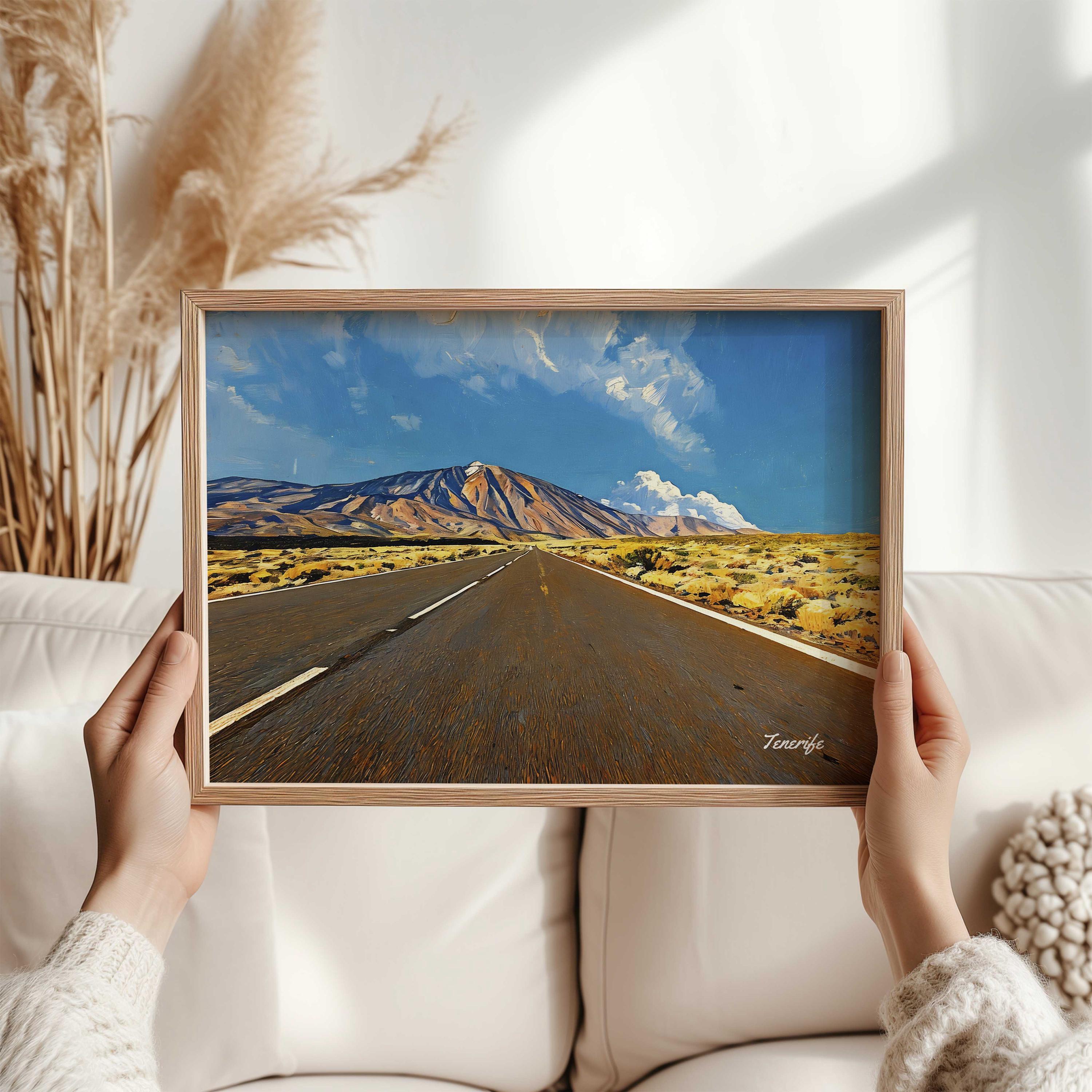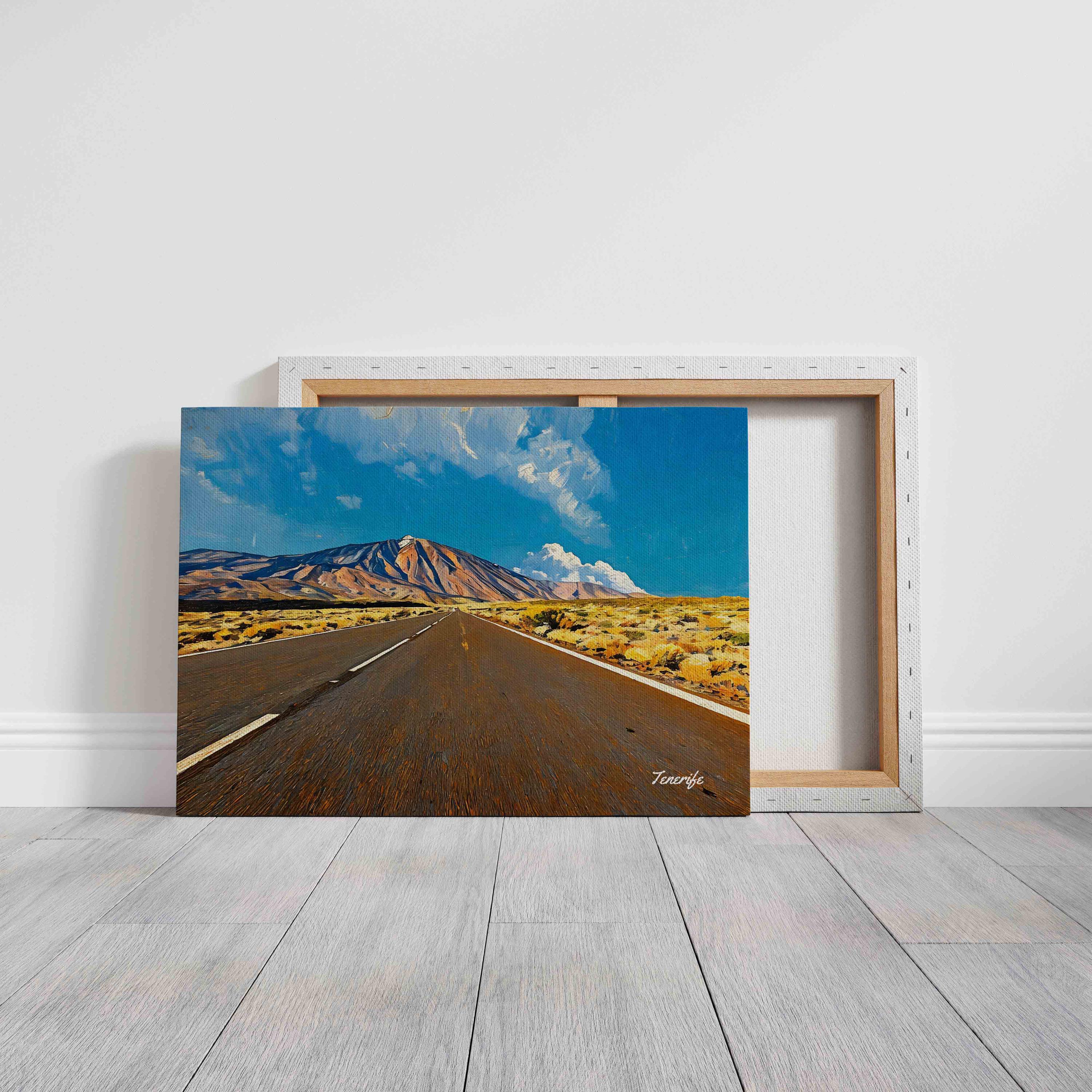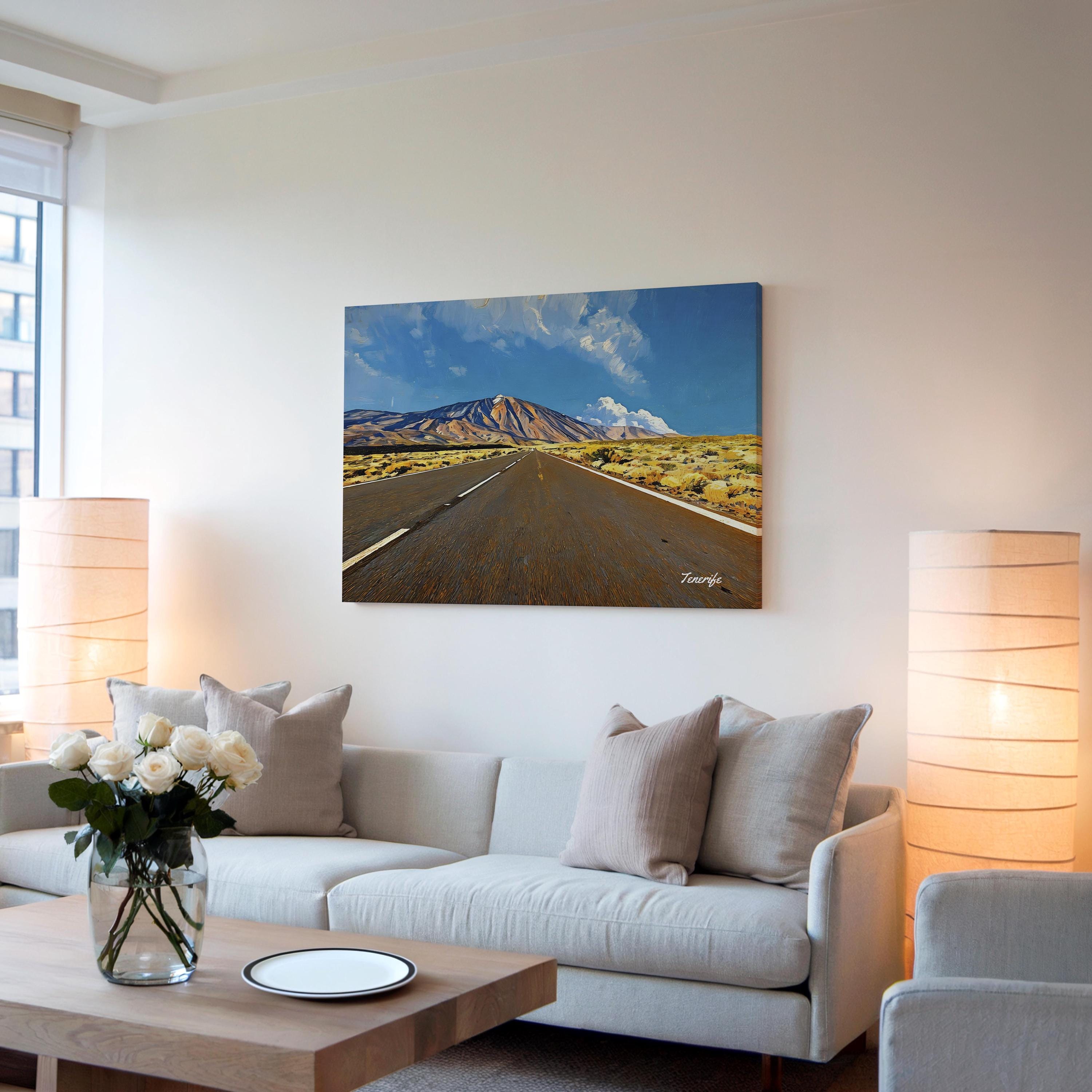 Printed on premium 100% cotton canvas, this artwork brings the powerful scenery of Tenerife into your home or office. The perspective of the road leading toward the volcano creates depth and movement, making it a striking wall decoration inspired by the volcanic landscapes of the Canary Islands.