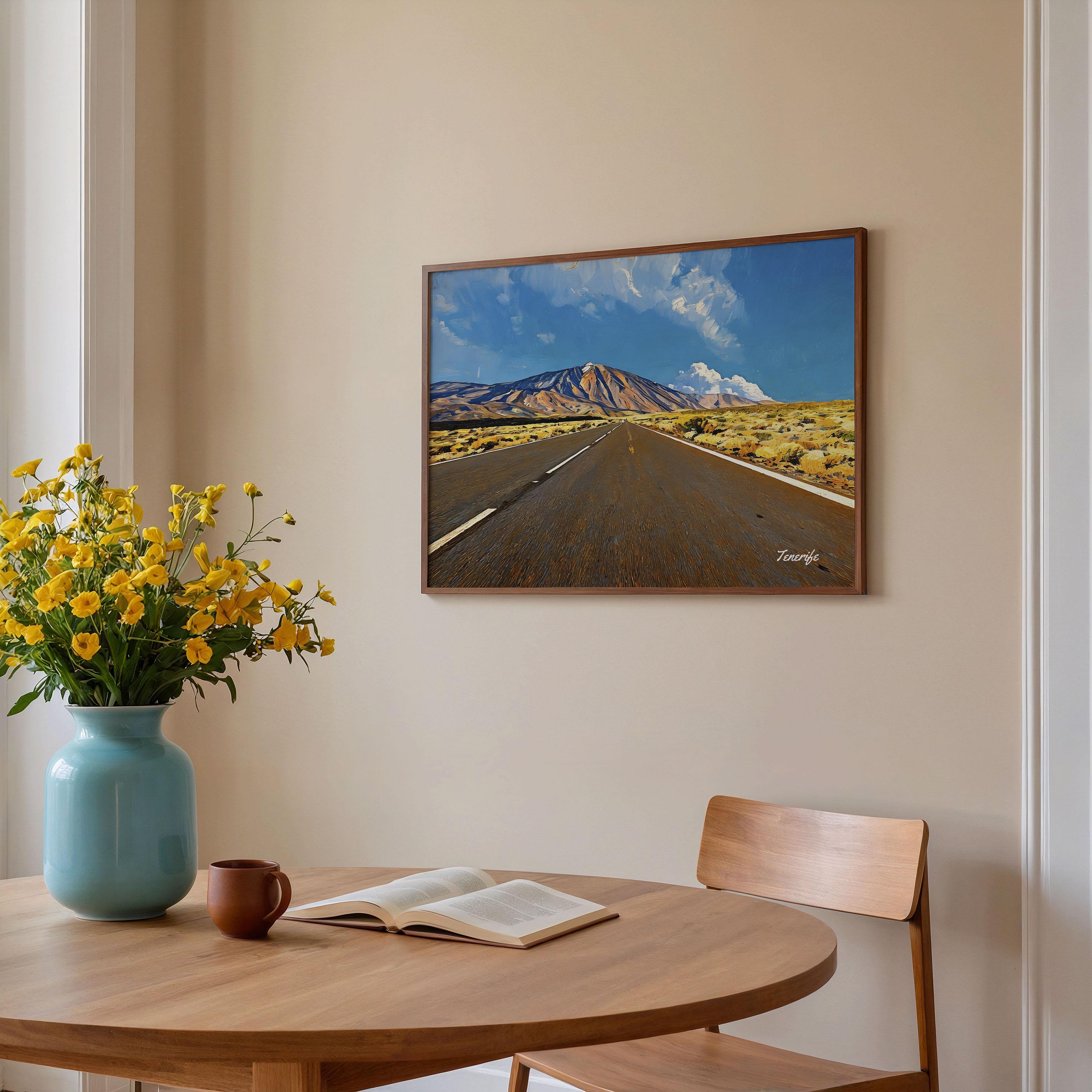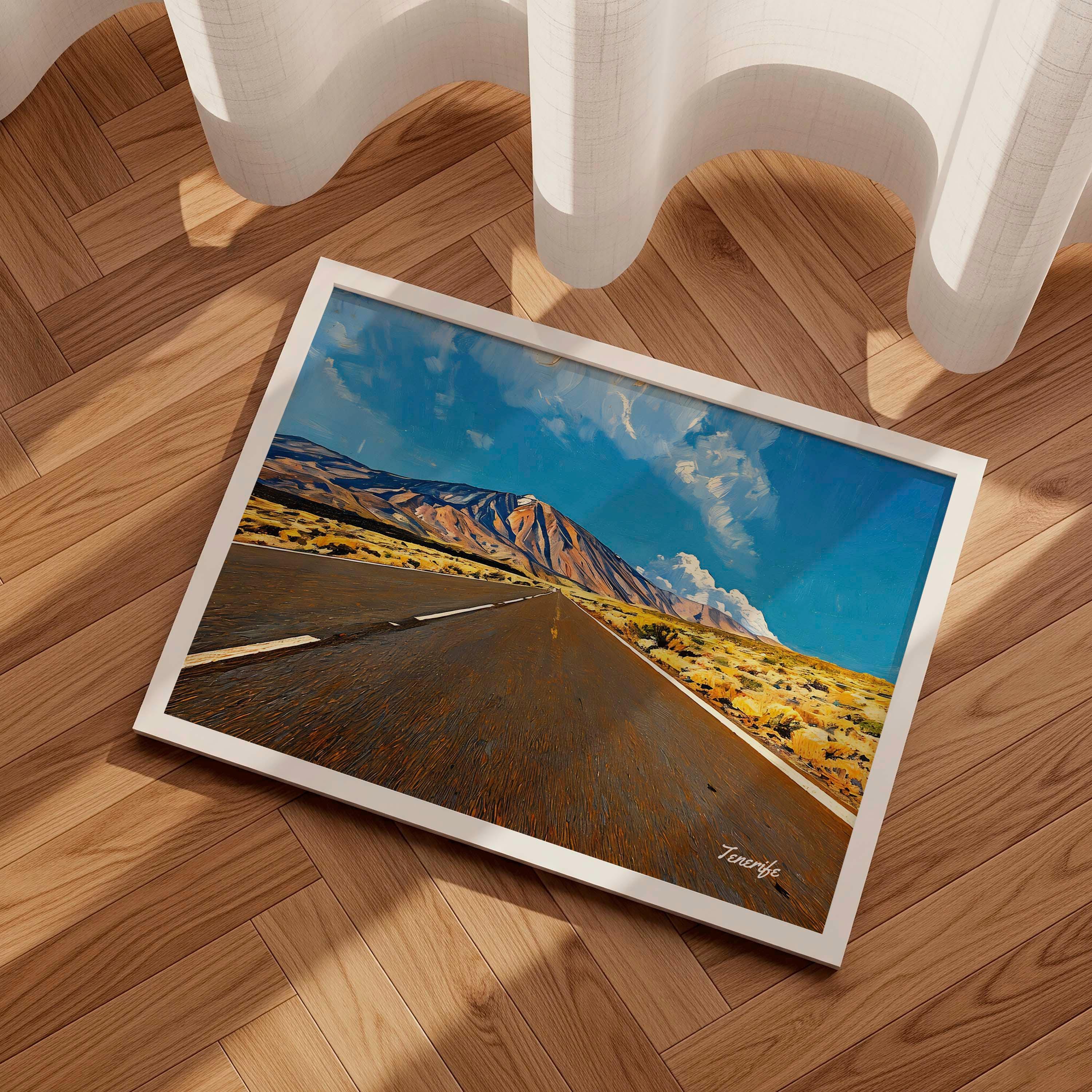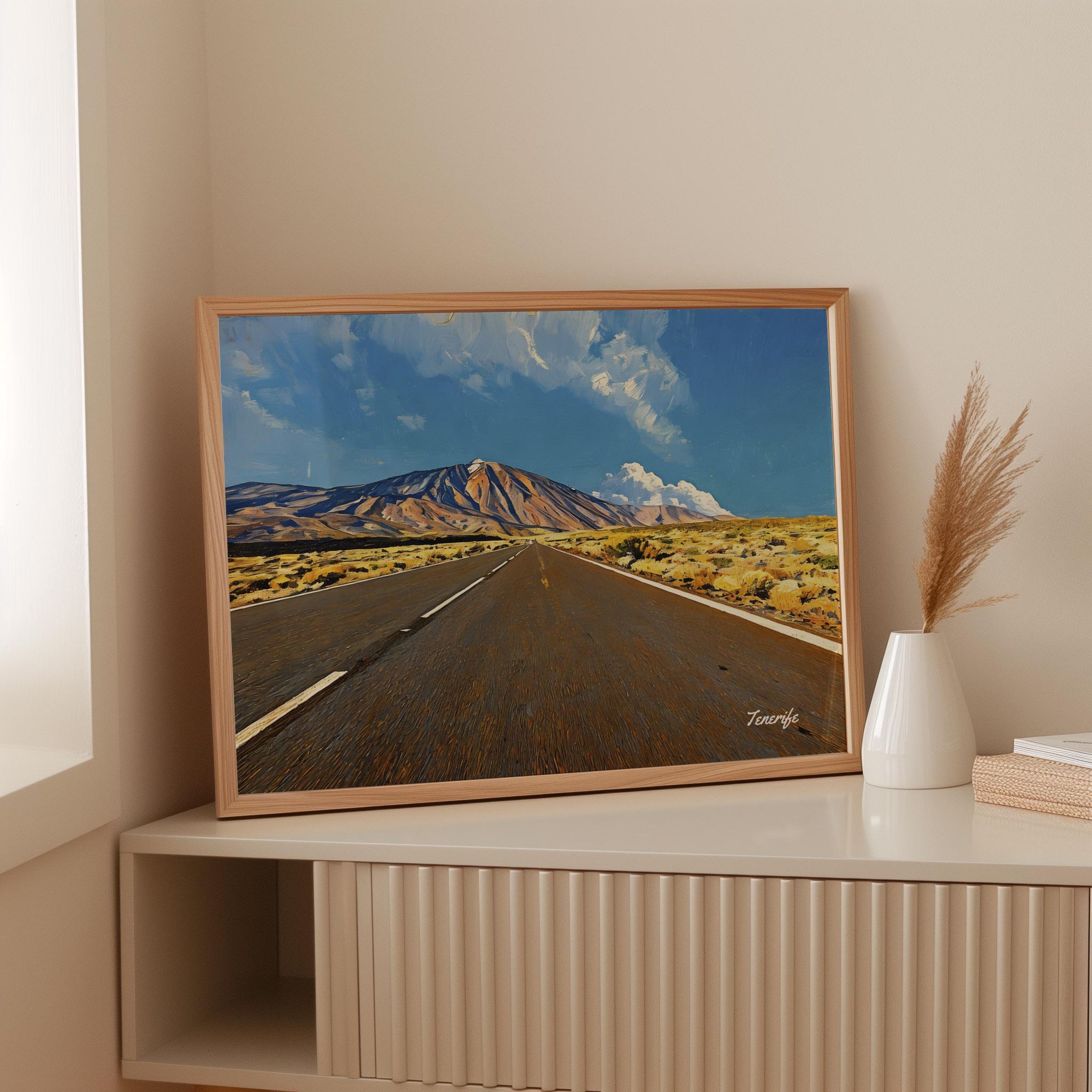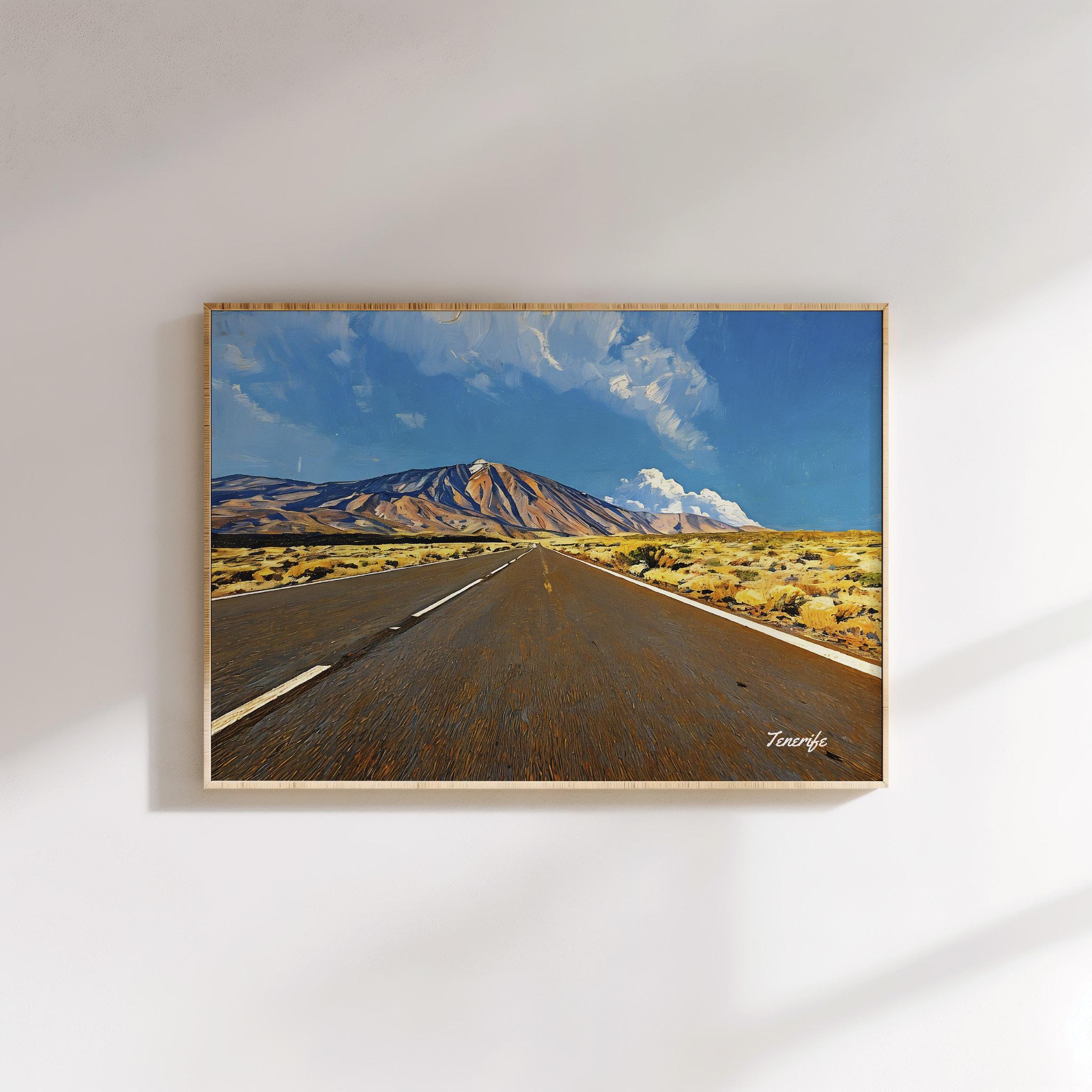 This artwork captures the dramatic road leading through Teide National Park in Tenerife, one of the most remarkable volcanic landscapes in the Canary Islands. The long road stretches across the open terrain toward Mount Teide, Spain’s highest peak and the dominant natural landmark of the island.