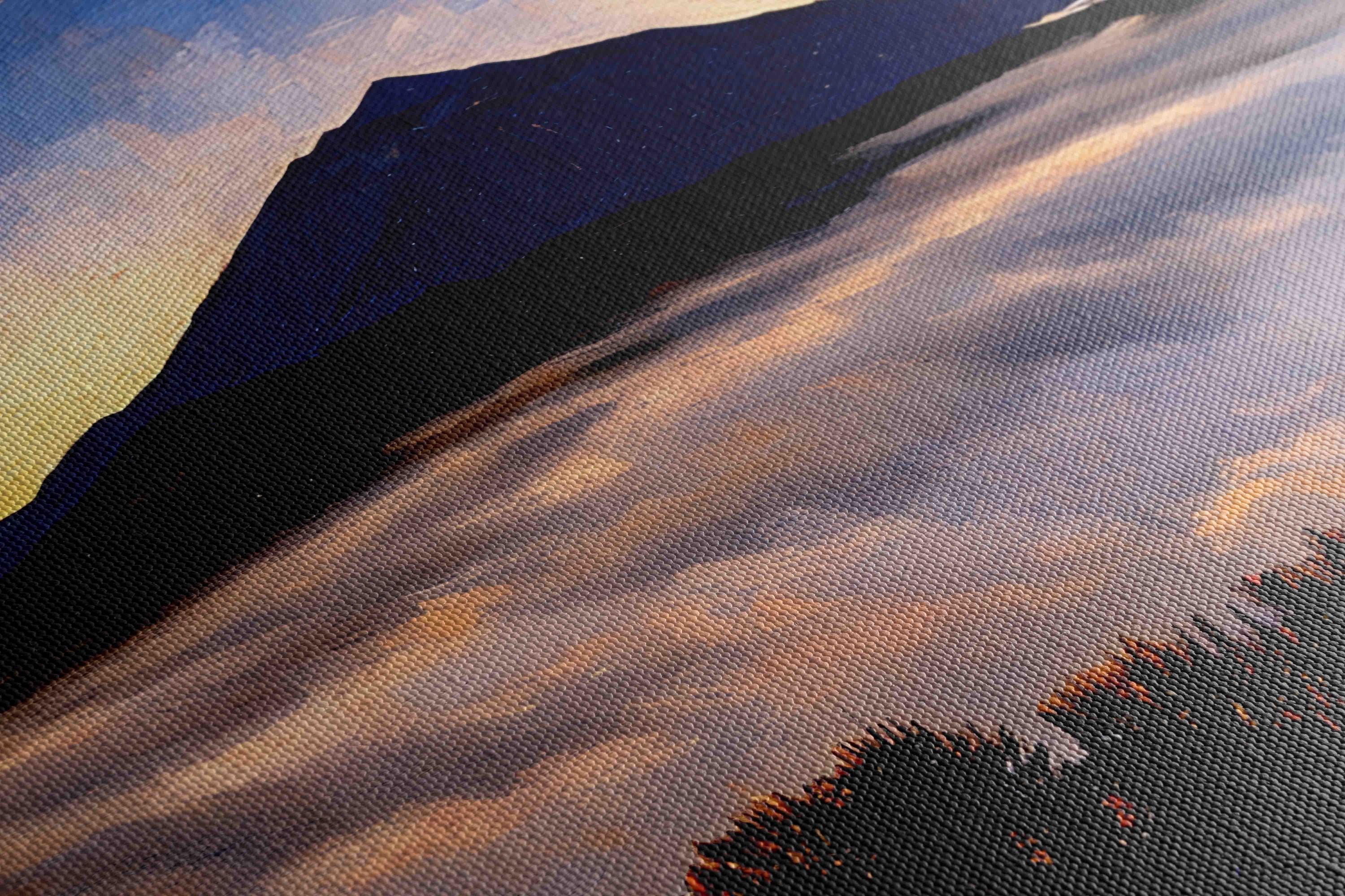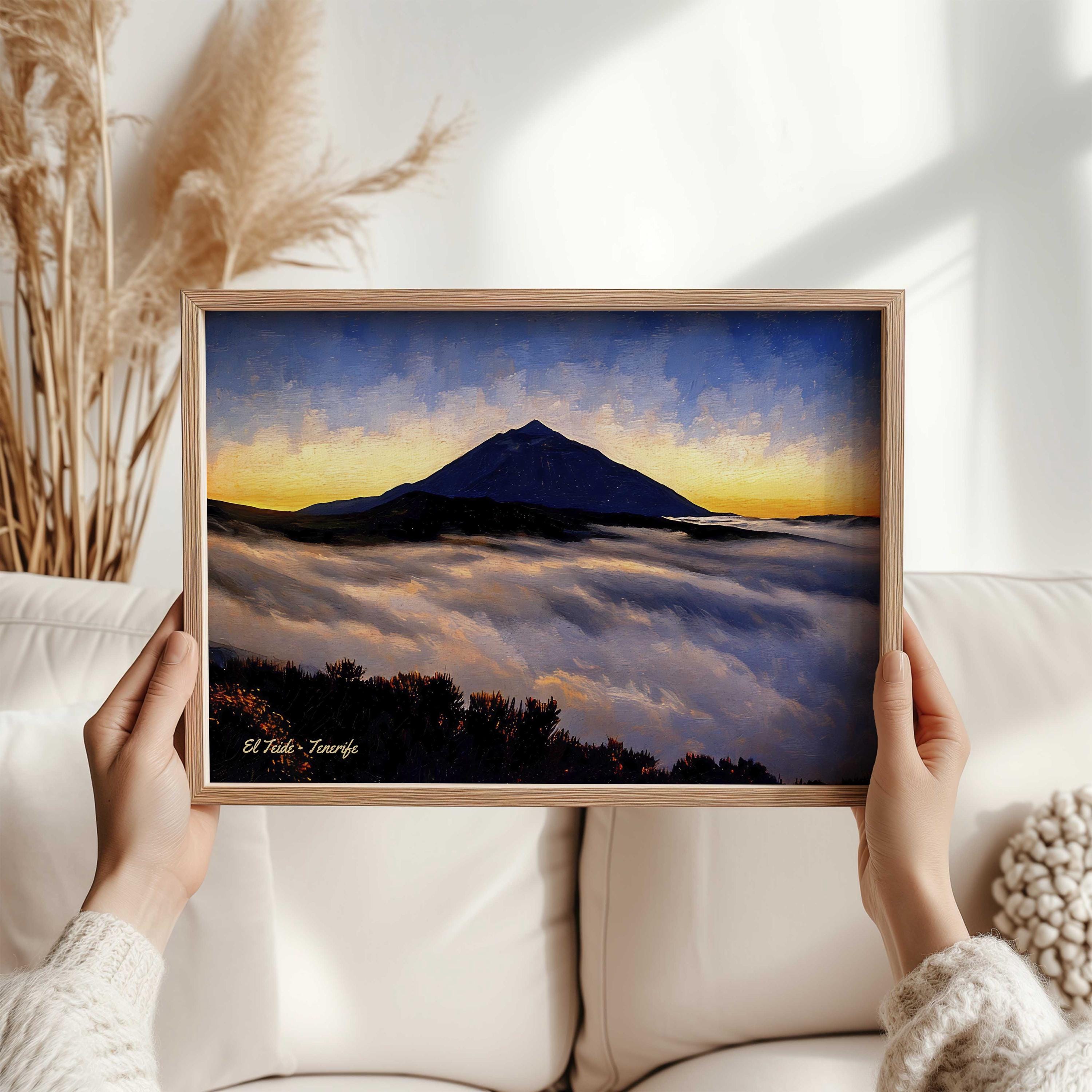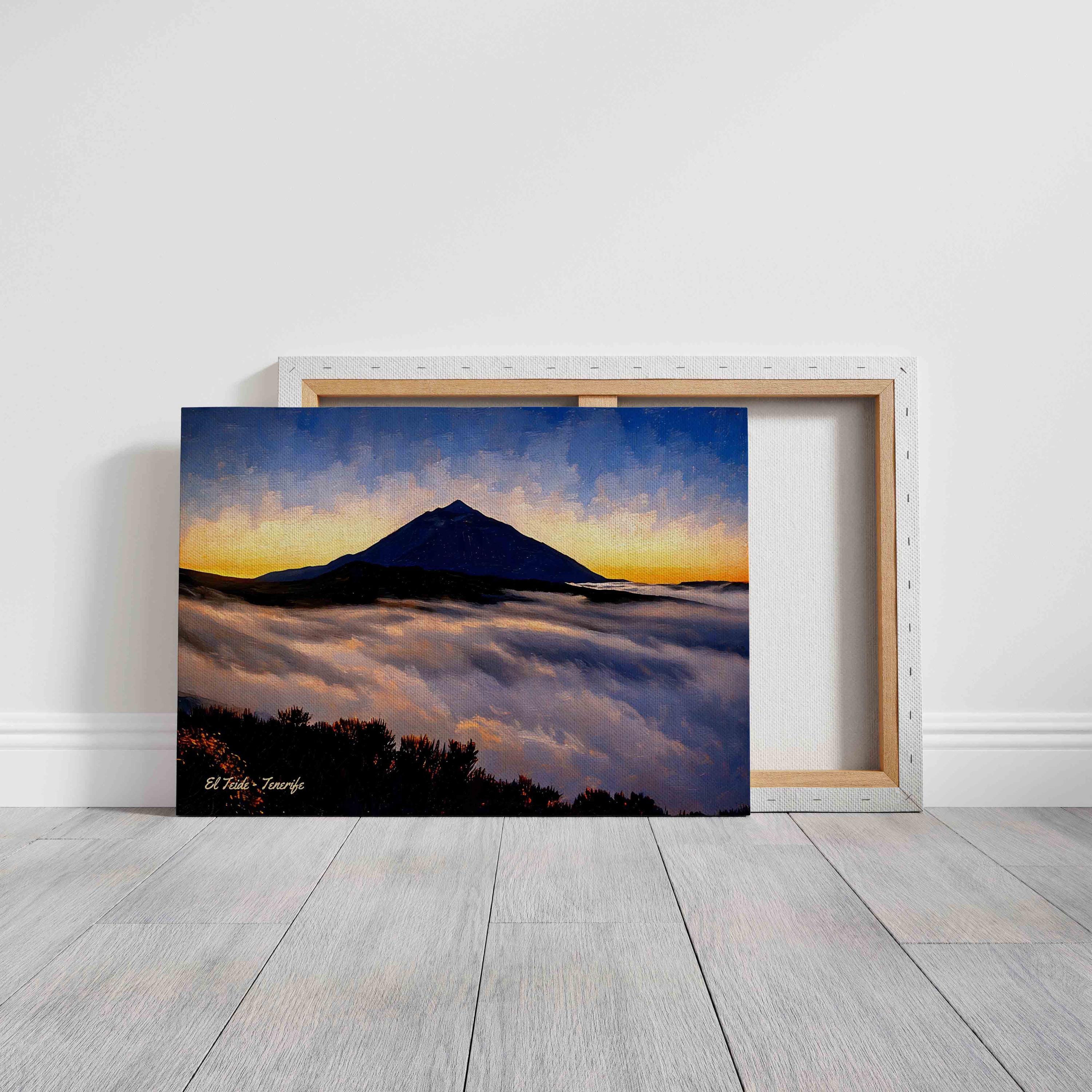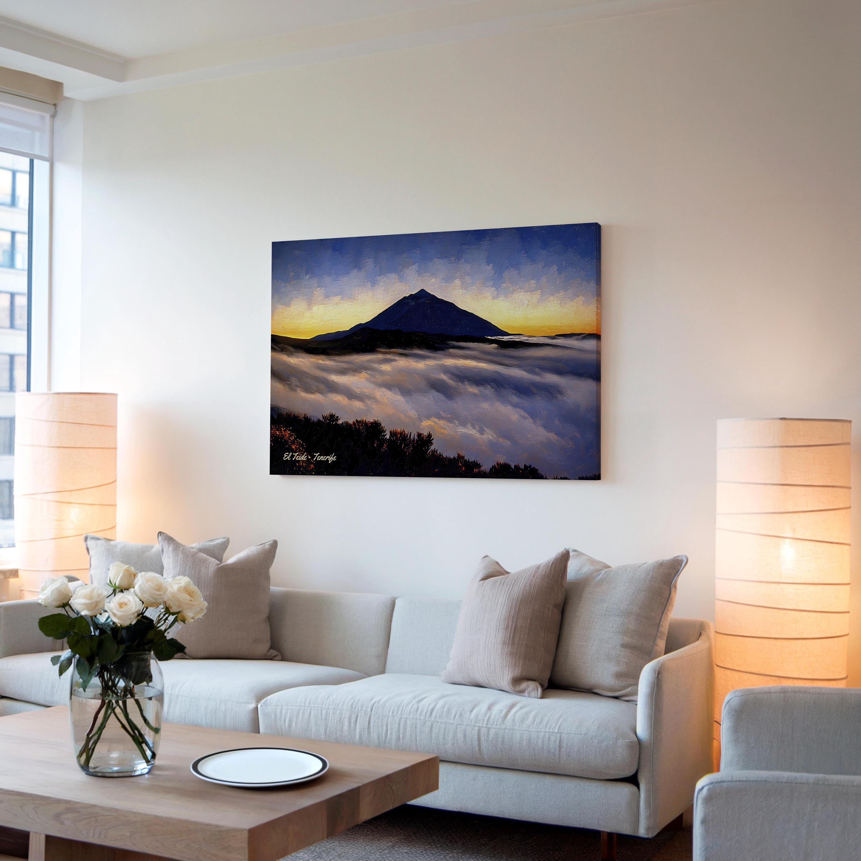 Printed on premium 100% cotton canvas, this artwork brings the atmosphere of Tenerife’s volcanic landscapes into your home or office. The contrast between the glowing sky, the dark silhouette of the volcano and the soft clouds below creates a striking wall decoration inspired by the landscapes of the Canary Islands.
