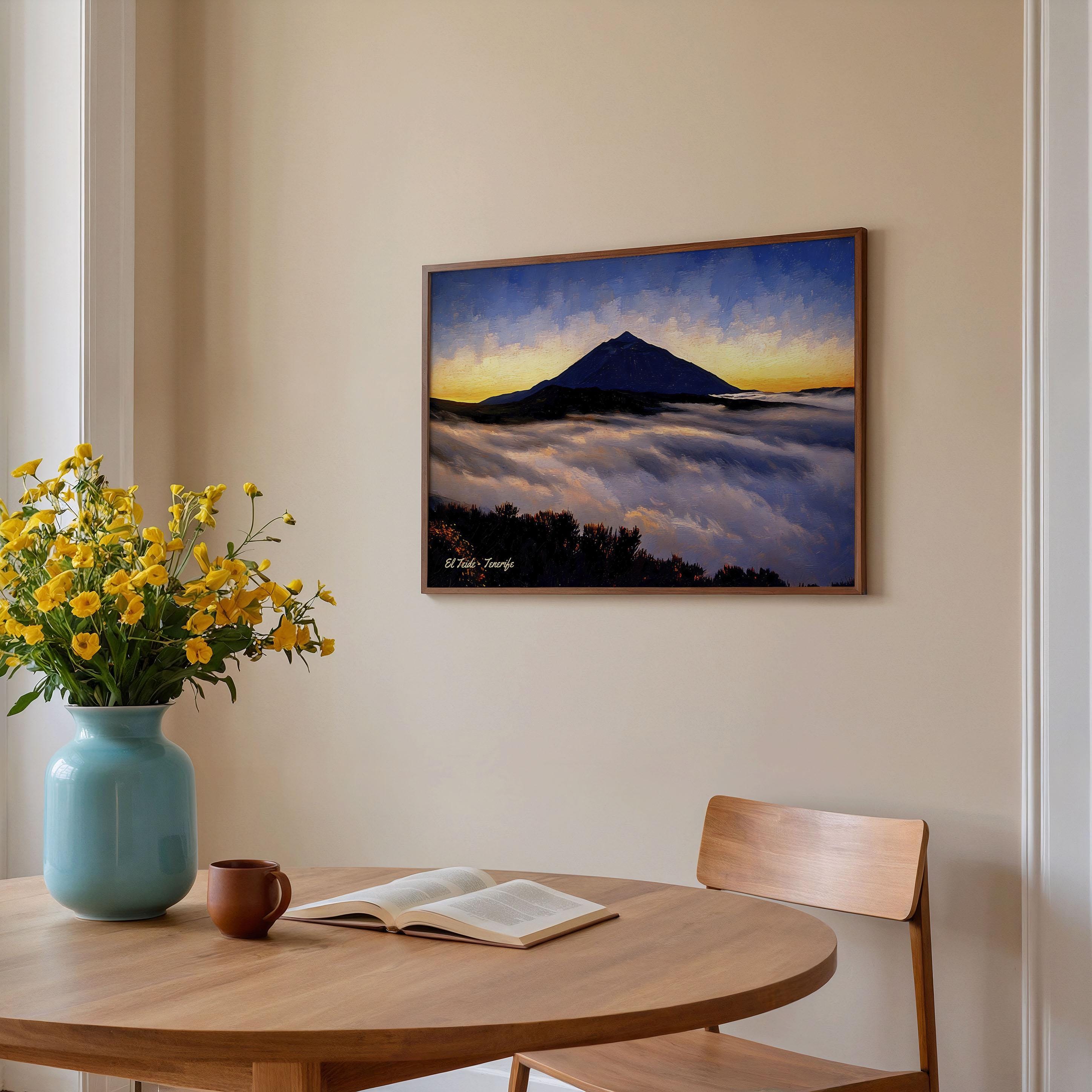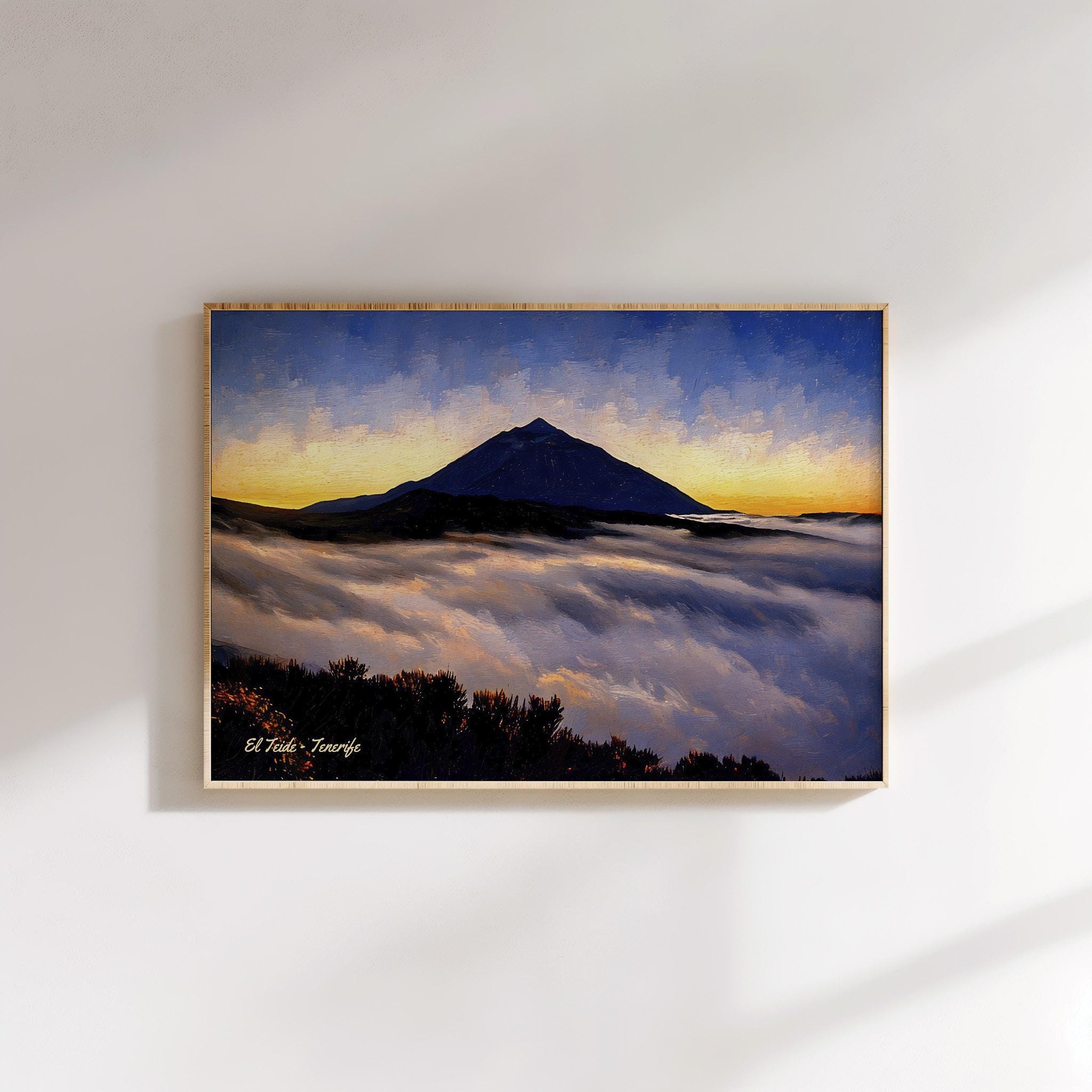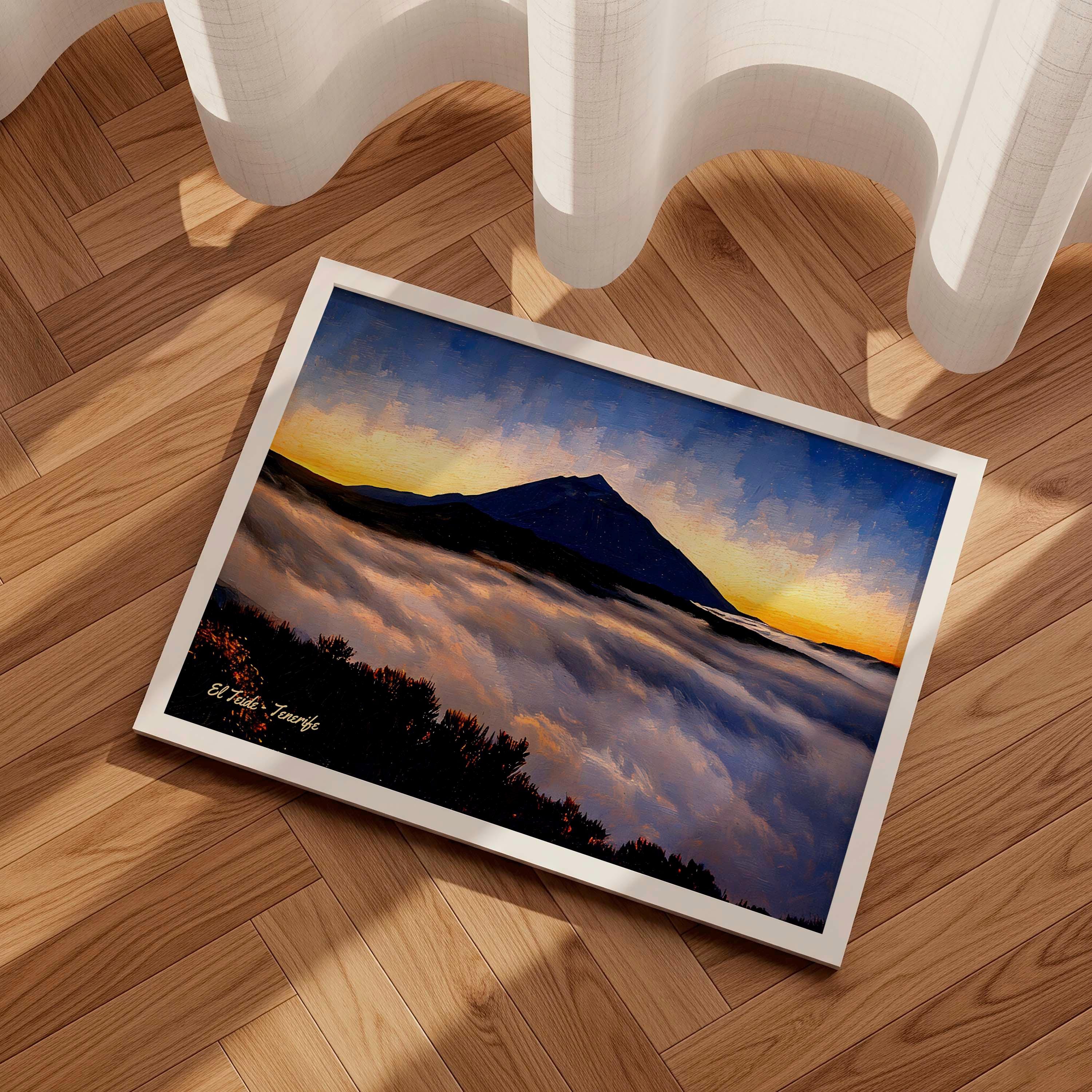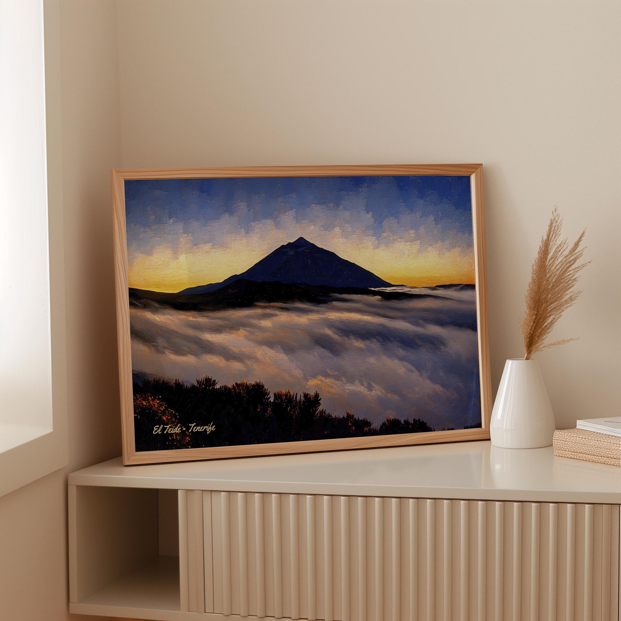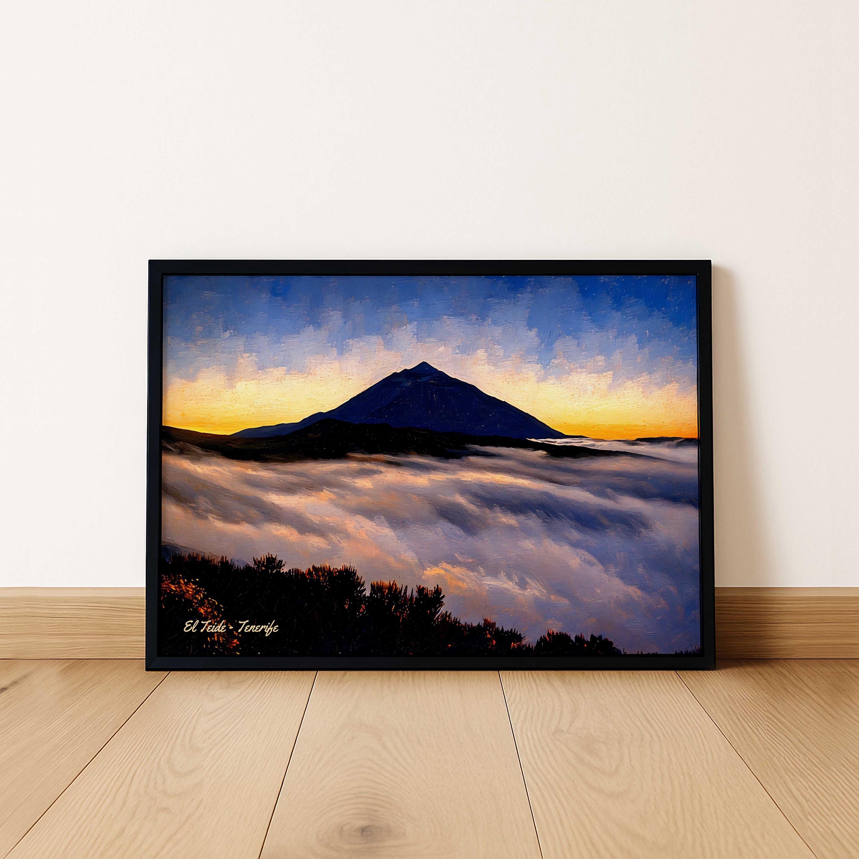 This artwork captures Mount Teide rising above a sea of clouds at sunset, one of the most spectacular views found in Tenerife. As the sun sets behind the horizon, the sky glows with warm tones while the silhouette of the volcano stands dramatically above the cloud layer.