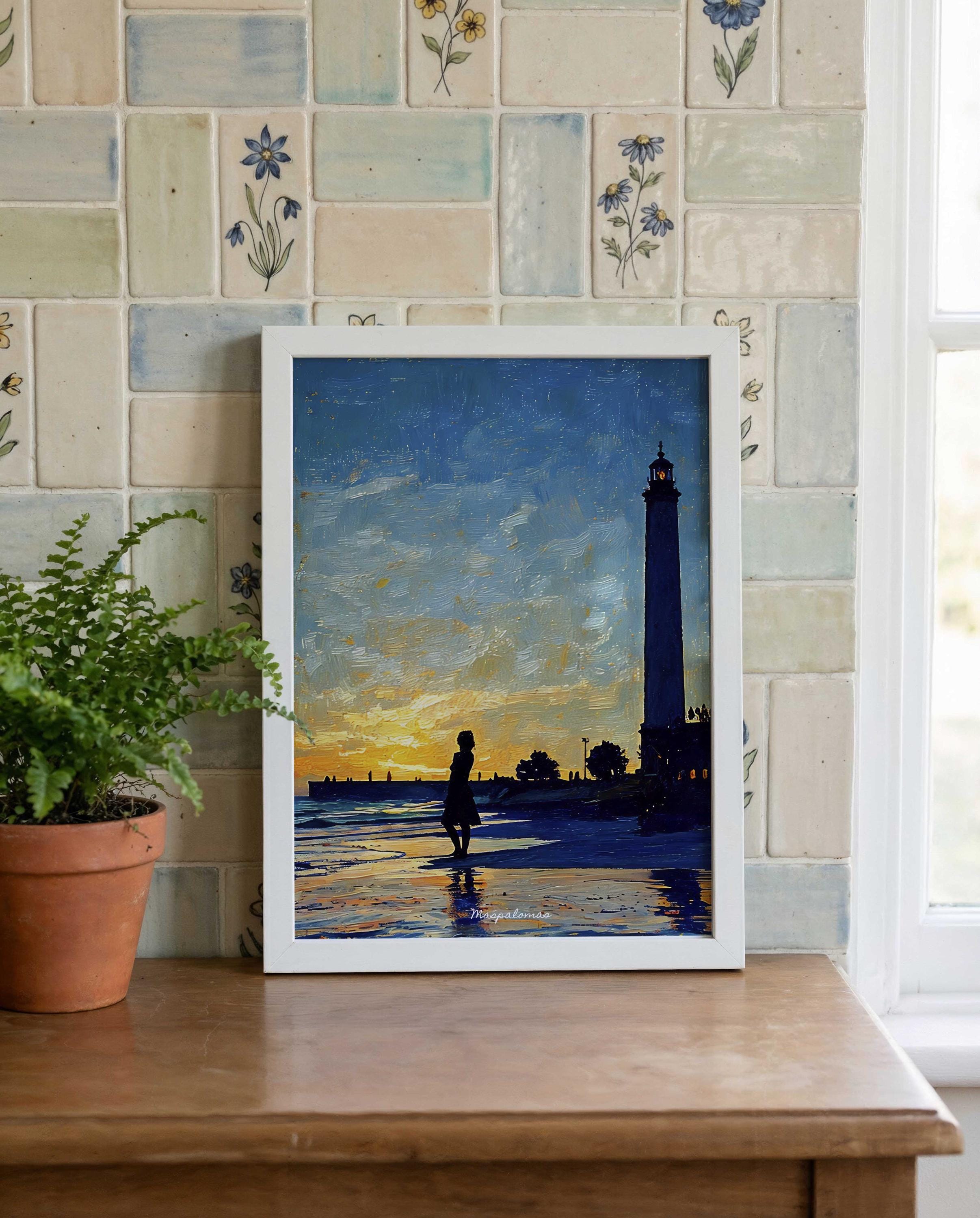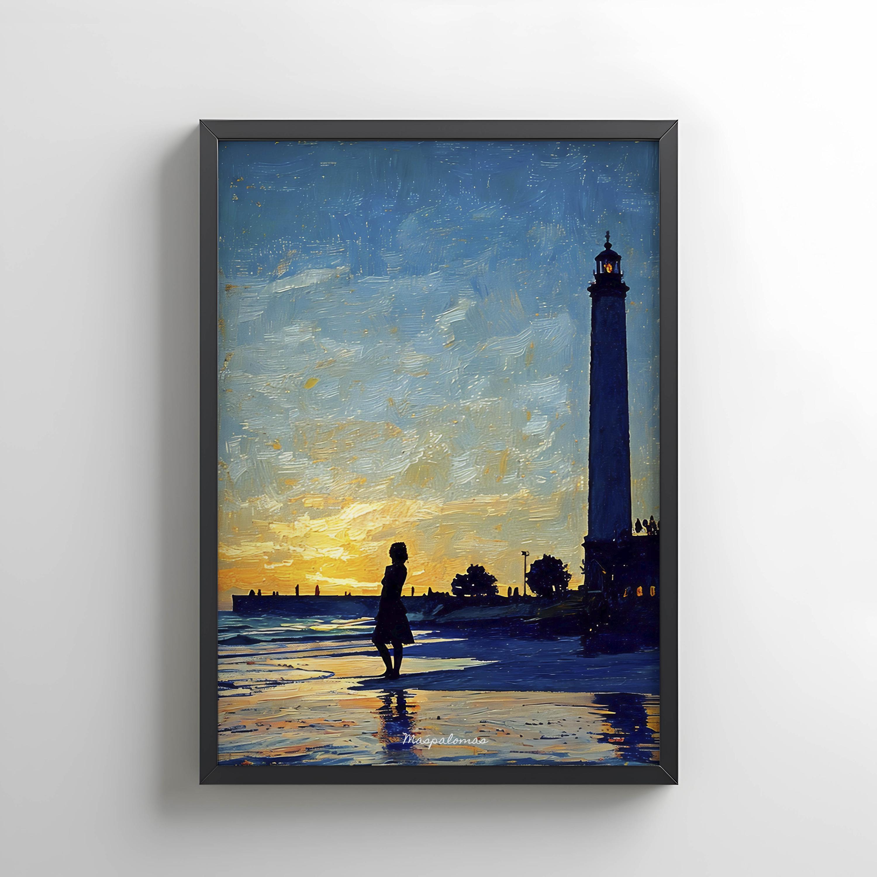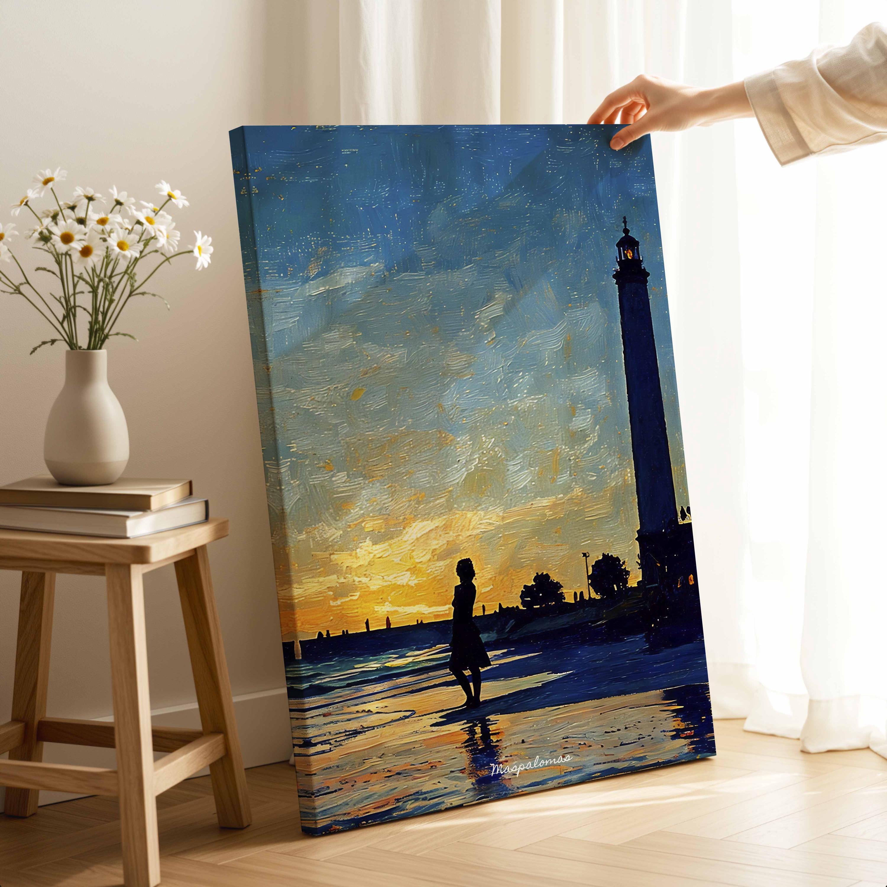 Printed on premium 100% cotton canvas, this artwork reflects the atmosphere of a sunset along the southern coast of Gran Canaria. The composition evokes the calm of the Atlantic shoreline and the timeless presence of the Maspalomas lighthouse, a symbol of the island’s maritime history and coastal landscape.
