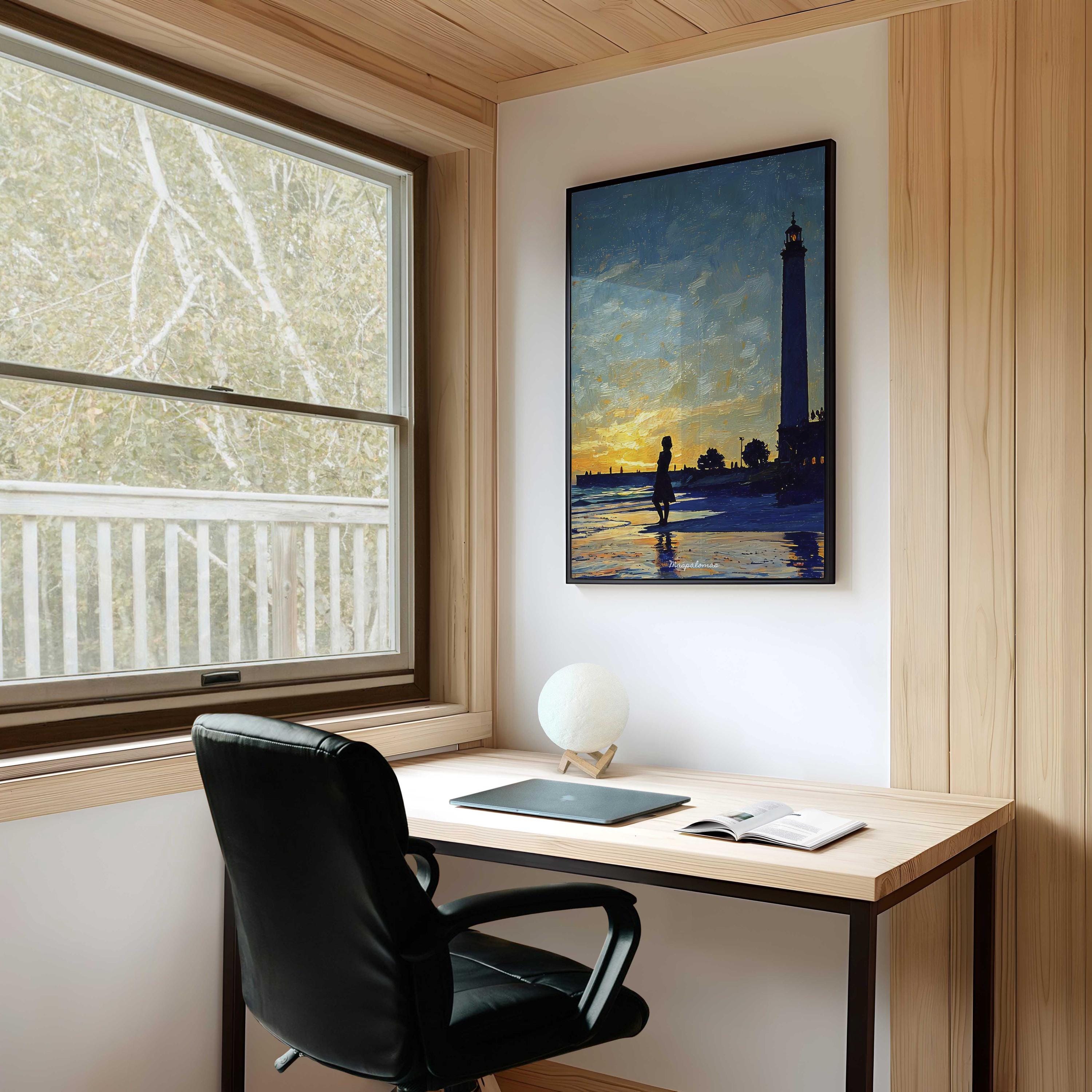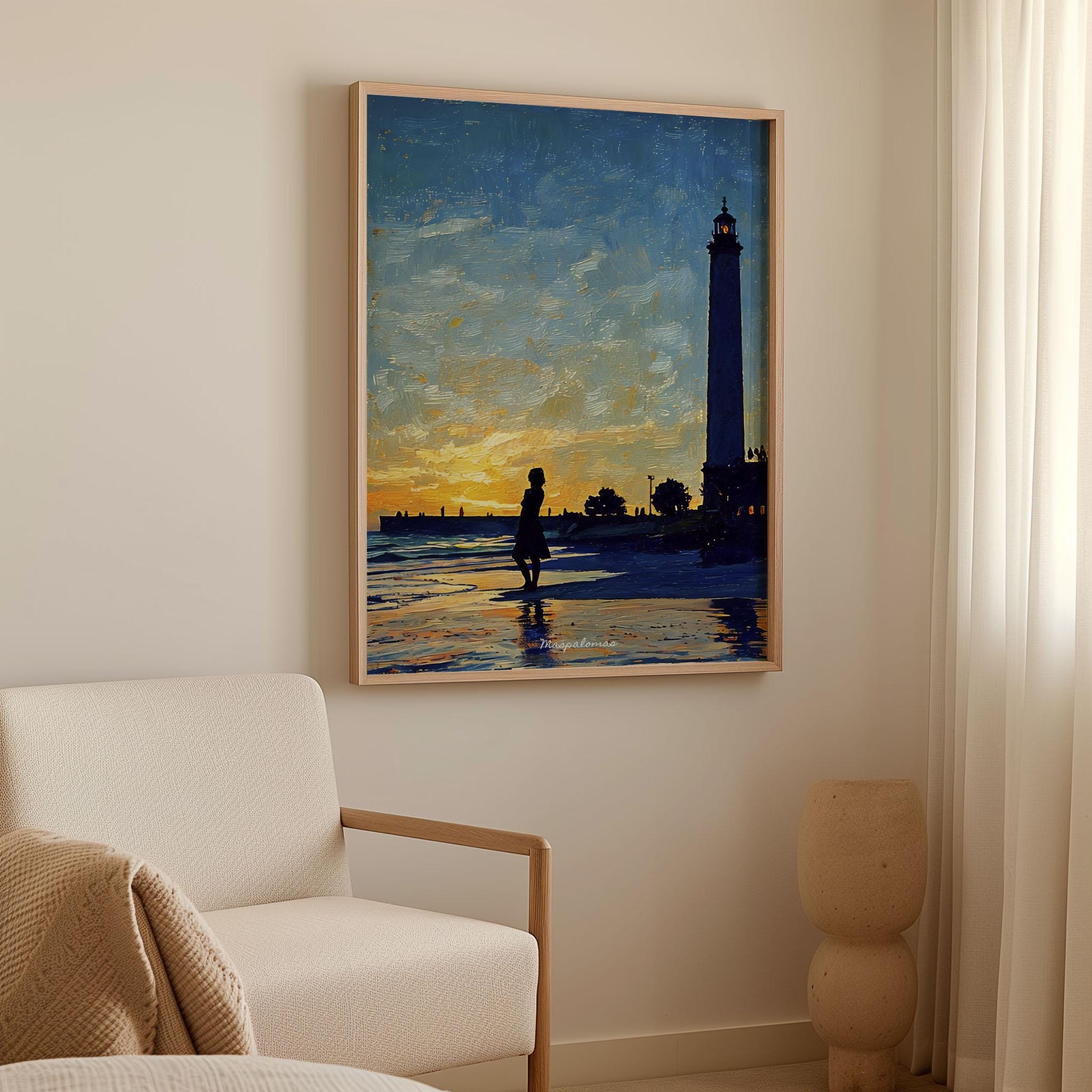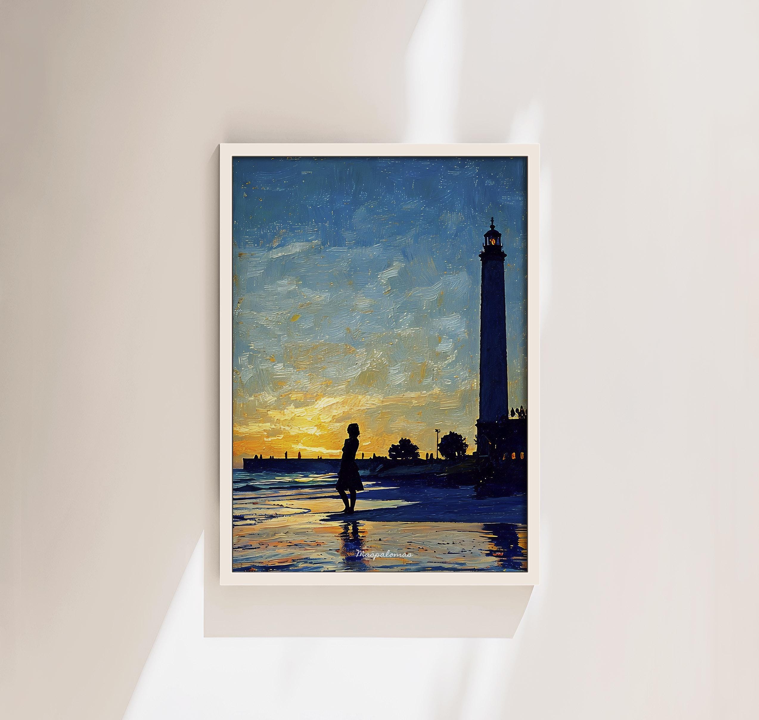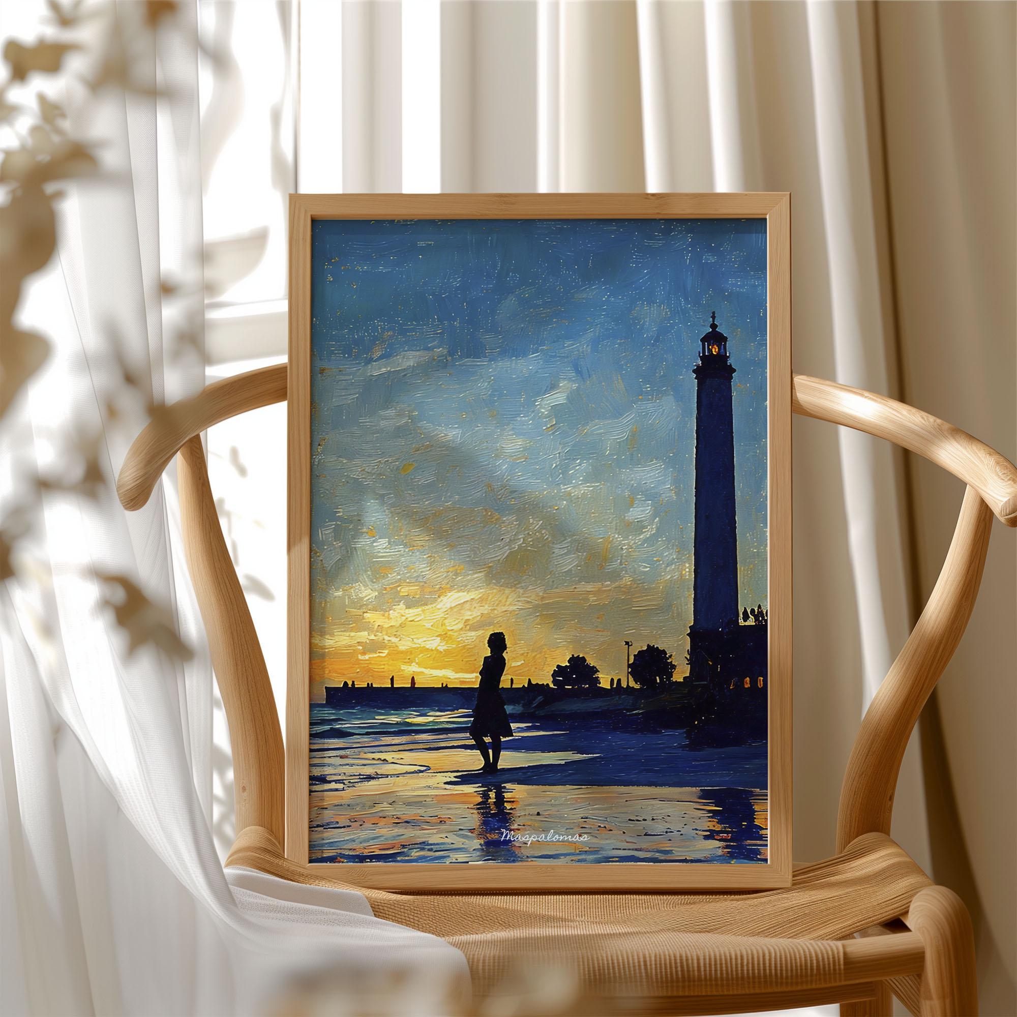 Printed on premium 100% cotton canvas, this artwork reflects the atmosphere of a sunset along the southern coast of Gran Canaria. The composition evokes the calm of the Atlantic shoreline and the timeless presence of the Maspalomas lighthouse, a symbol of the island’s maritime history and coastal landscape.