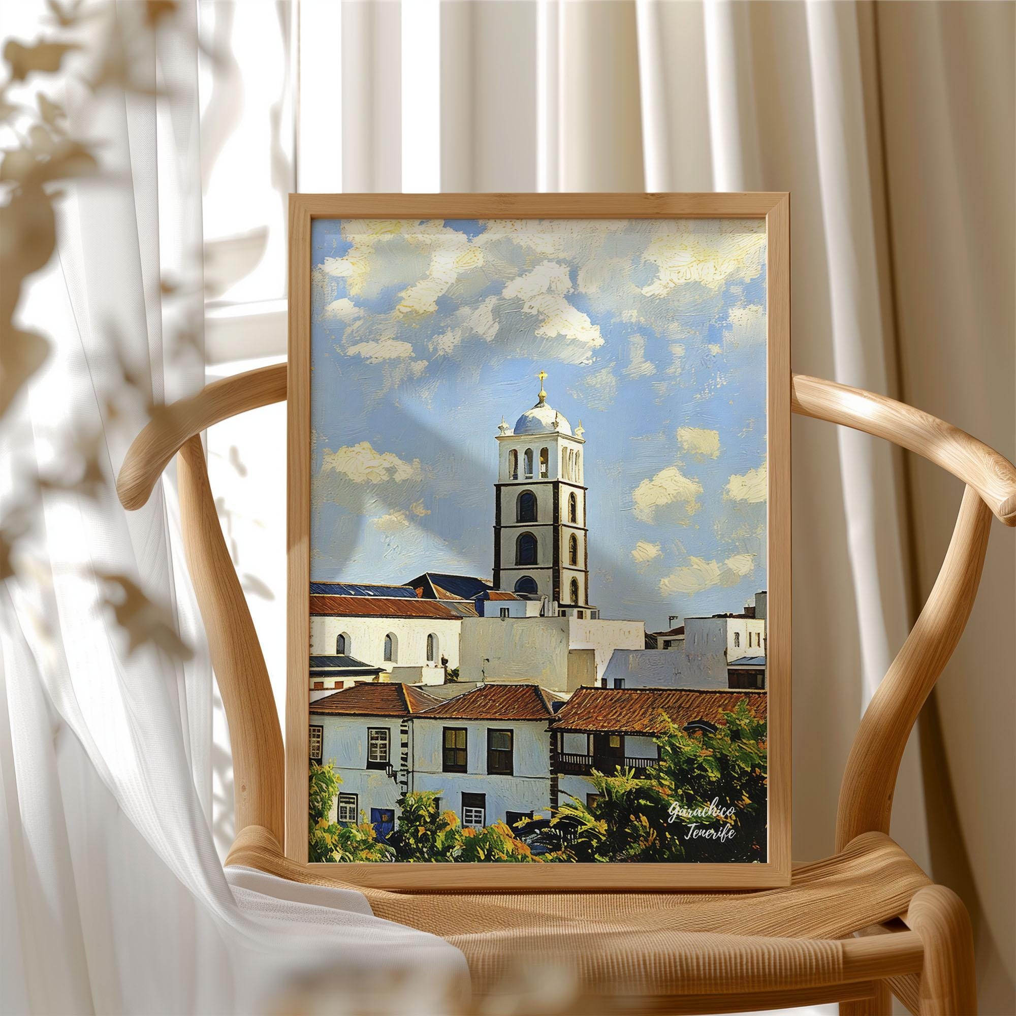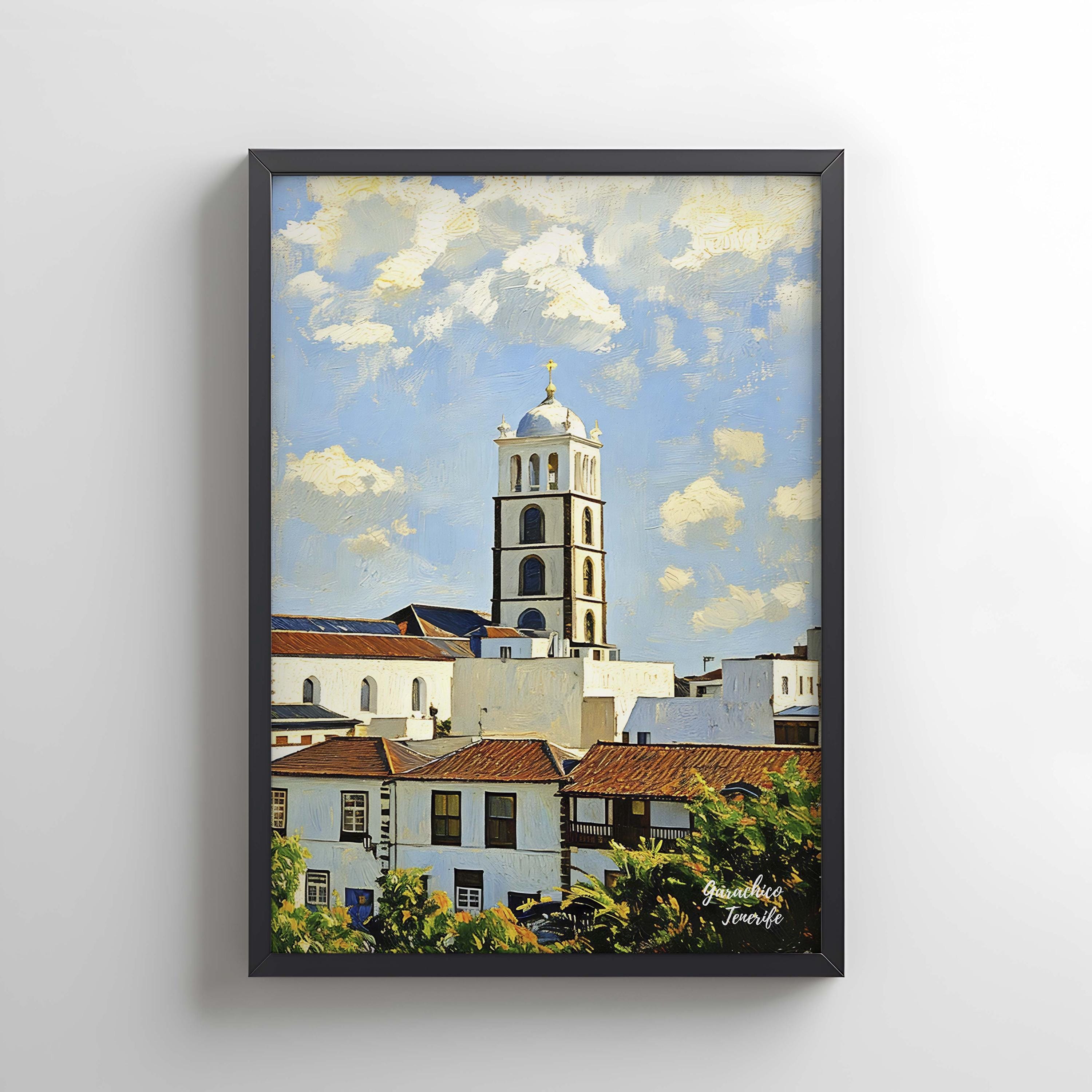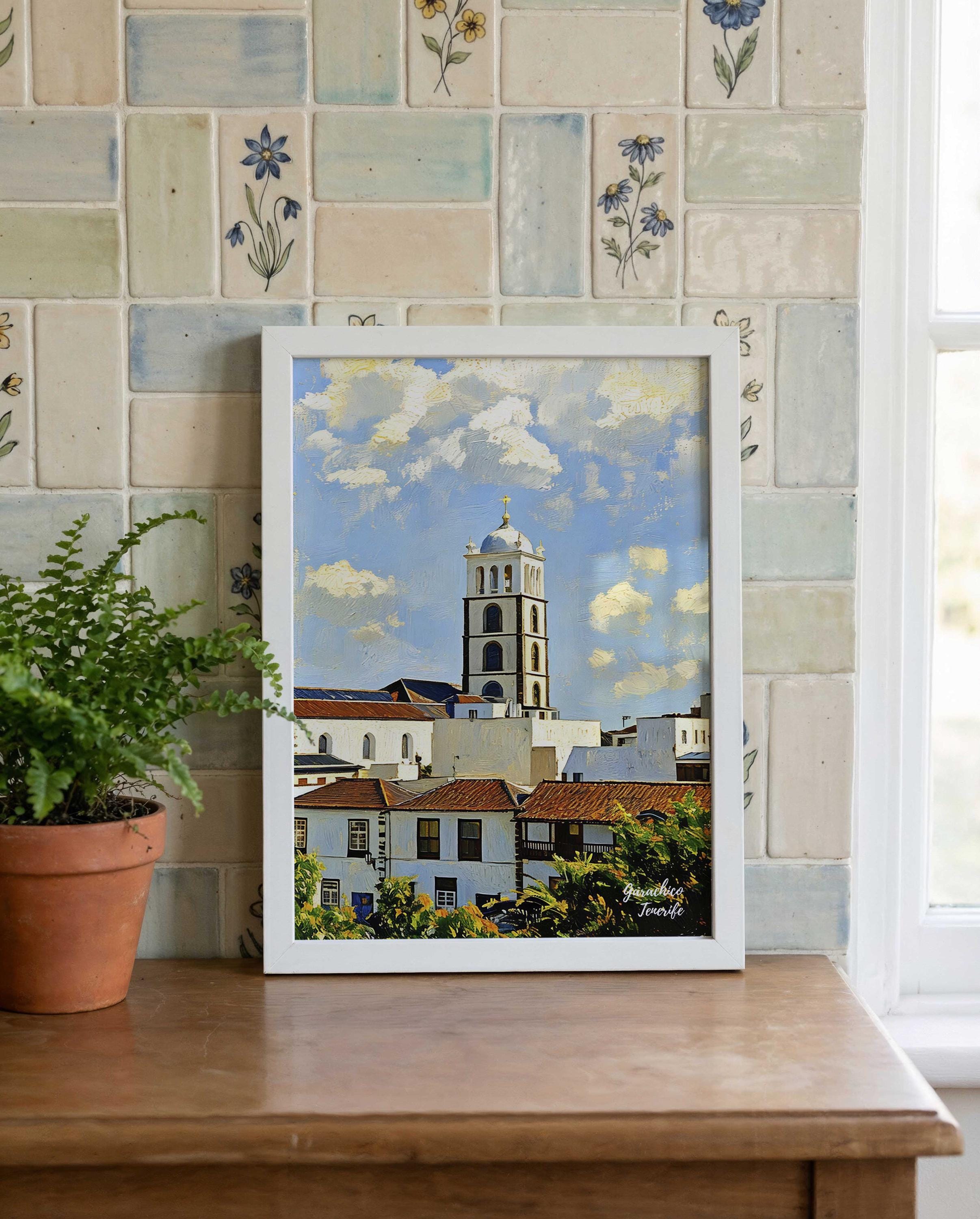 This artwork portrays the historic town of Garachico, one of the most characterful and culturally rich places in Tenerife. The whitewashed buildings, traditional balconies and church tower reflect the architecture that has defined this coastal town for centuries.