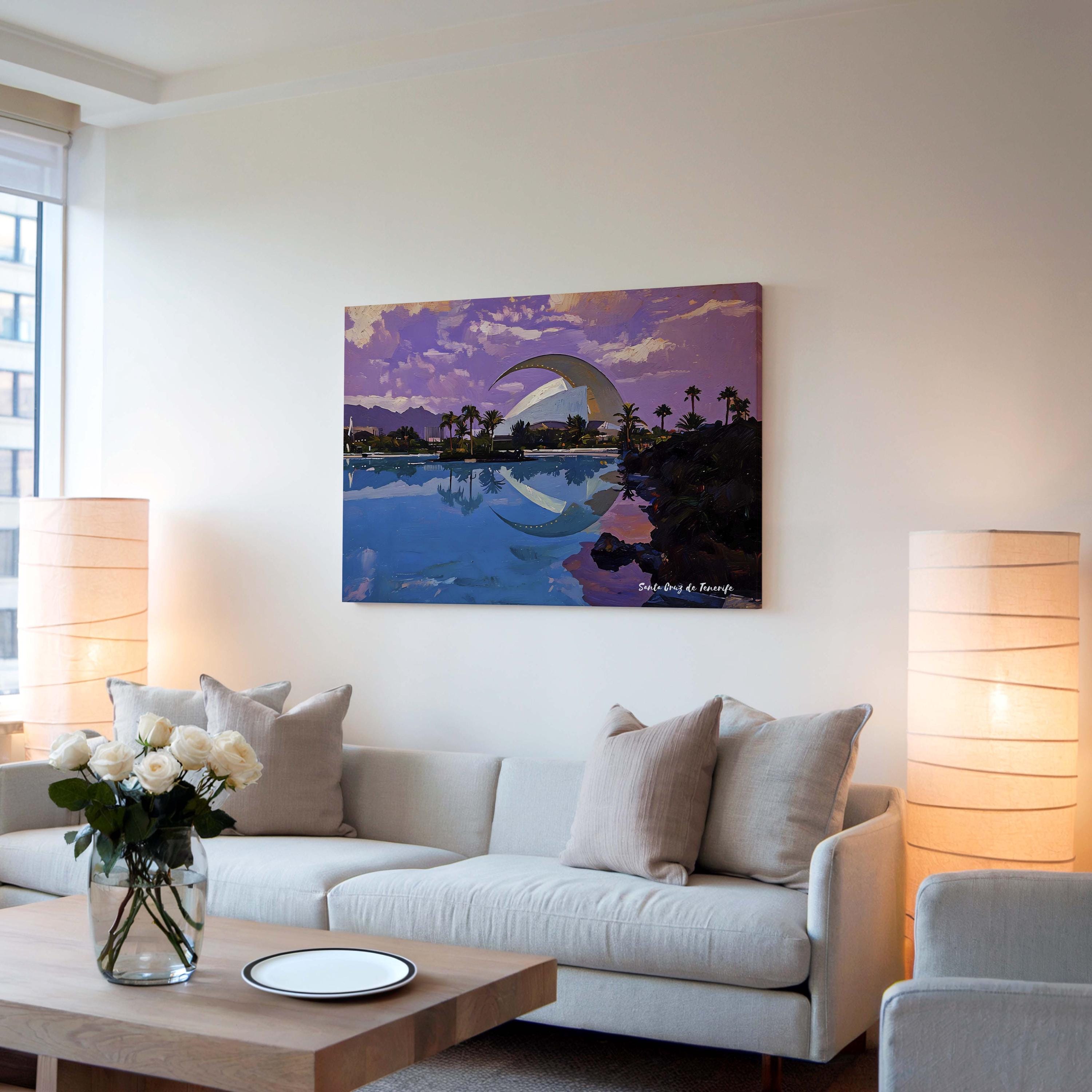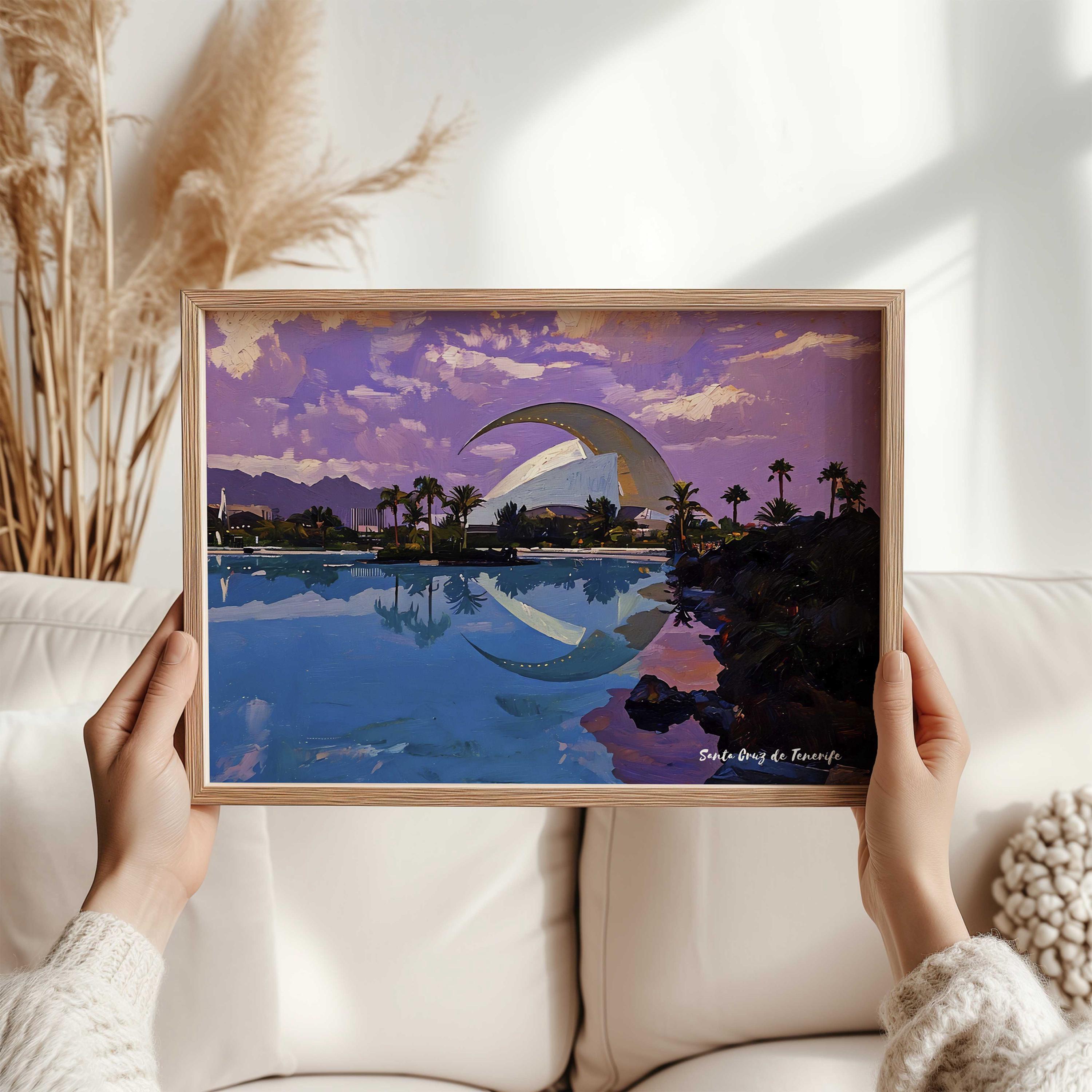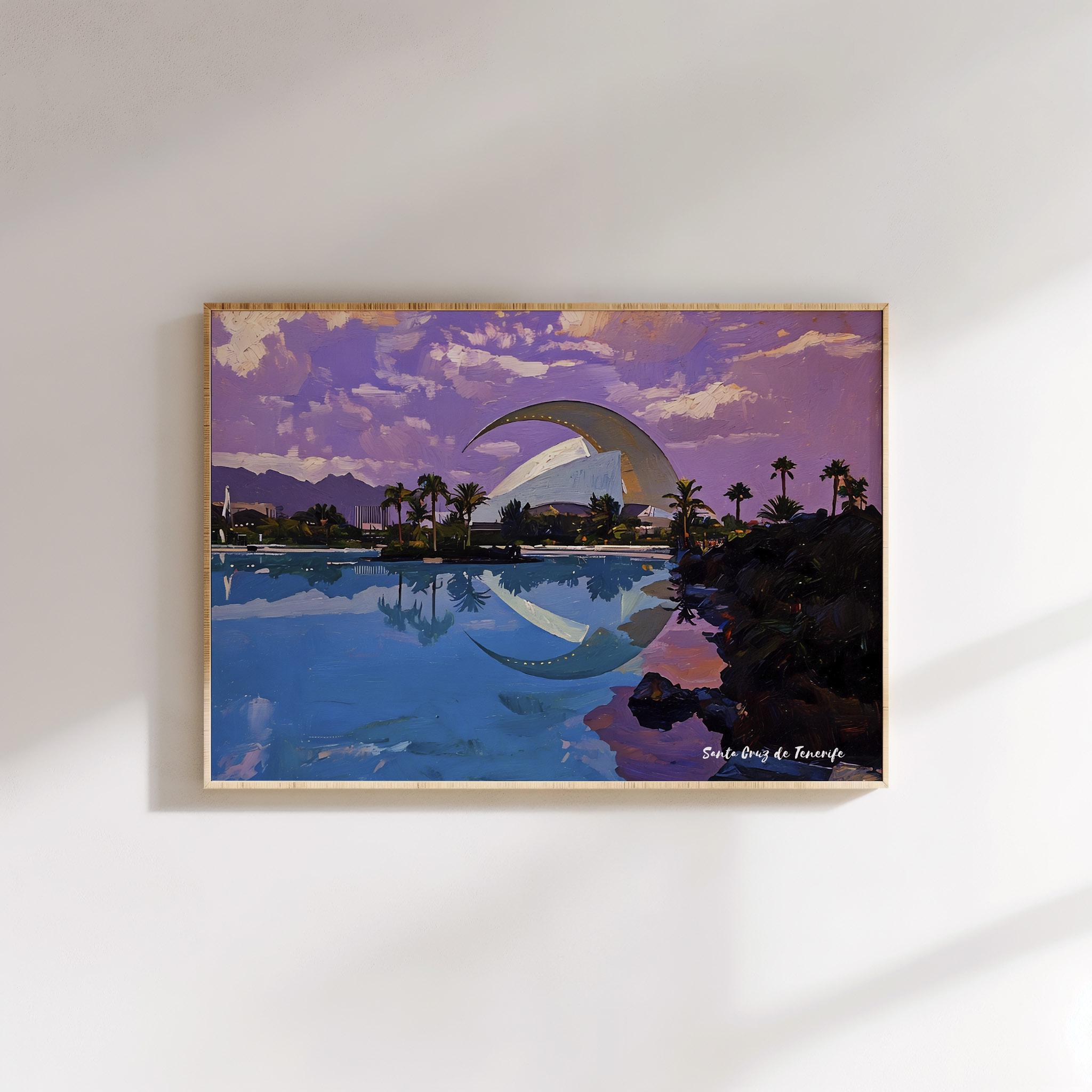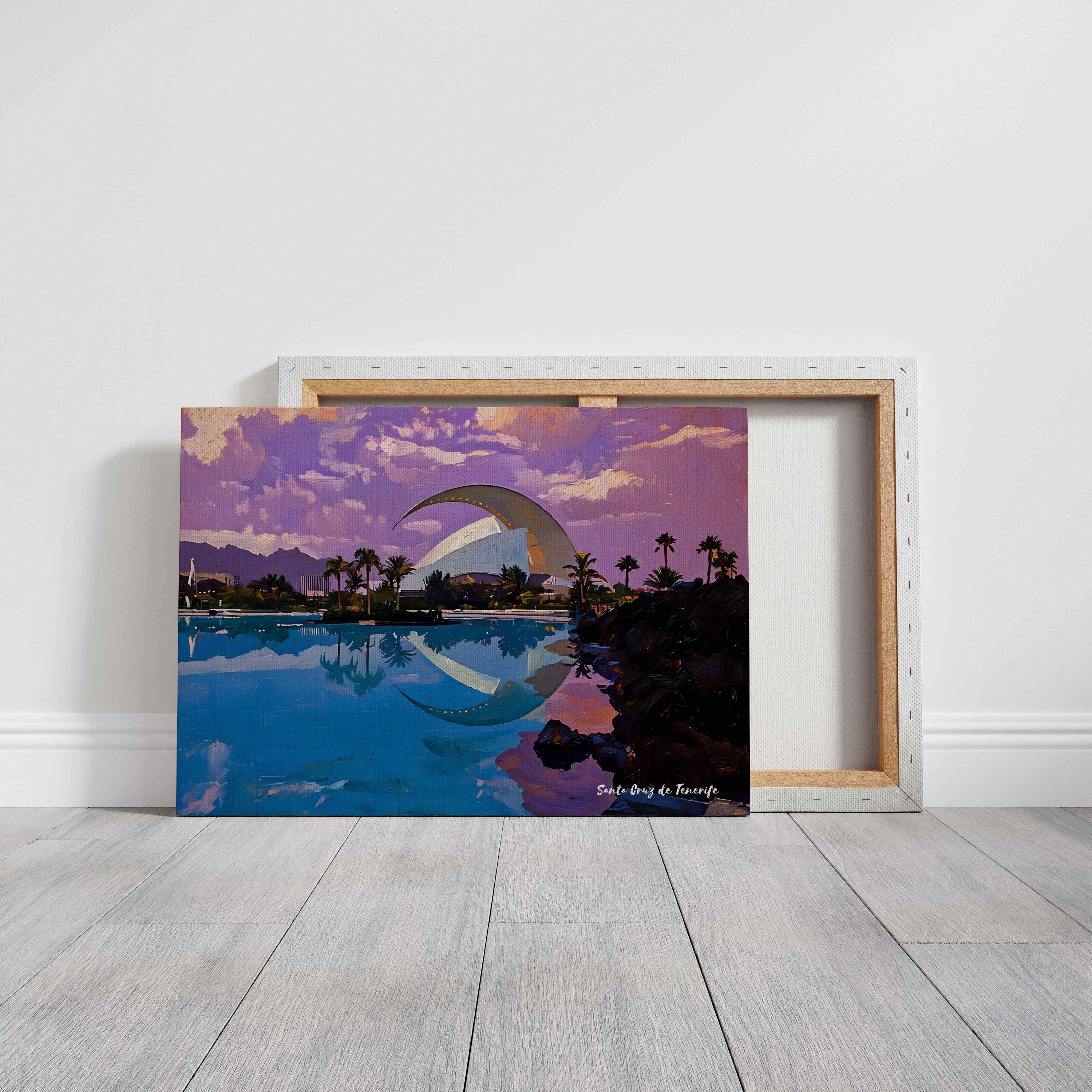 Printed on premium 100% cotton canvas, this artwork reflects the balance between modern design and the coastal atmosphere of Tenerife. The composition highlights the unique character of Santa Cruz, where innovation and island landscape come together.