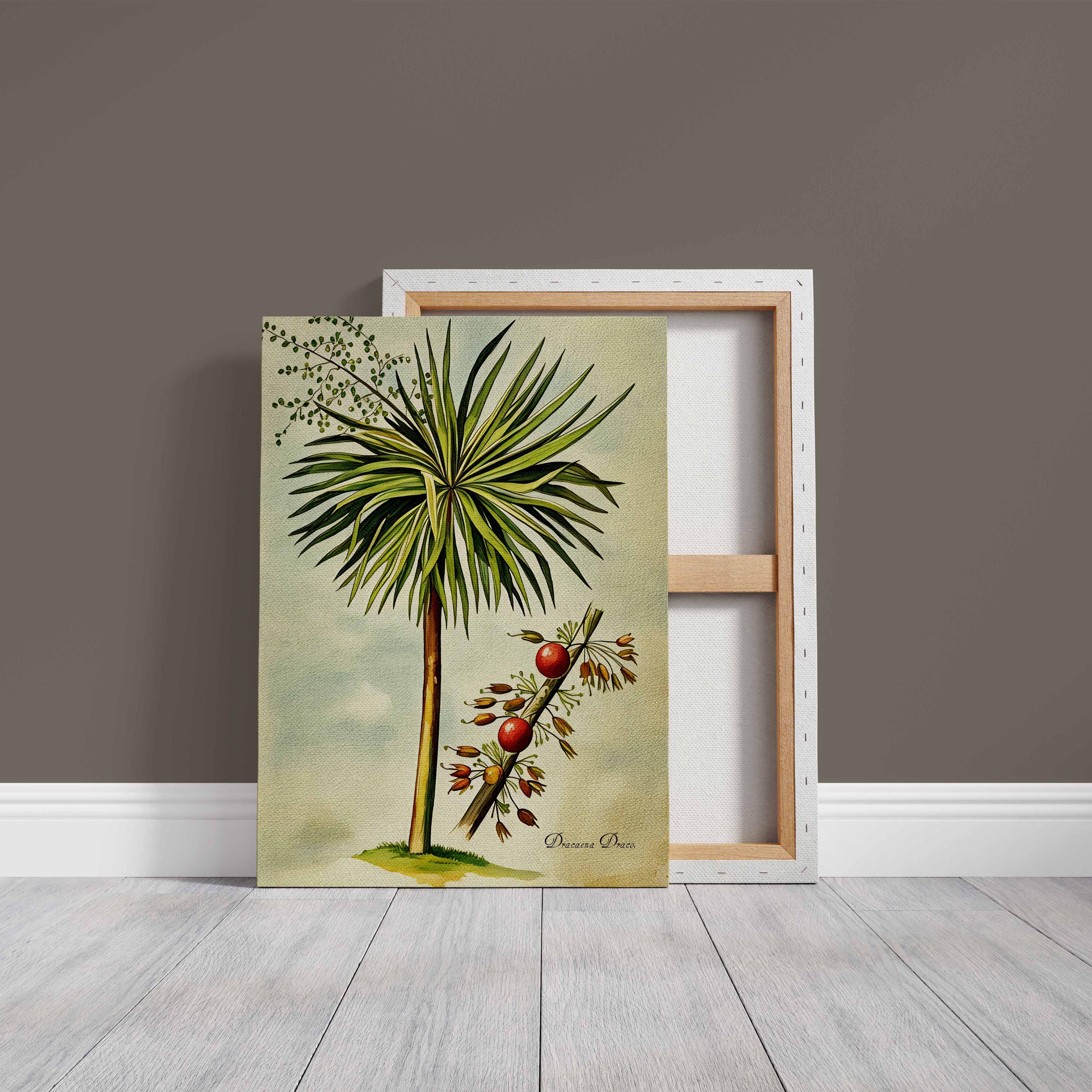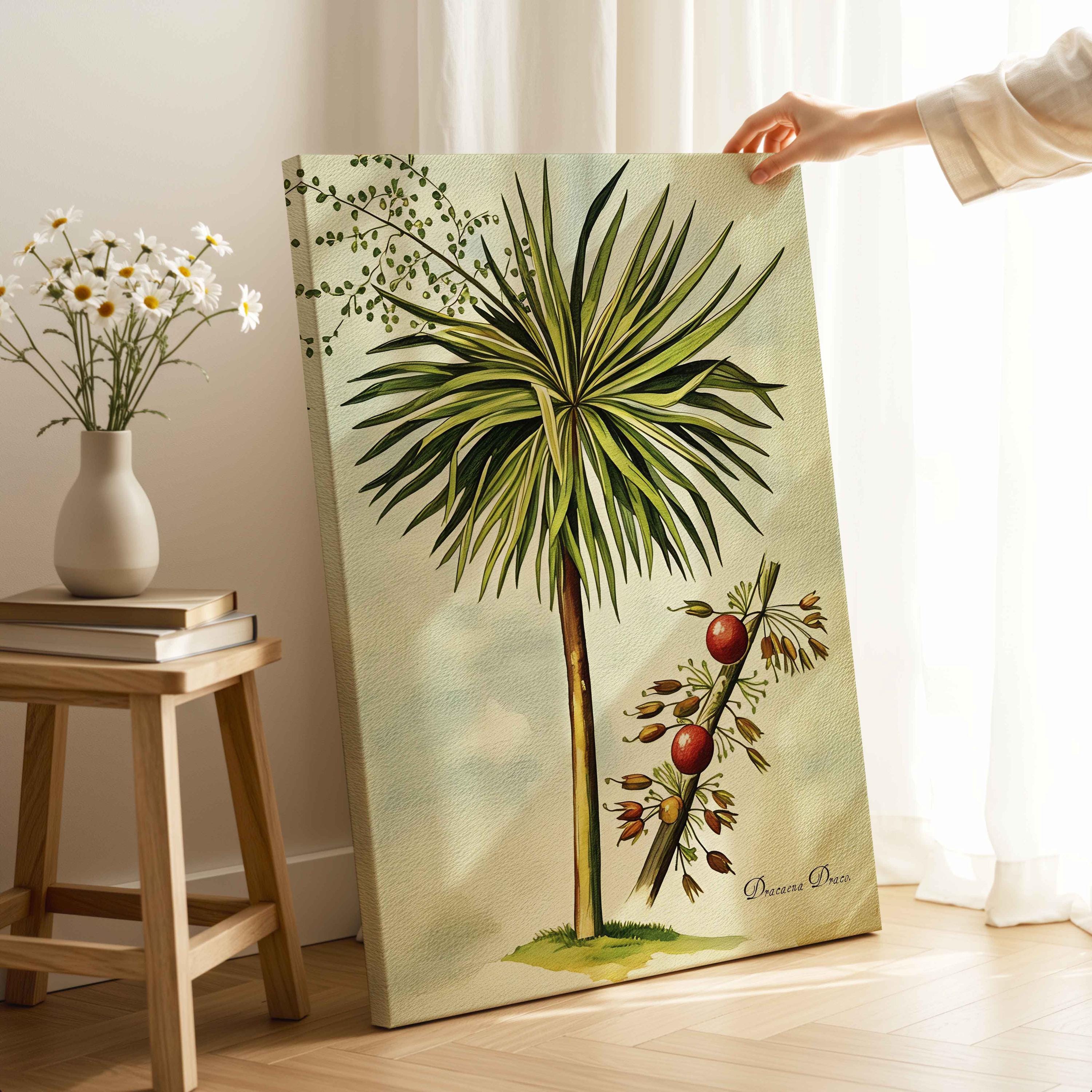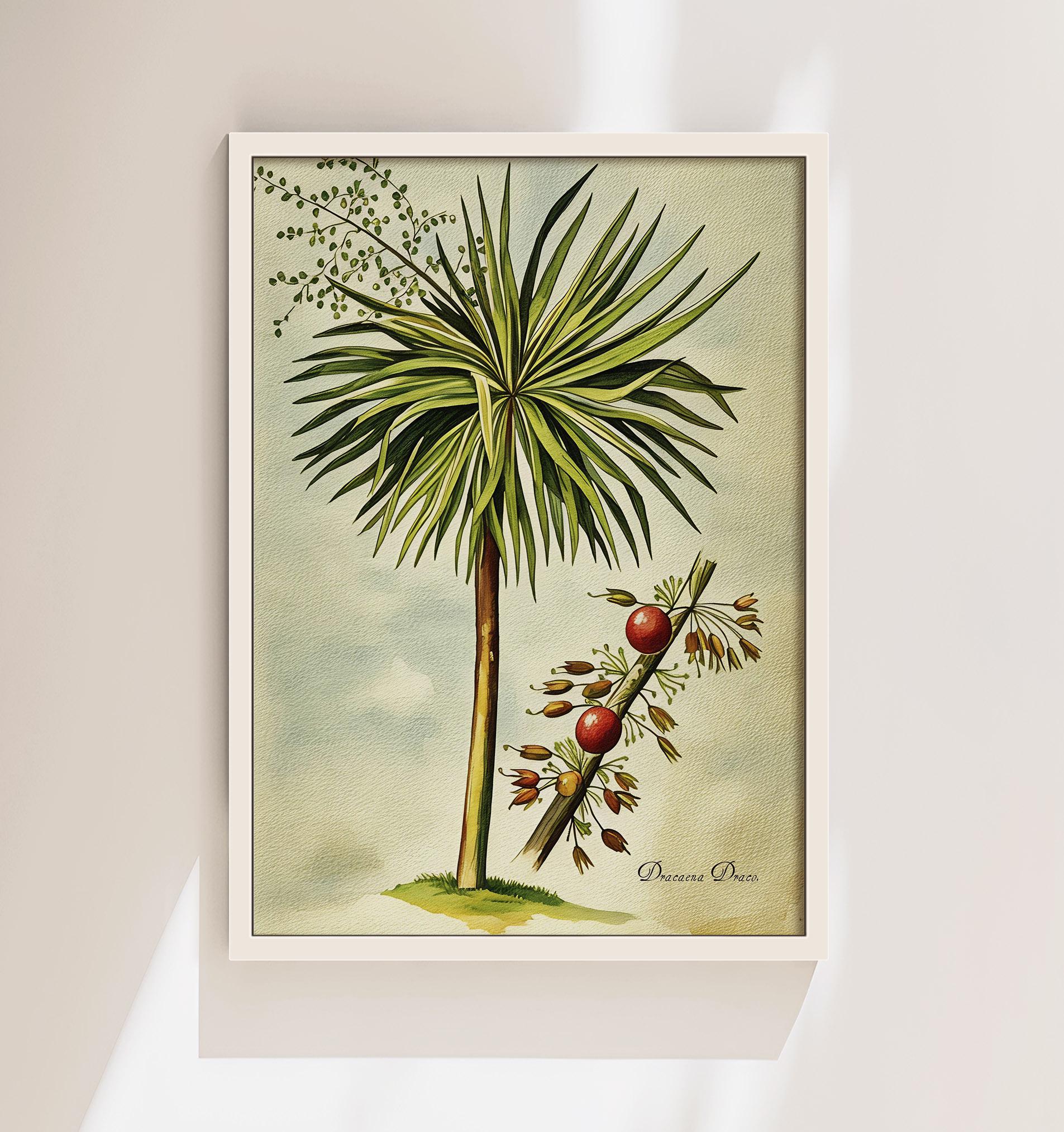 This artwork features a botanical illustration of Dracaena draco, known as the dragon tree, one of the most iconic and symbolic species of the Canary Islands. Its sculptural trunk and umbrella-shaped crown create a striking and timeless silhouette.
