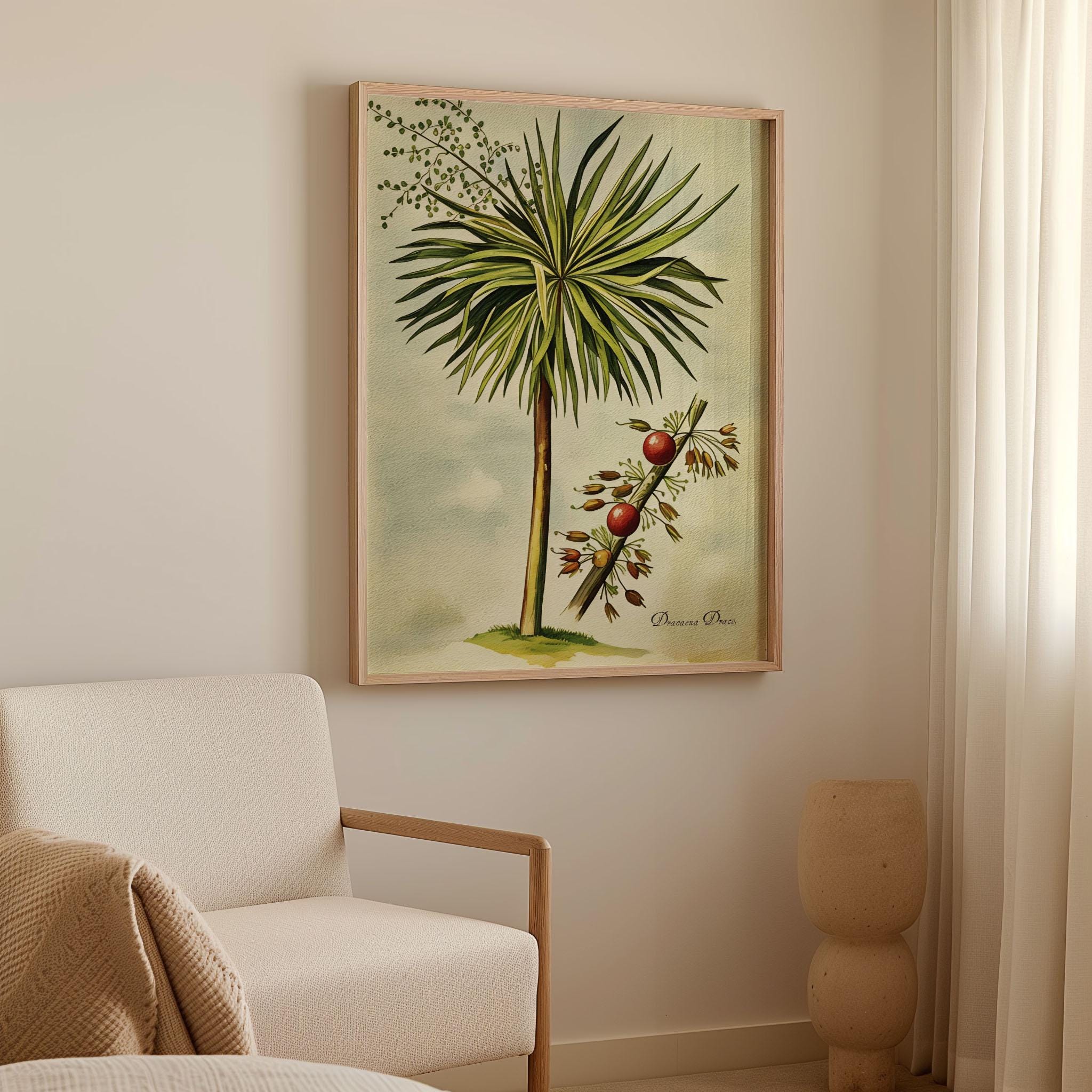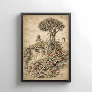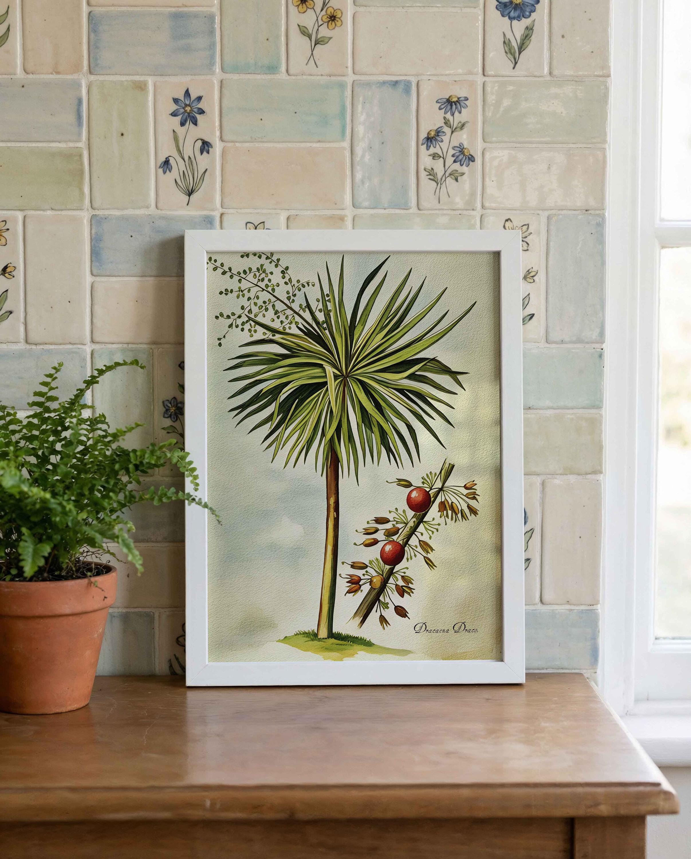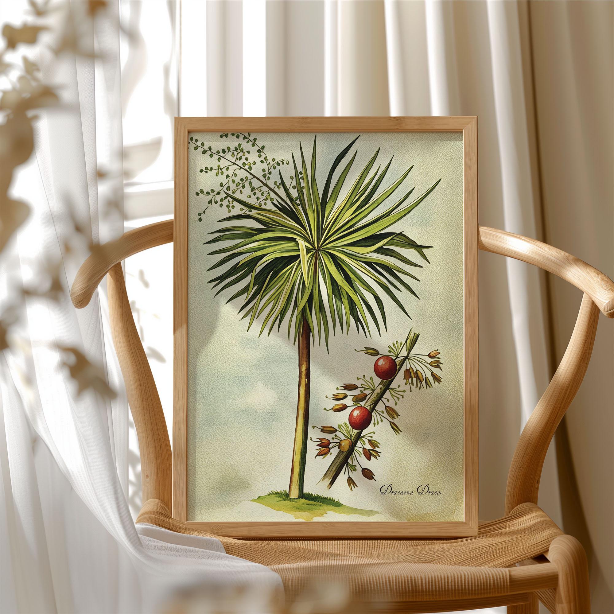 This artwork features a botanical illustration of Dracaena draco, known as the dragon tree, one of the most iconic and symbolic species of the Canary Islands. Its sculptural trunk and umbrella-shaped crown create a striking and timeless silhouette.