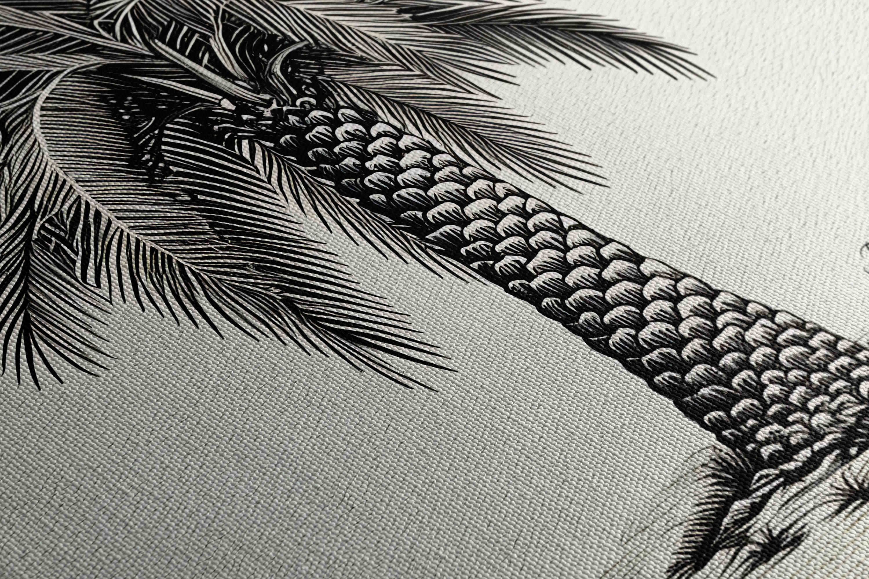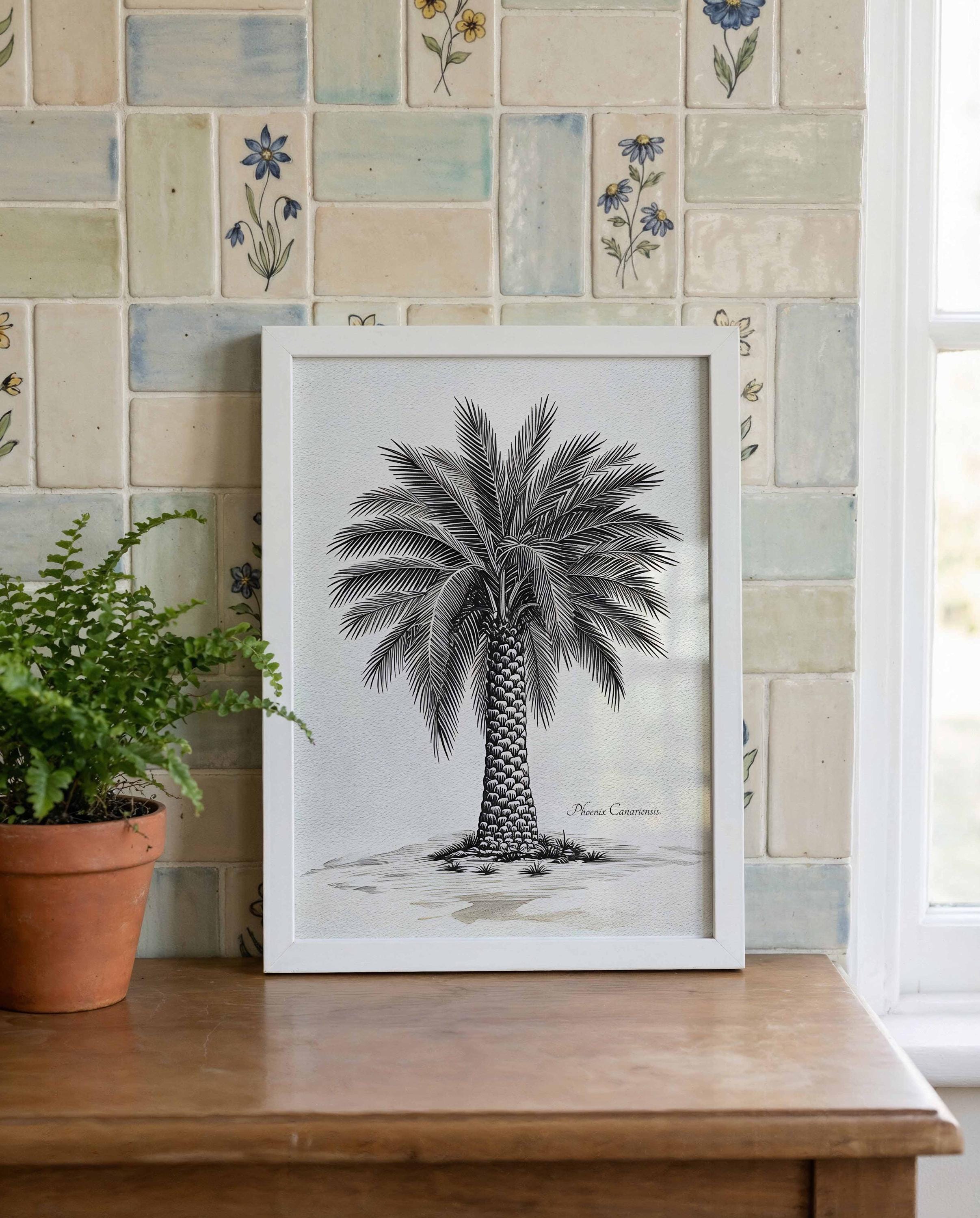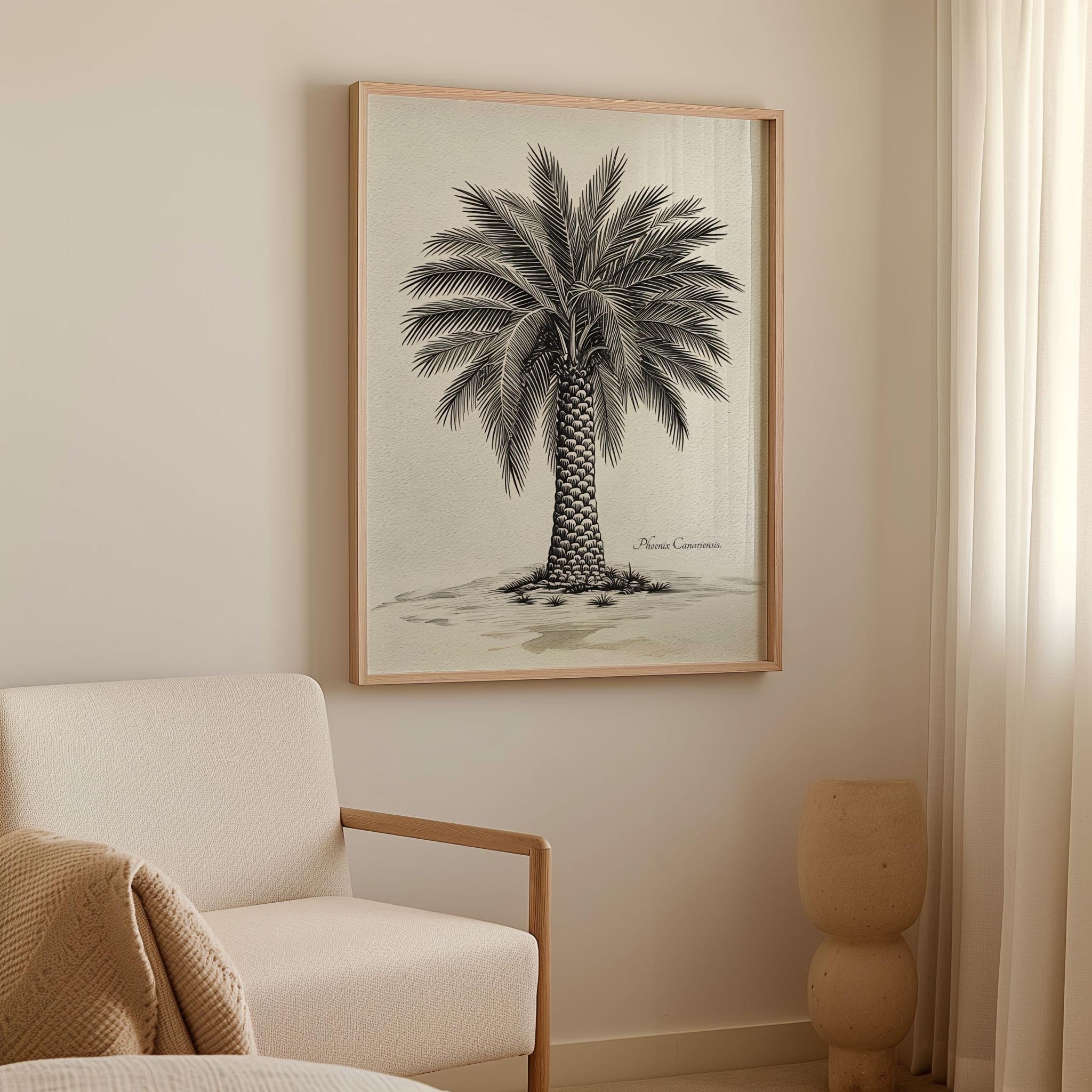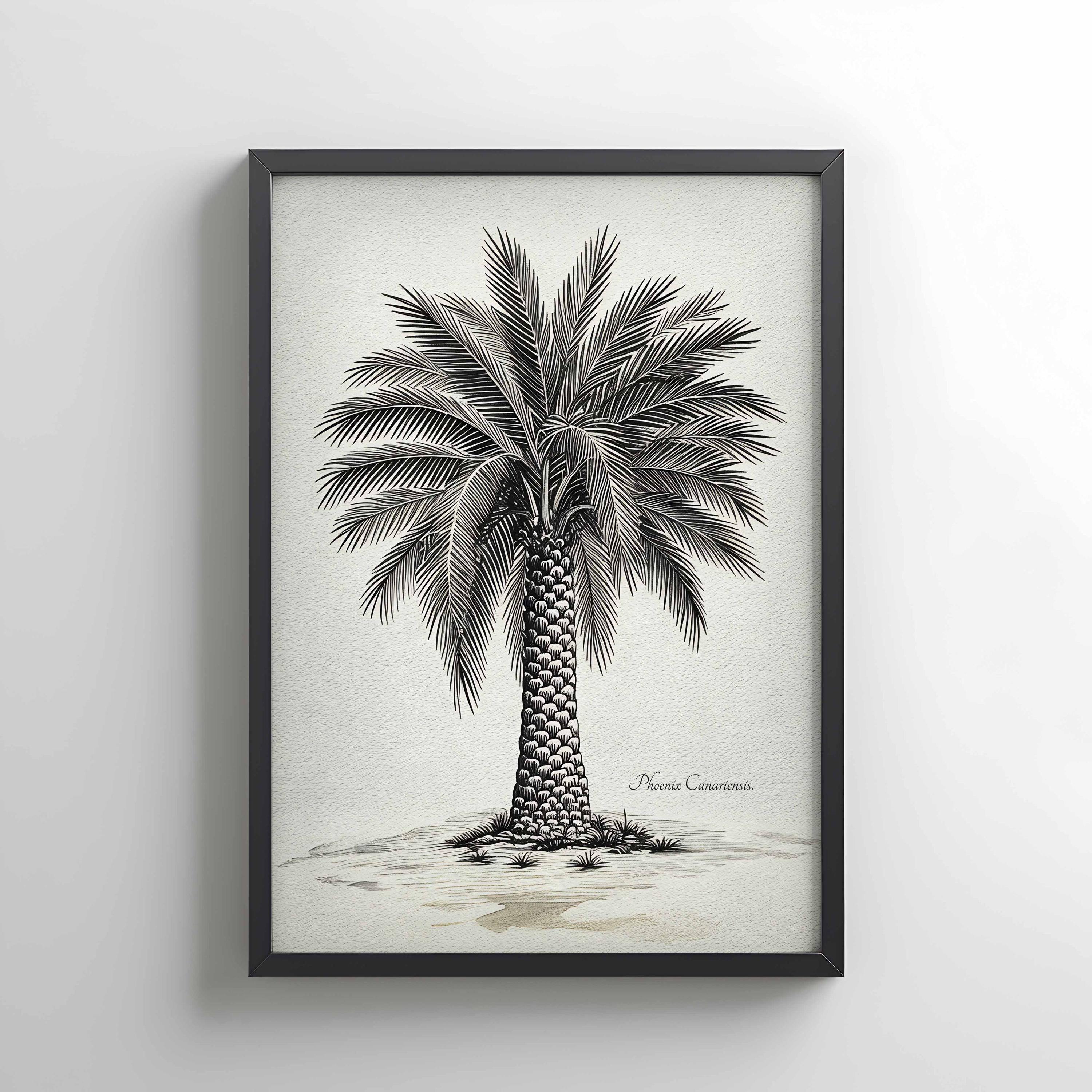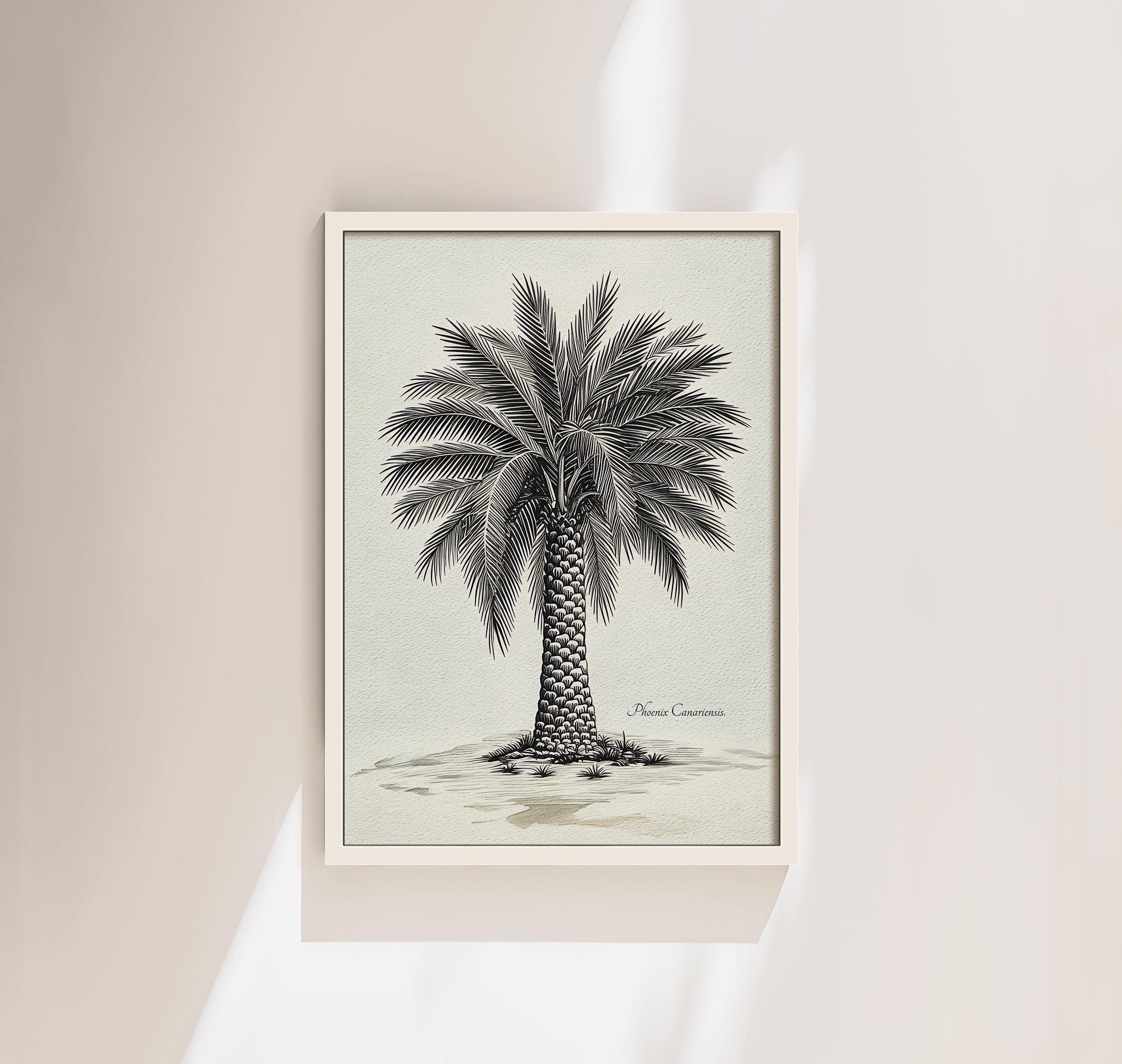 This artwork presents a botanical illustration of Phoenix canariensis, the Canary Island date palm, one of the most representative native species of the Canary Islands. Its structured trunk and wide crown of arching fronds create a distinctive silhouette deeply connected to the island landscape.